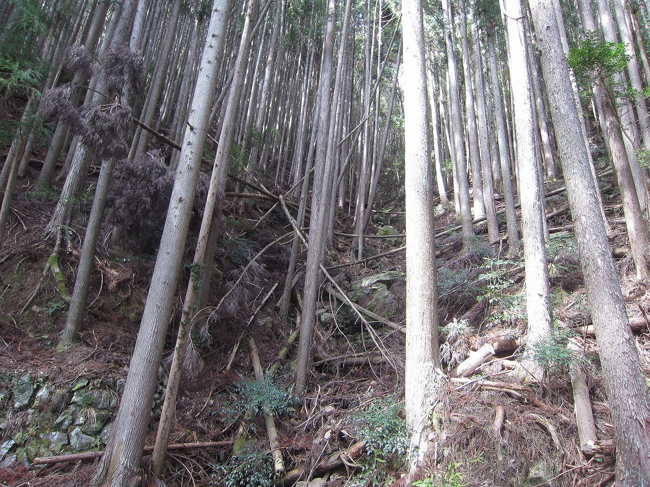 山中は何年も前に強風と大雨になぎ倒された木々がそのままになっていました。