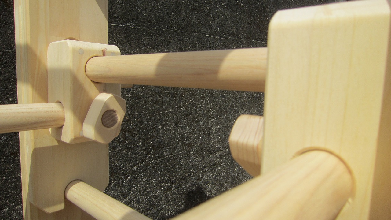 梁の長さが2200mmあり、1820mmの鉄棒丸棒が届かないので、側面鉄棒は特注仕様となっています。鉄棒有効幅は2段階から選択可能です。
