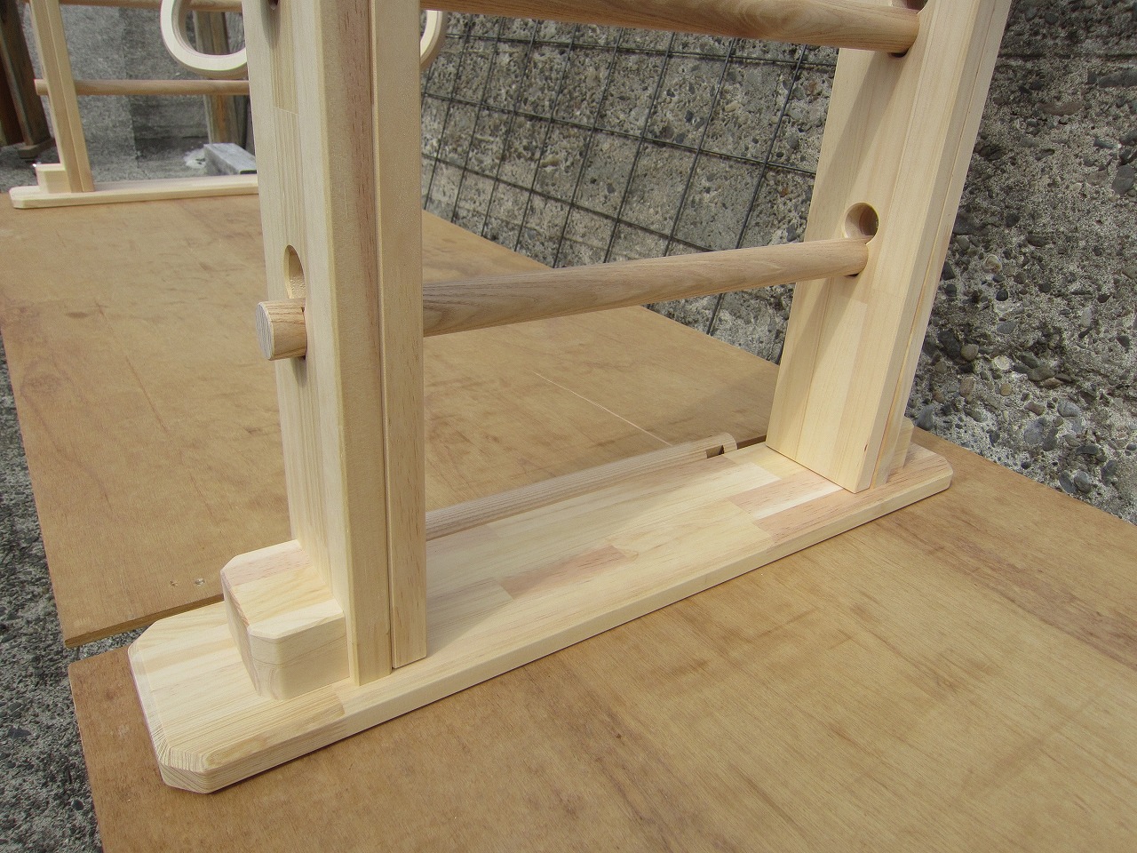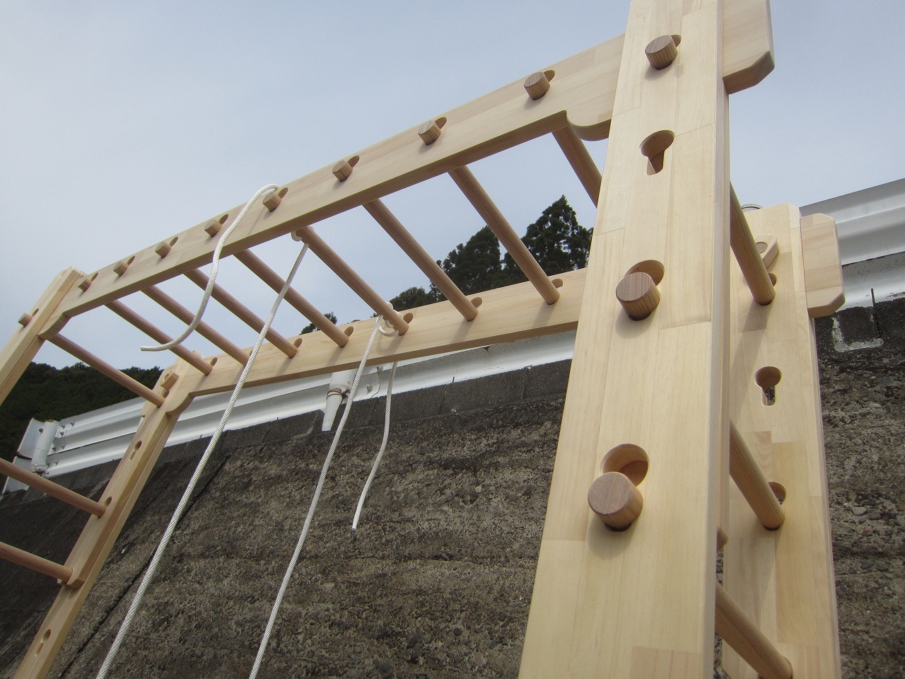 オーダーうんていクラシック特注に側面鉄棒、のぼり棒、すべり台を装備し、すべり台のみ蜜蠟WAXで仕上げています。
