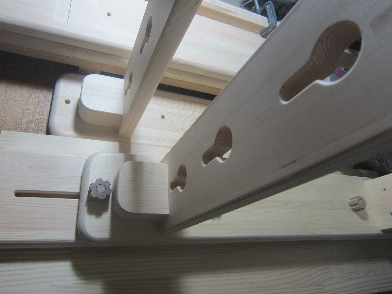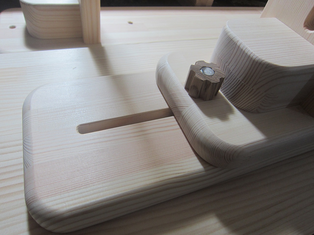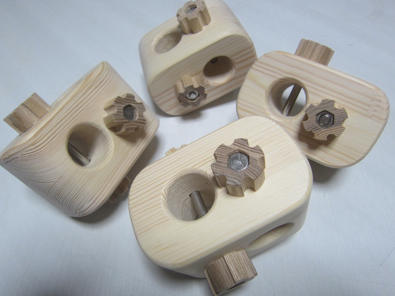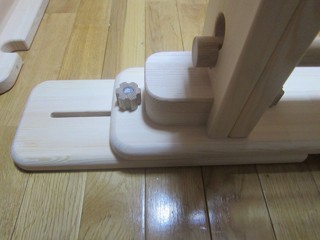 (回答)加工精度は極限まで上げていますが、丸棒は無垢材の性質上、湿度や反りなどできつくなったり緩くなったりしますので、どの位置どの方向にも全く同じ力でいつでも組み込みが出来るわけではありません。よって丸棒の方向を変えるか、一番きつかった物との交換が良い解決策となります。