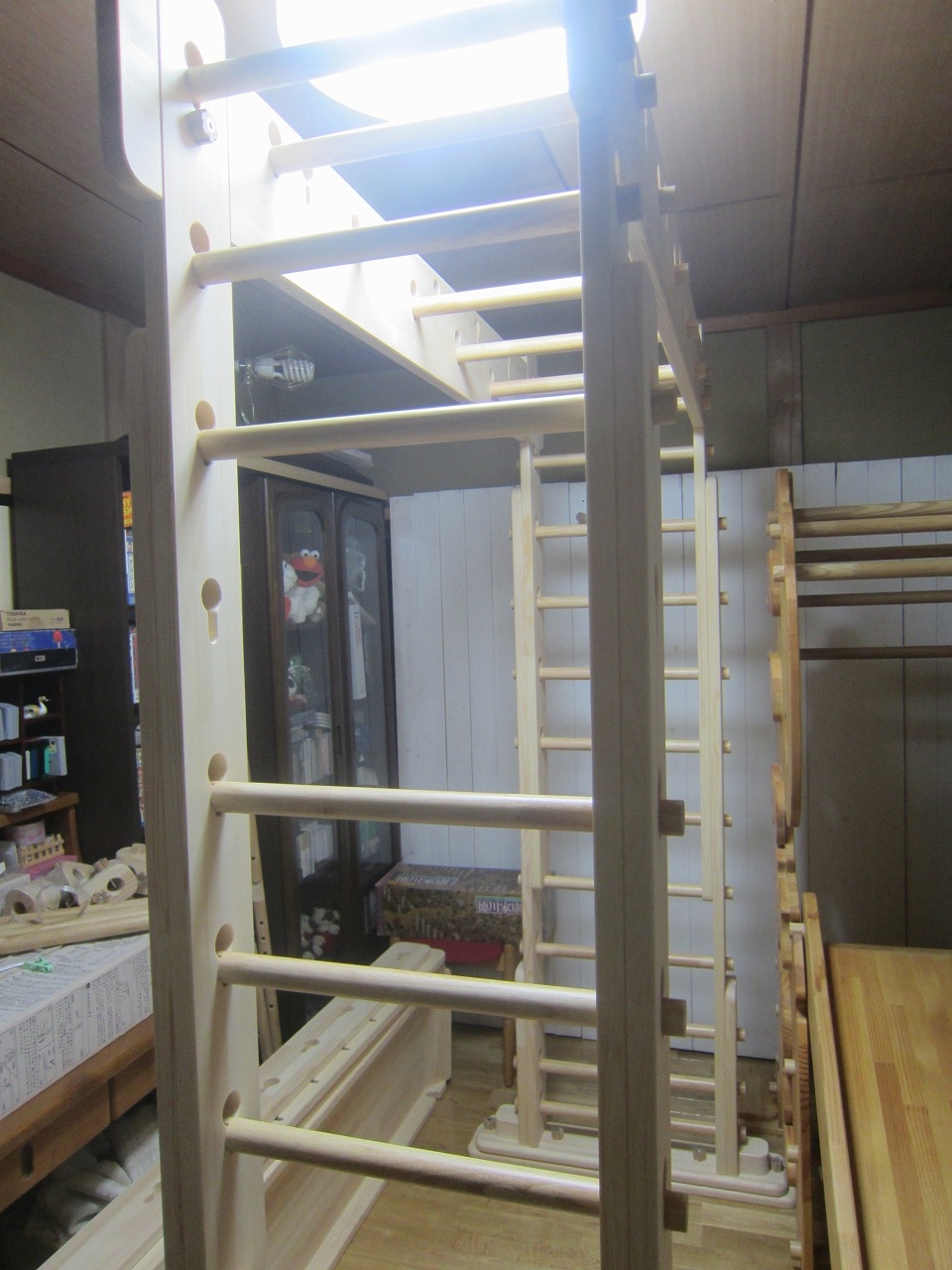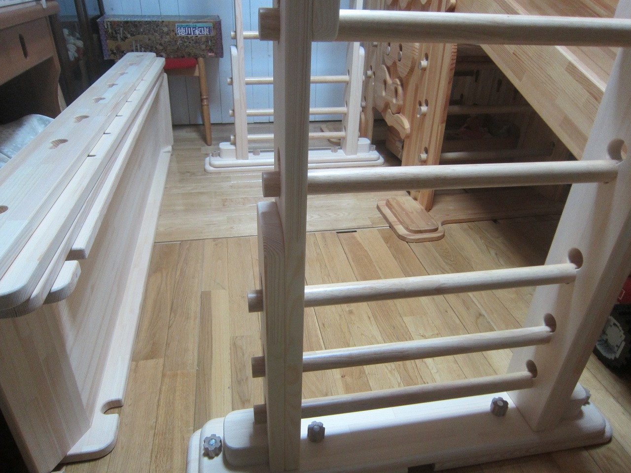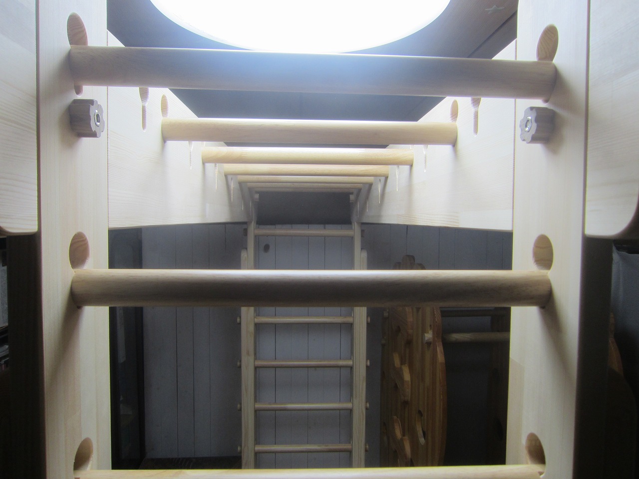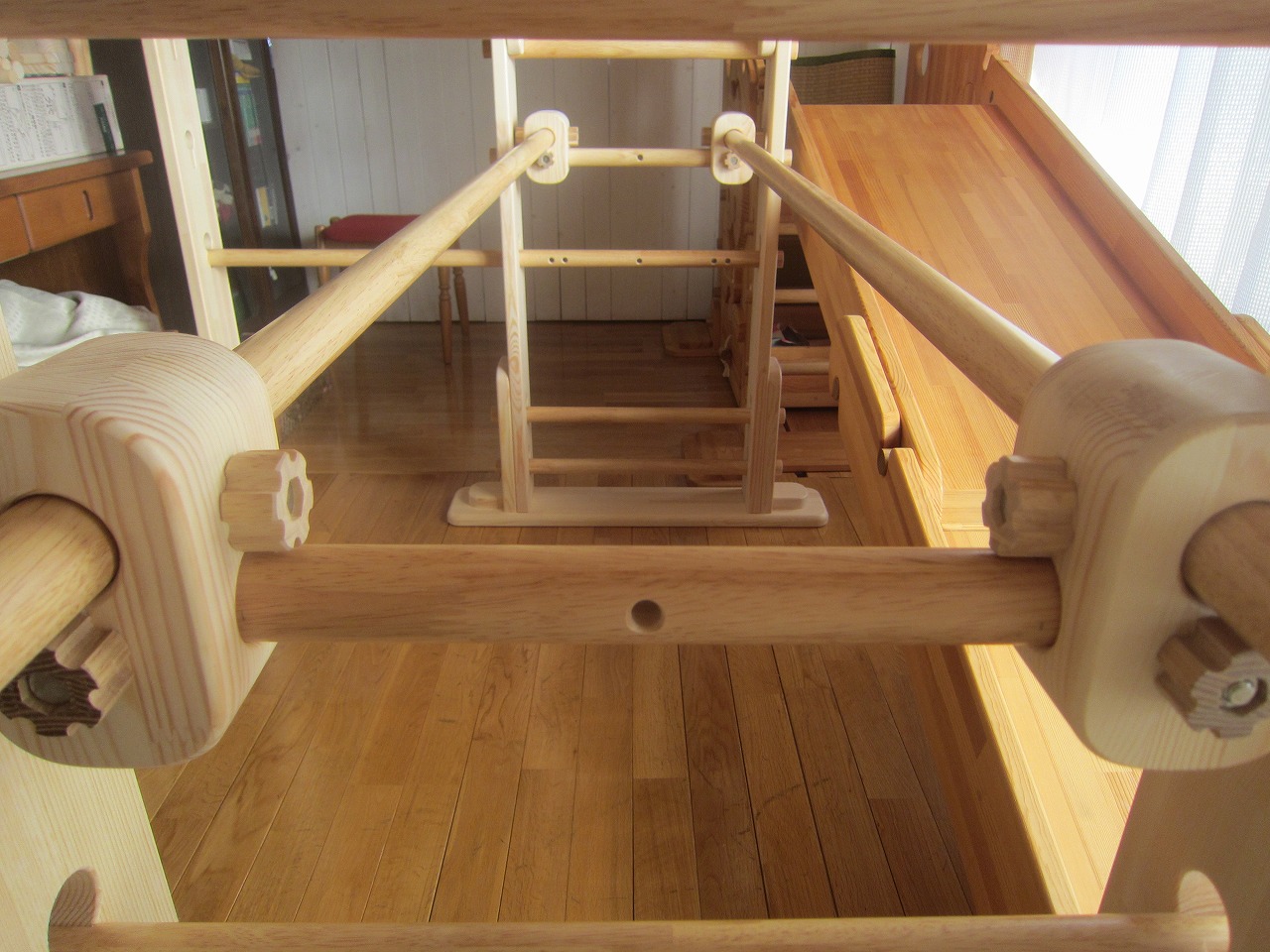 (回答)強度差は骨格の太さと柱と梁の接合方式の違いで、オーダーうんていが優れます。また、室内据え置き型うんていはどのような形でもある程度のゆれは発生し、そのゆれ(しなり)がないと荷重が横方向ばかりにかかってしまい転倒しやすくなります。握り棒は固定式のりとるとっぽ以外はサイズ交換を可能にするためすべて脱着式となり、上に押し上げれば外れます。