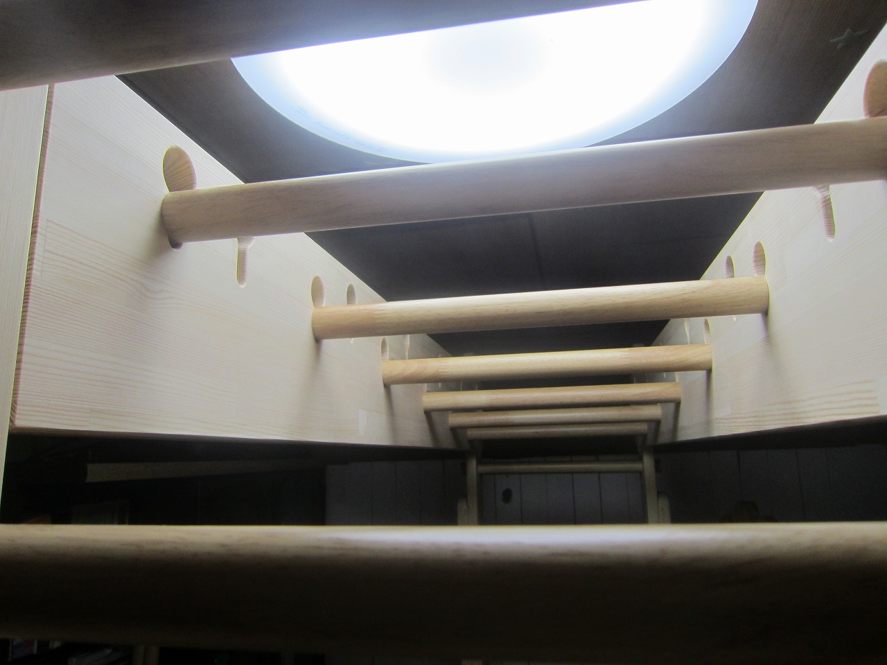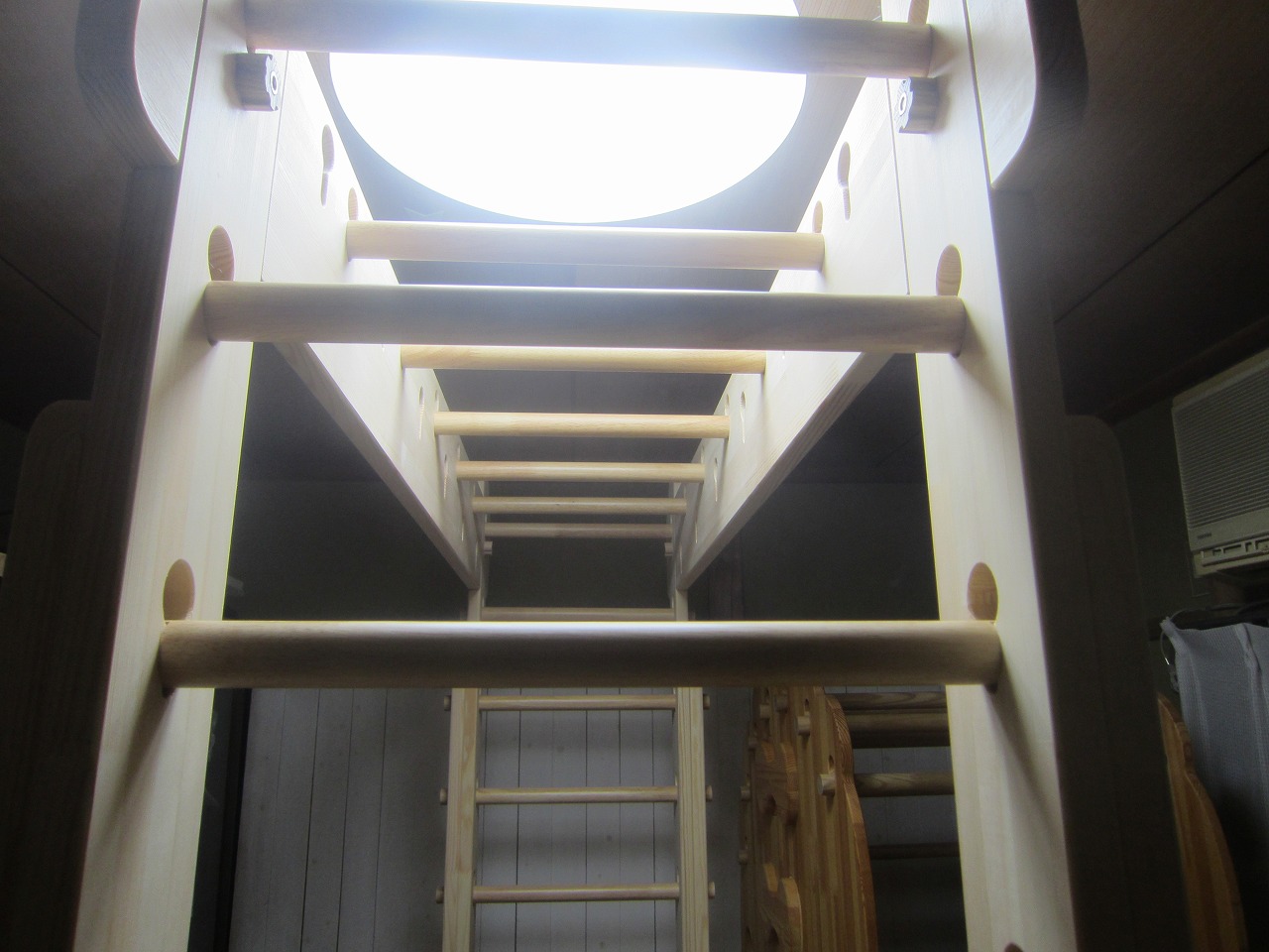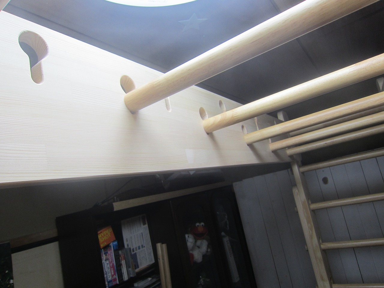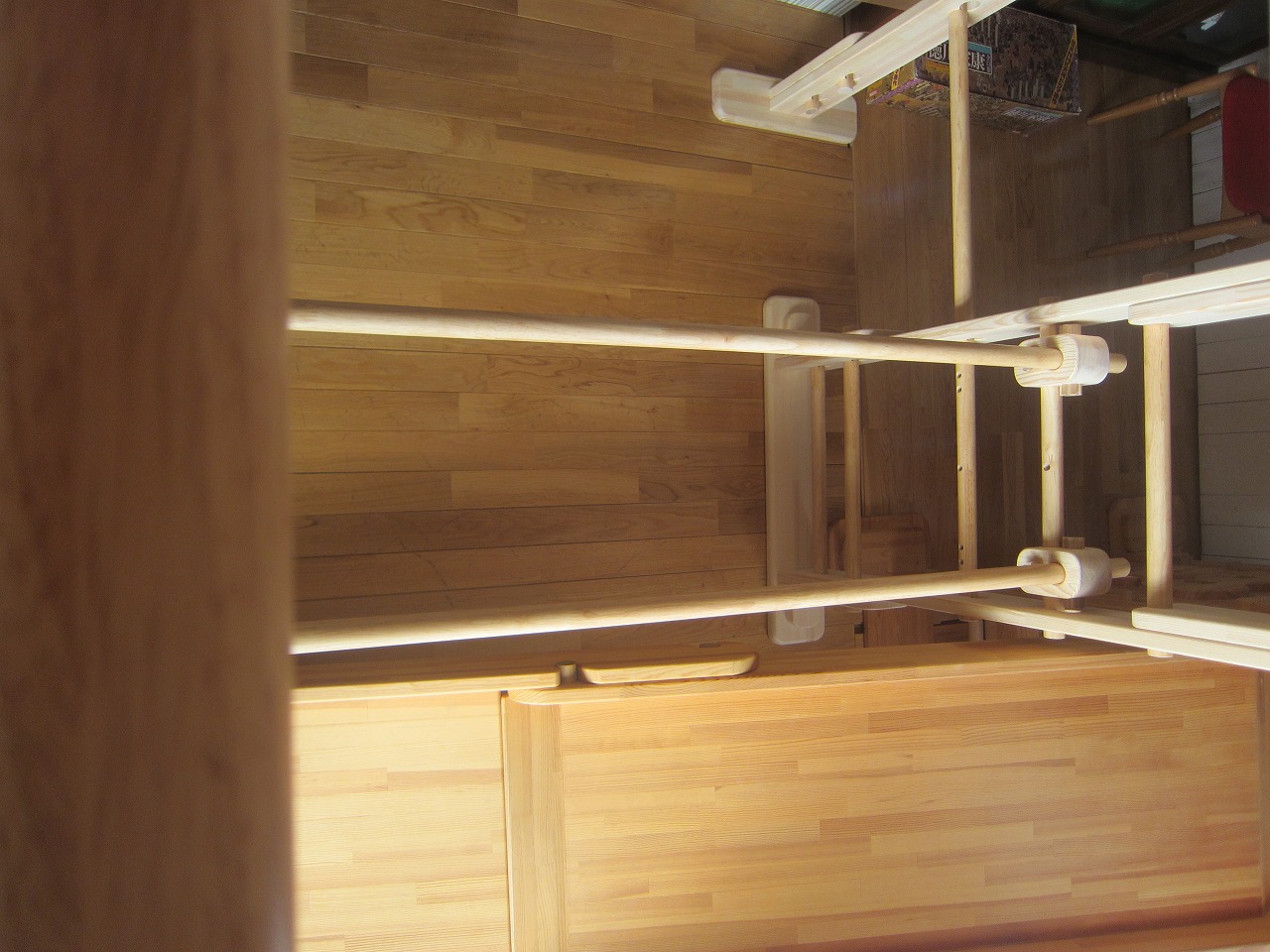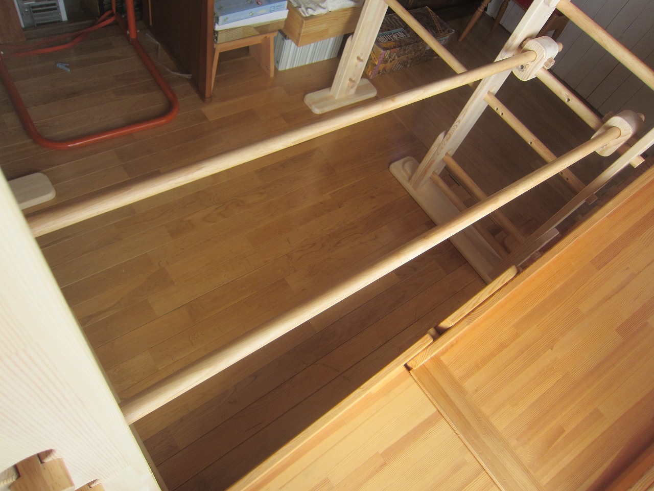 (回答)強度差は骨格の太さと柱と梁の接合方式の違いで、オーダーうんていが優れます。また、室内据え置き型うんていはどのような形でもある程度のゆれは発生し、そのゆれ(しなり)がないと荷重が横方向ばかりにかかってしまい転倒しやすくなります。握り棒は固定式のりとるとっぽ以外はサイズ交換を可能にするためすべて脱着式となり、上に押し上げれば外れます。