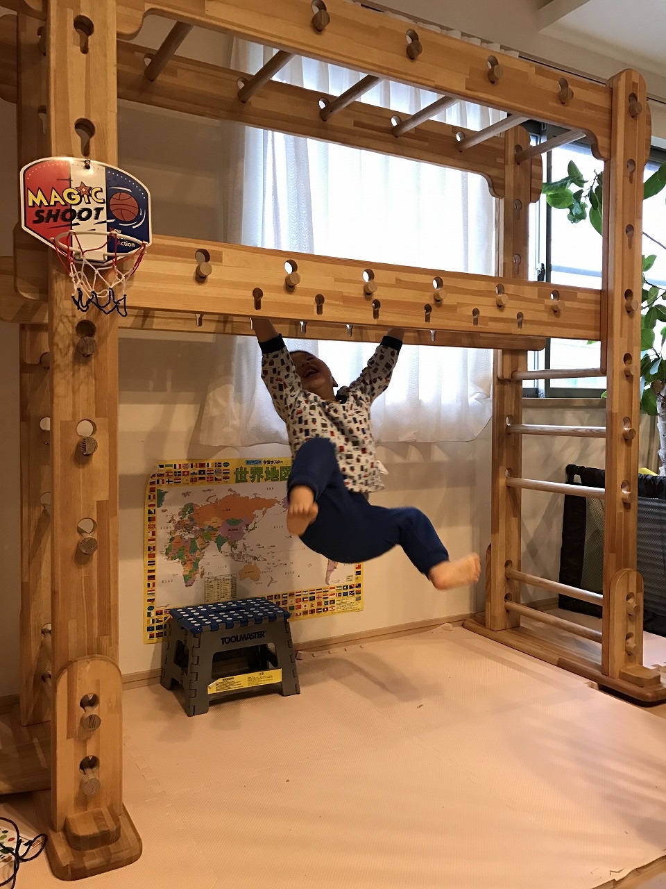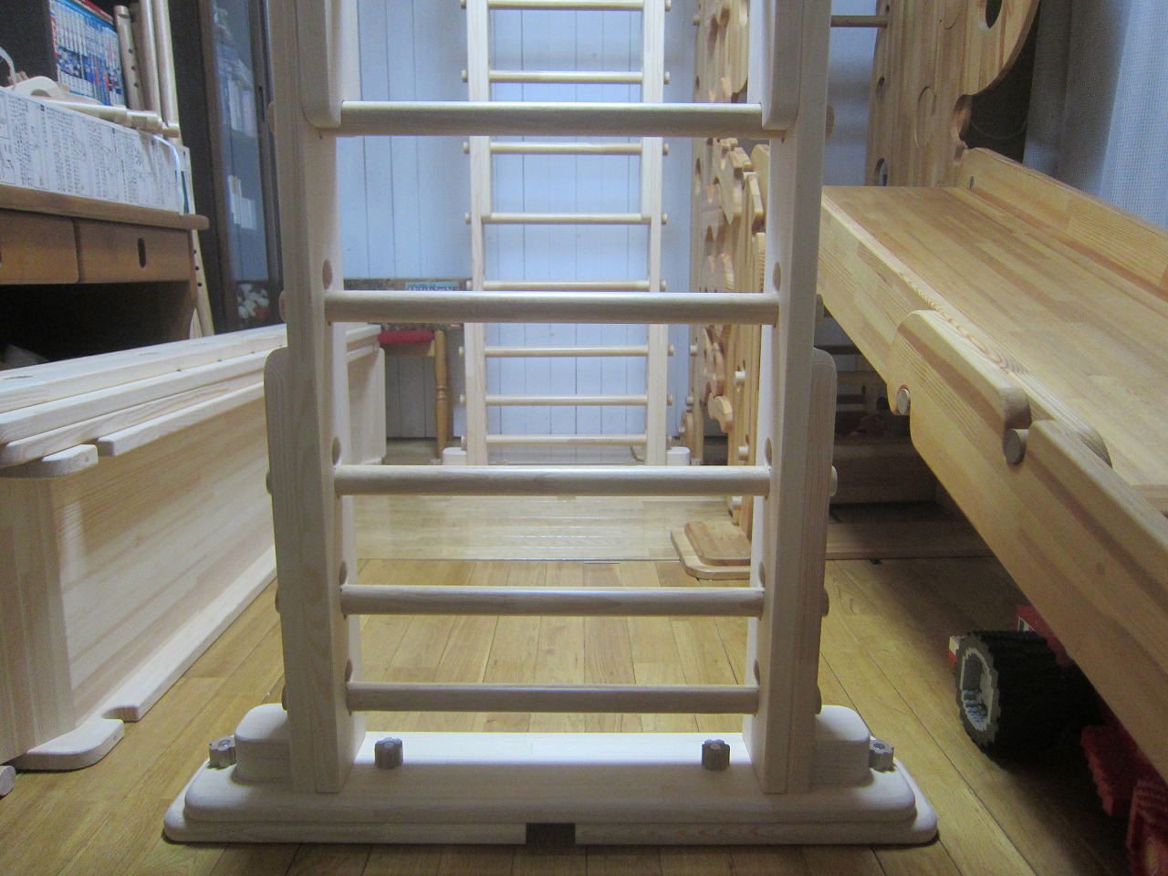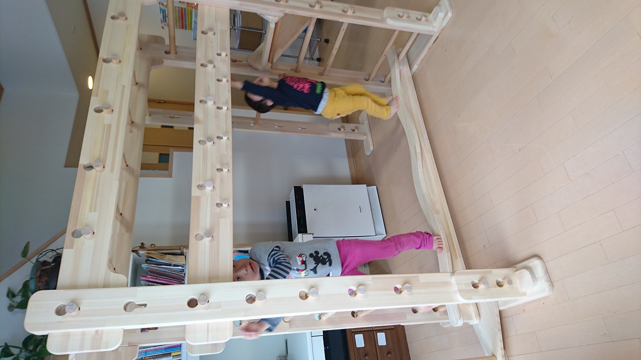 また、本機はトレーニングマシンではありません。体重は70kgでも全く問題ございませんが、うんてい初心者(全くできない)方が重い体を左右に揺さぶりながらのプレイは耐久性に大きく影響を与えますので、せめて前に進める程度には公園などで練習してから使ってください。