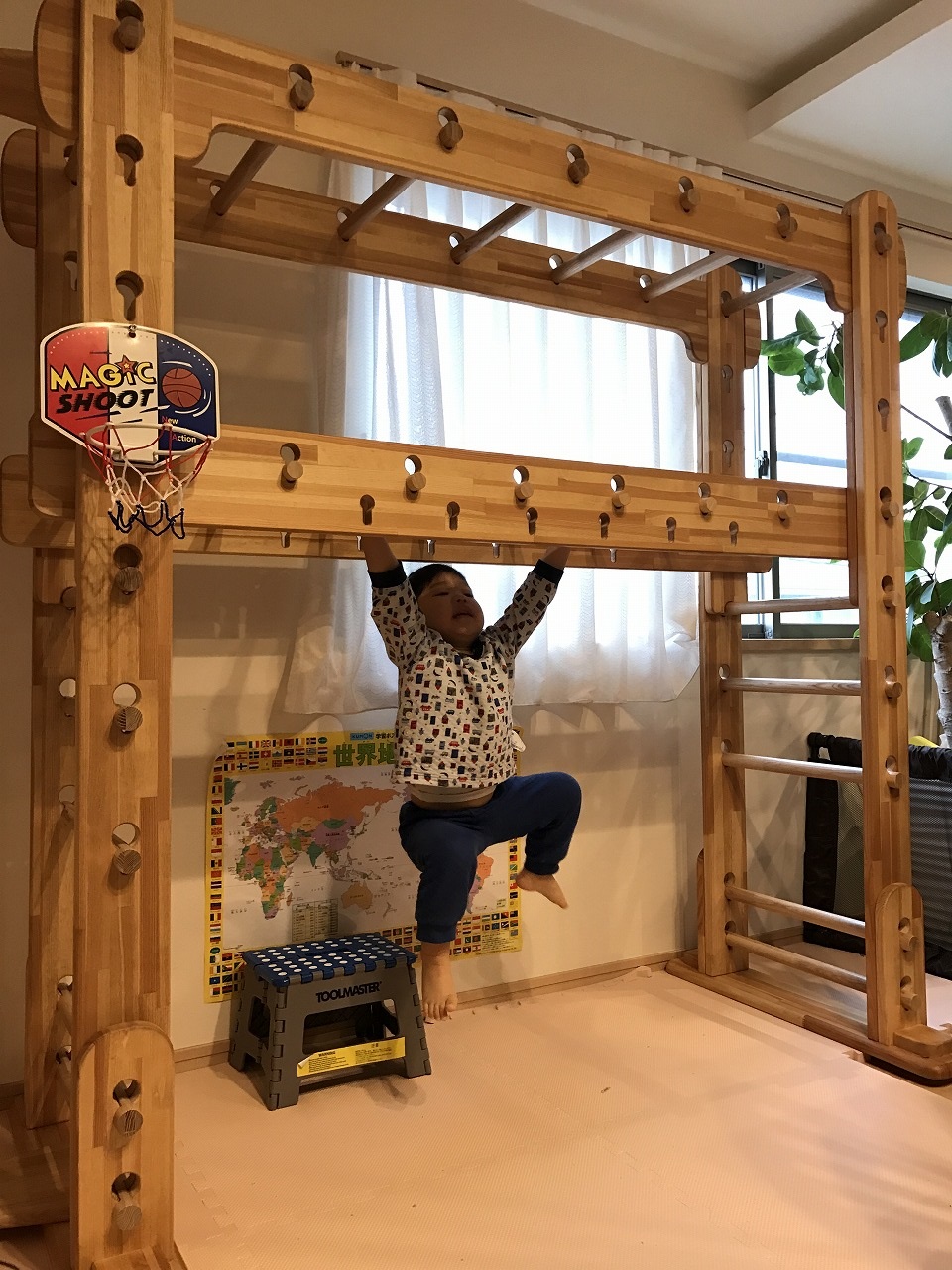 (回答)小学中学年ぐらいまで使うならモンキーフリップ1。それ以上は一回り骨格の大きいオーダーうんてい、もしくはブリッジうんていがおすすめです。