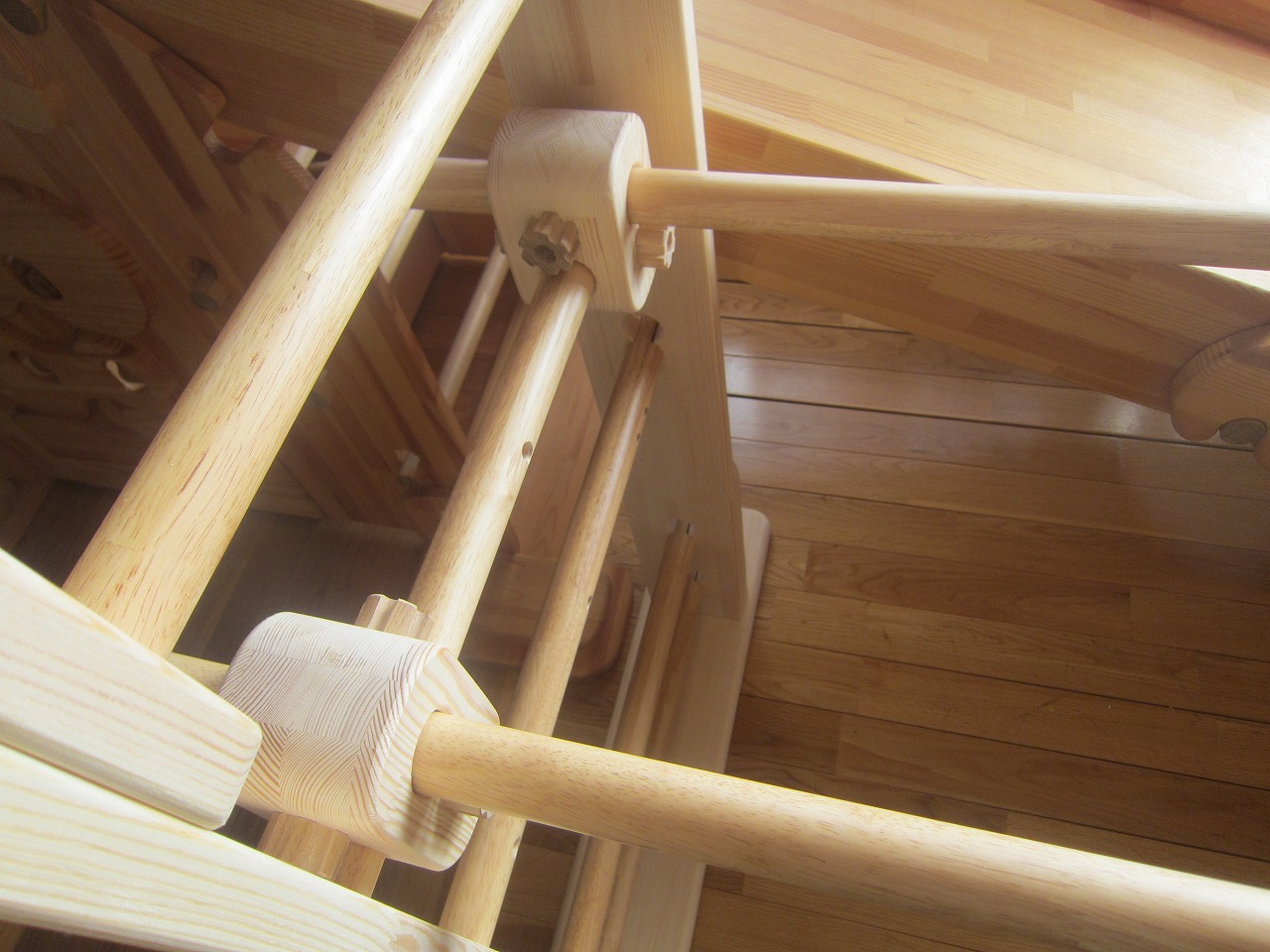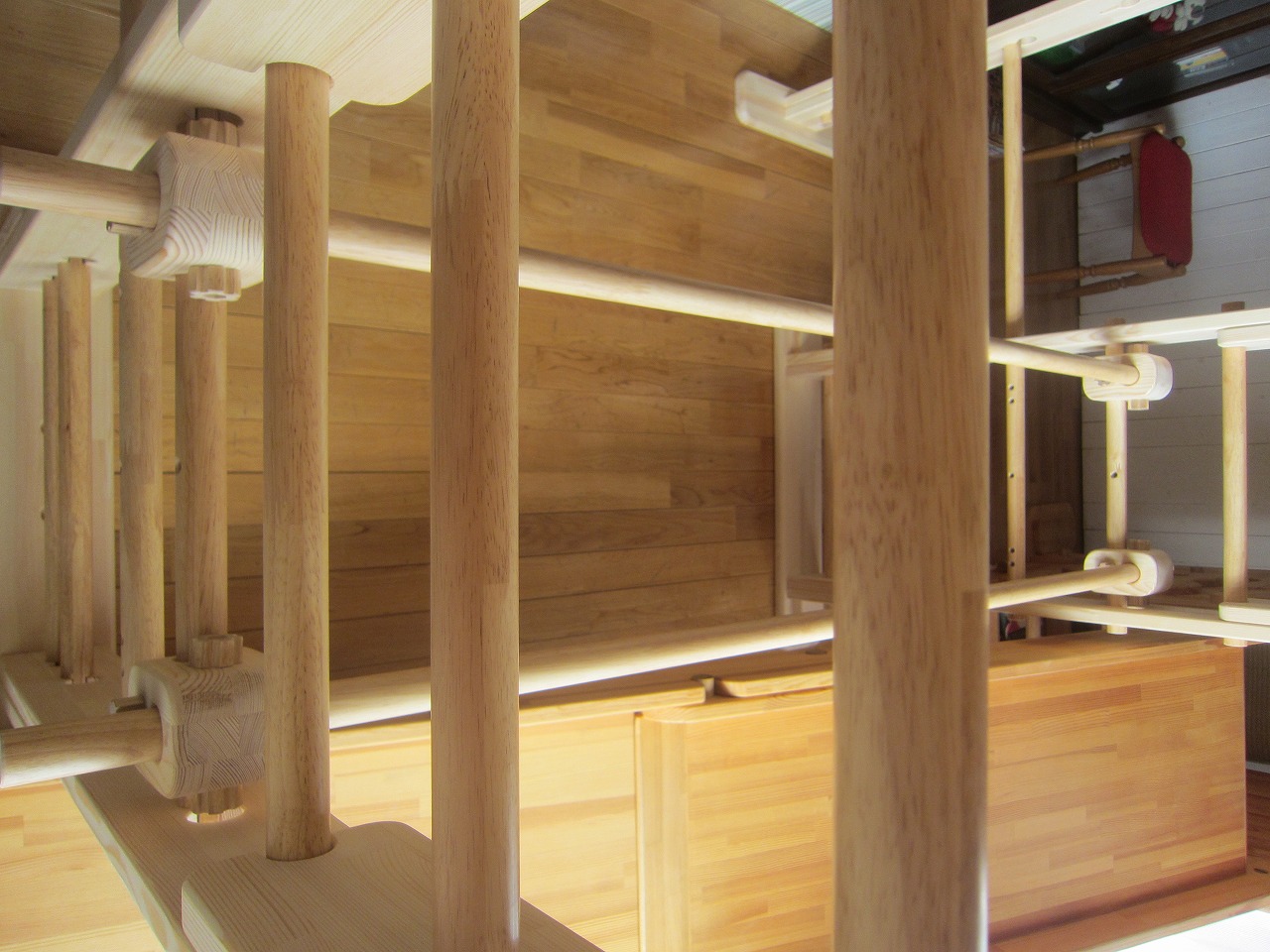 (回答)強度差は骨格の太さと柱と梁の接合方式の違いで、オーダーうんていが優れます。また、室内据え置き型うんていはどのような形でもある程度のゆれは発生し、そのゆれ(しなり)がないと荷重が横方向ばかりにかかってしまい転倒しやすくなります。握り棒は固定式のりとるとっぽ以外はサイズ交換を可能にするためすべて脱着式となり、上に押し上げれば外れます。