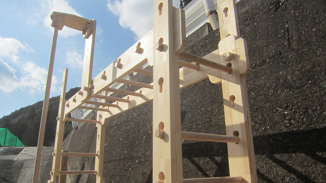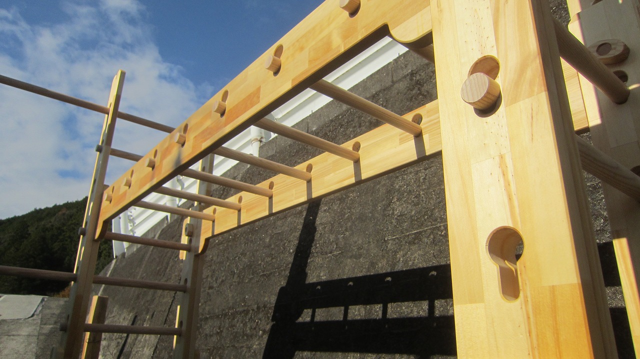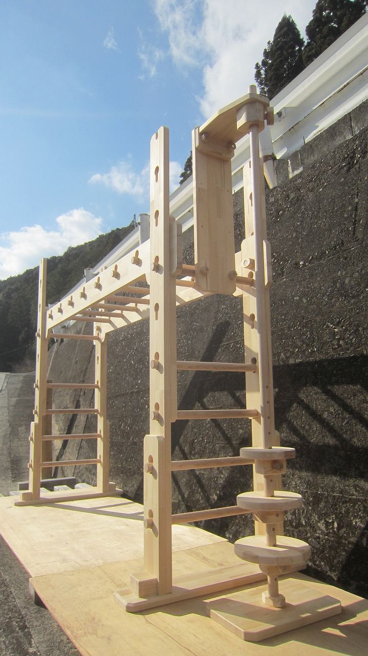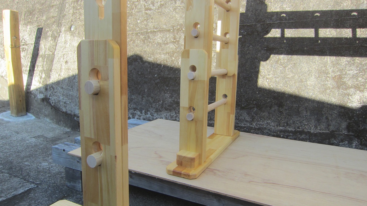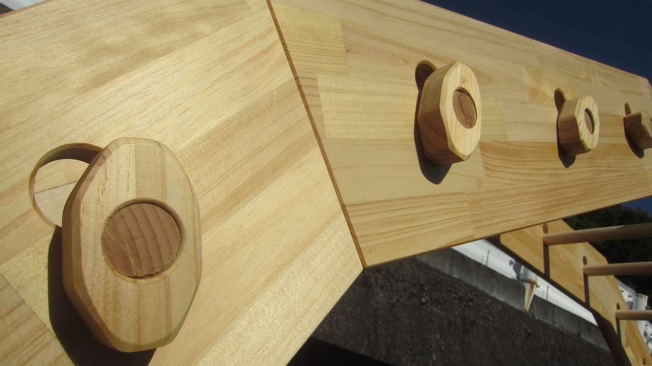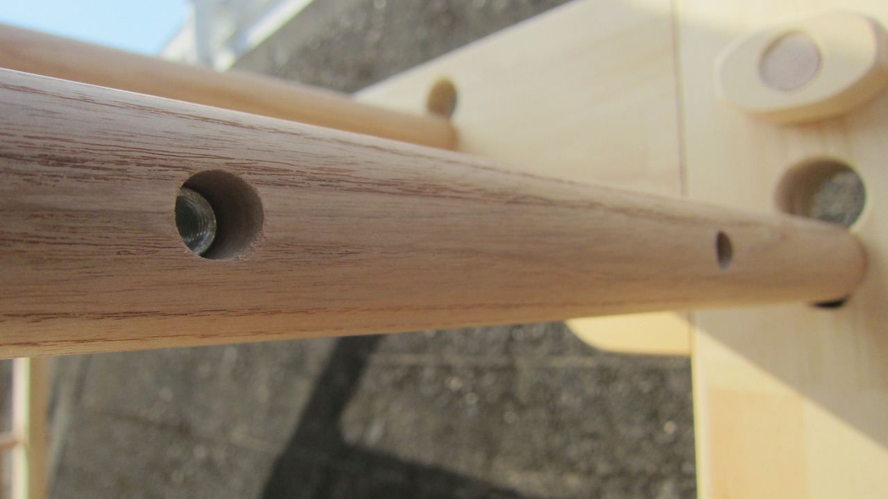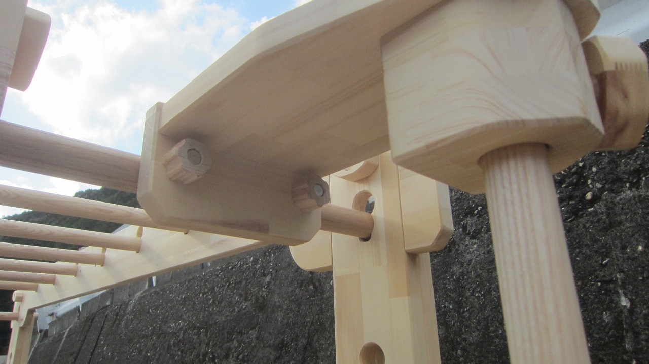 (組み立て案内)①土台用丸棒を使い、土台に柱を立てる。②任意の高さに柱用丸棒を取り付け、梁を組み込む。③木製ナットを締め付け、にぎり棒を取り付けて完成。※柱の丸棒穴に付いたへこみ跡を再利用すると組みやすいです。