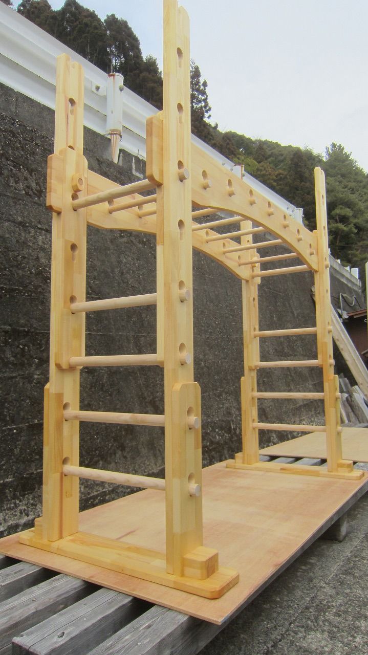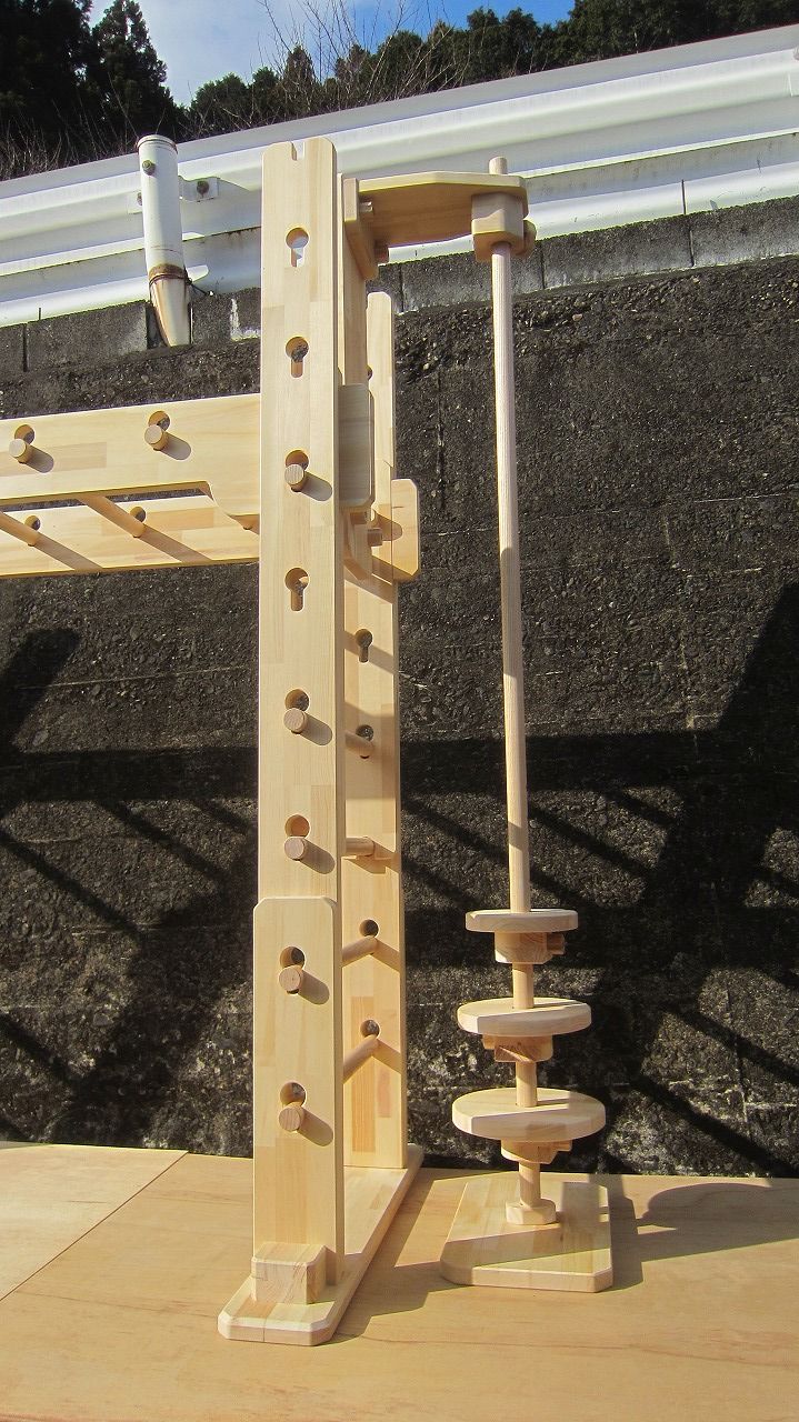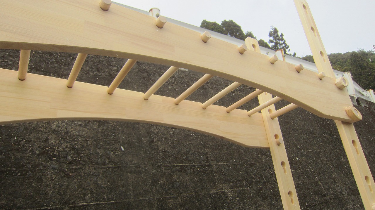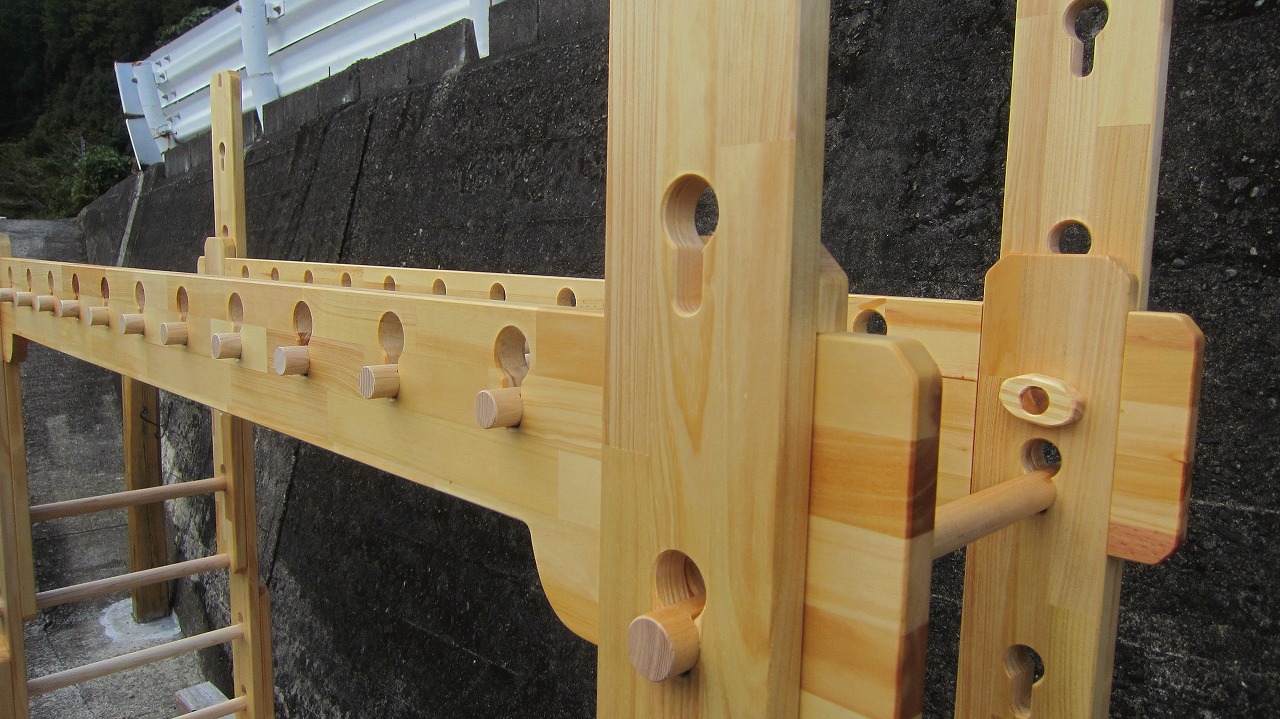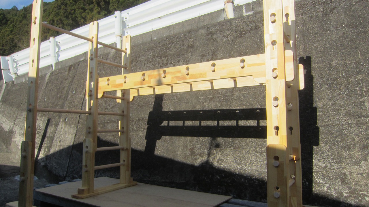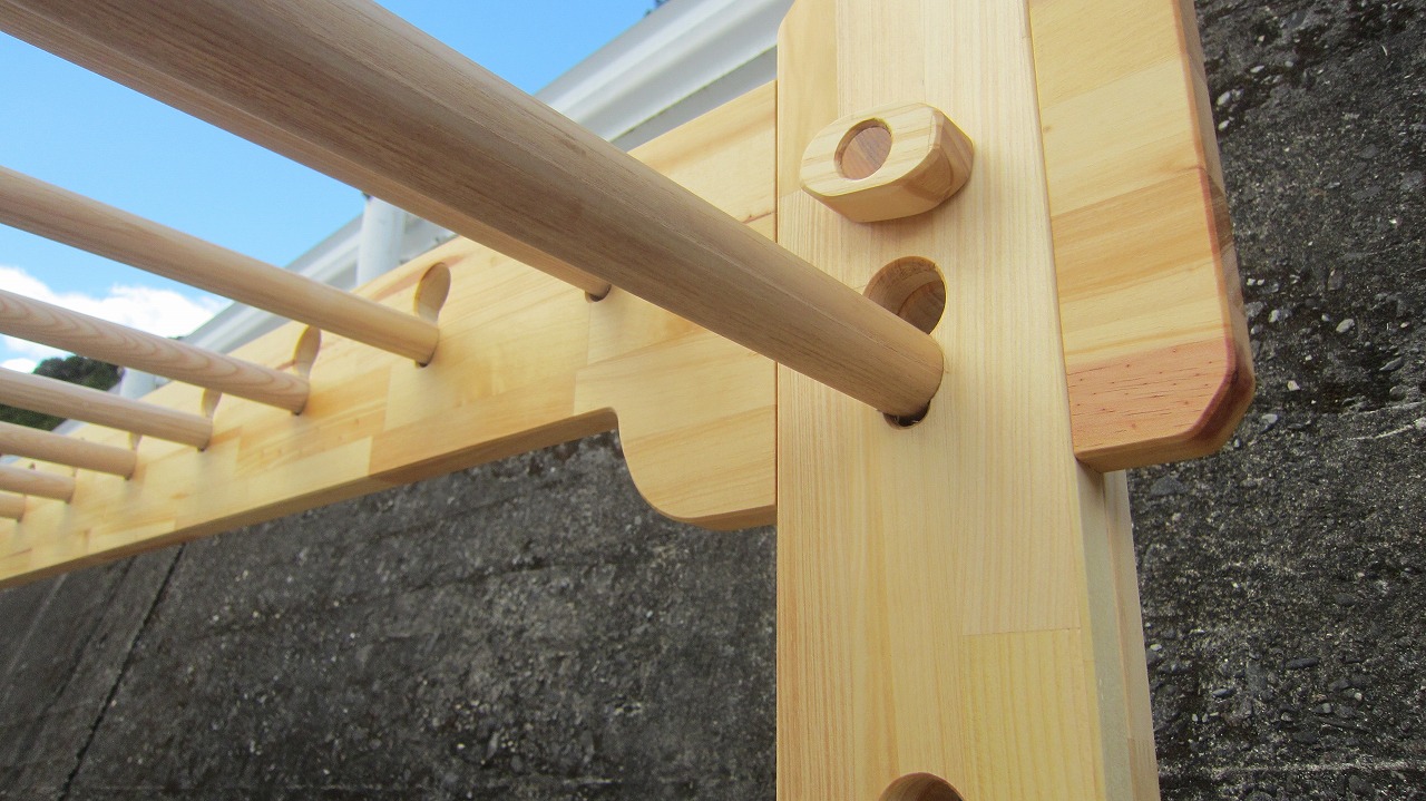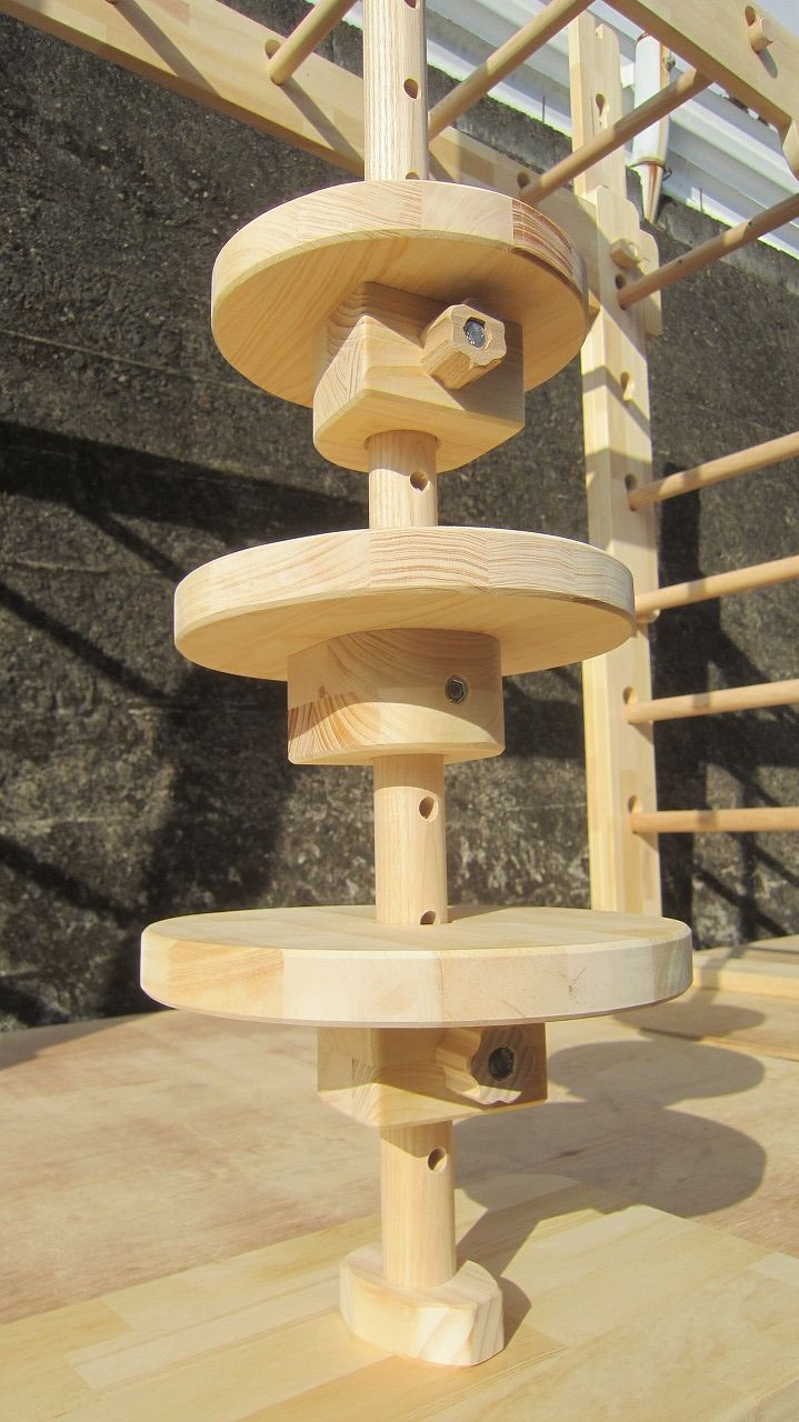 (組み立て案内)①土台用丸棒を使い、土台に柱を立てる。②任意の高さに柱用丸棒を取り付け、梁を組み込む。③木製ナットを締め付け、にぎり棒を取り付けて完成。※柱の丸棒穴に付いたへこみ跡を再利用すると組みやすいです。