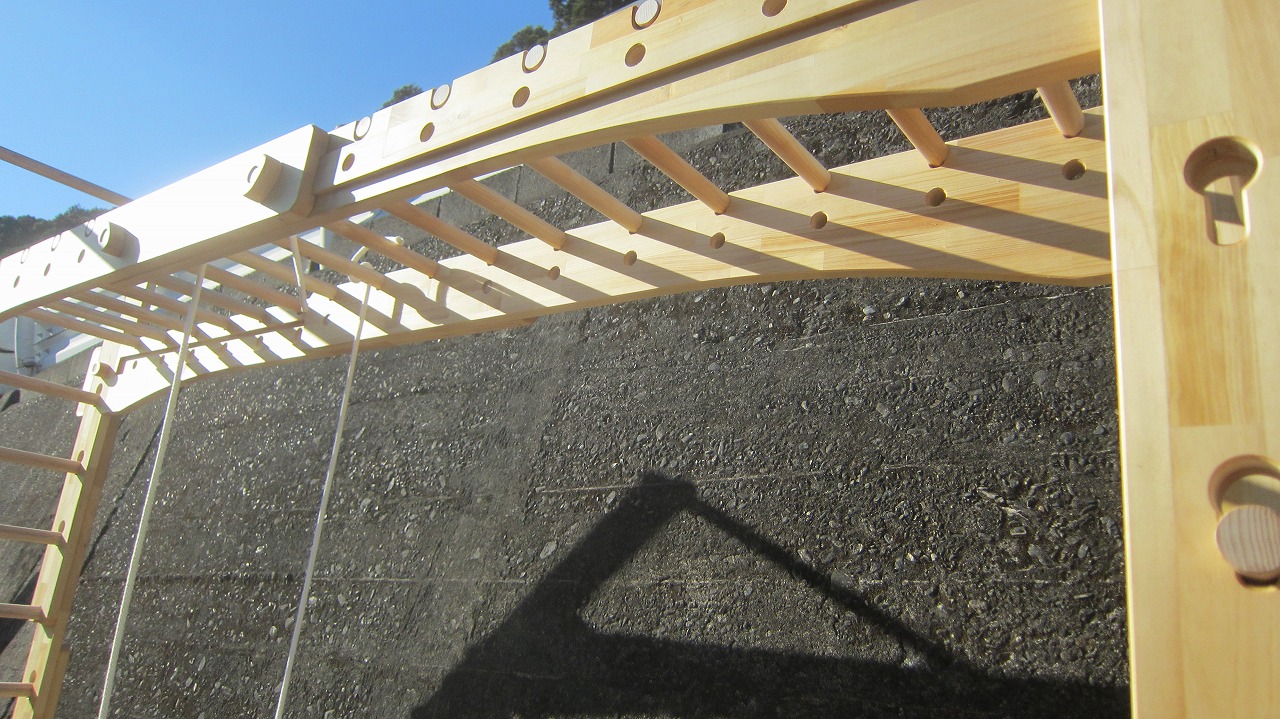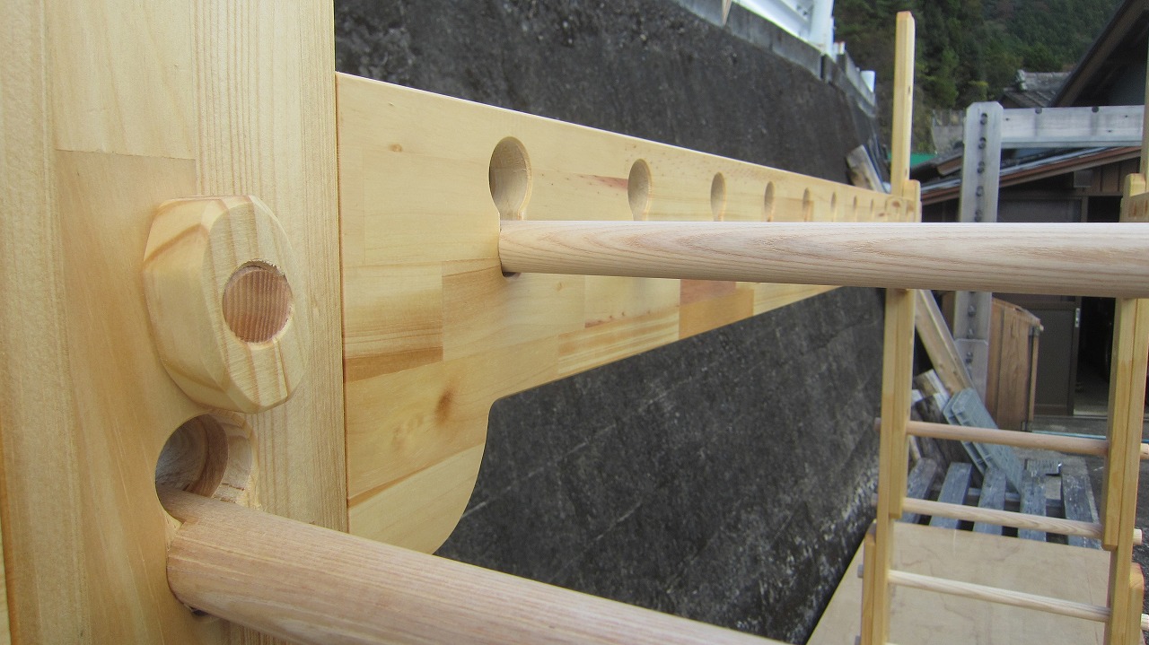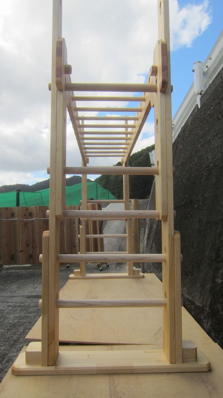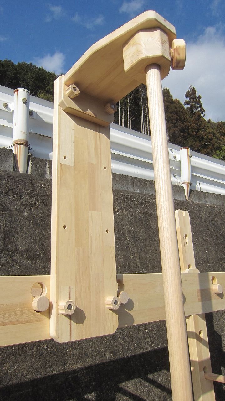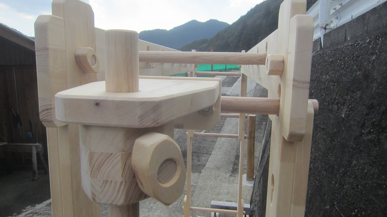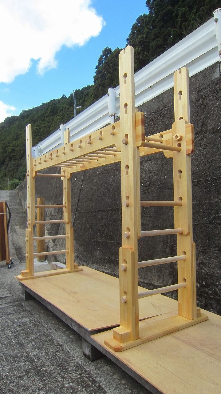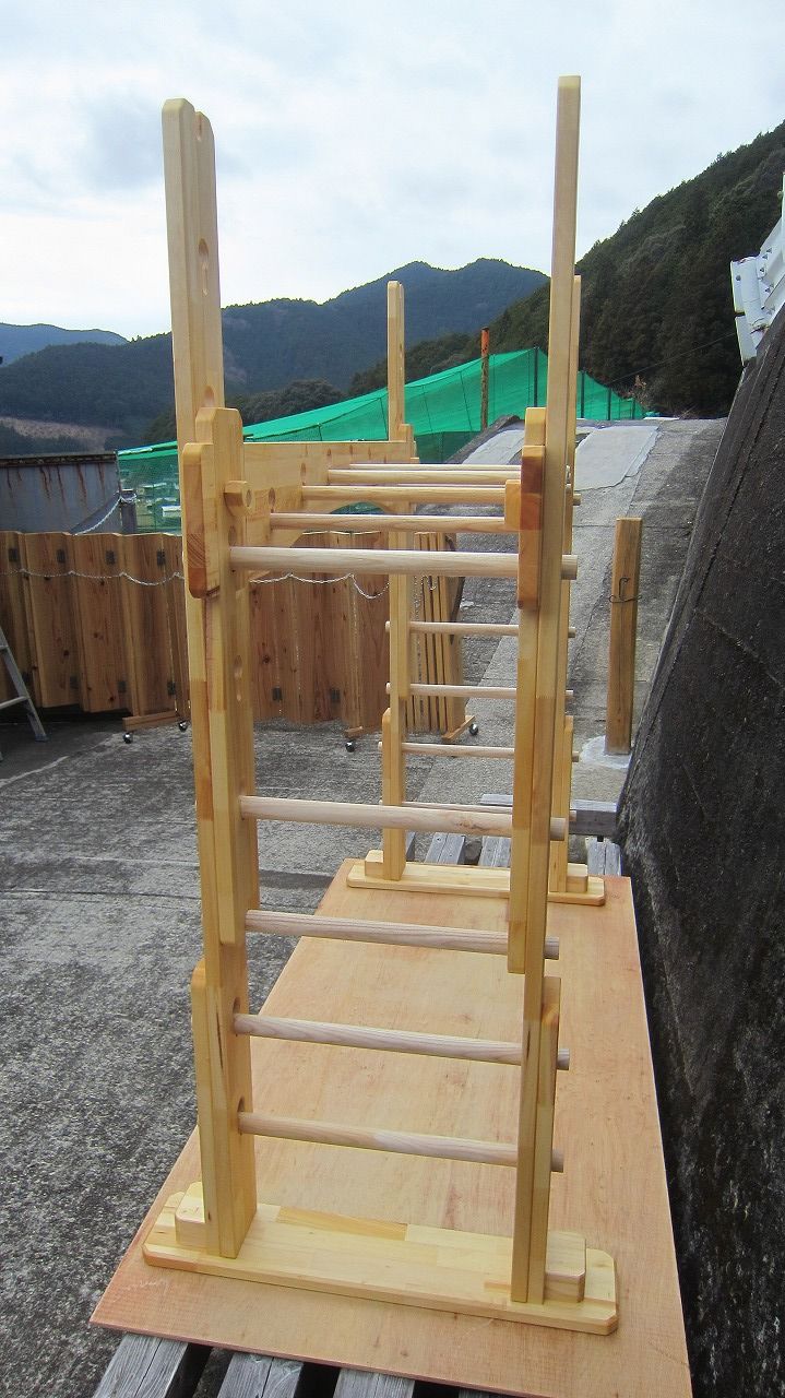 (組み立て案内)①土台用丸棒を使い、土台に柱を立てる。②任意の高さに柱用丸棒を取り付け、梁を組み込む。③木製ナットを締め付け、にぎり棒を取り付けて完成。※柱の丸棒穴に付いたへこみ跡を再利用すると組みやすいです。