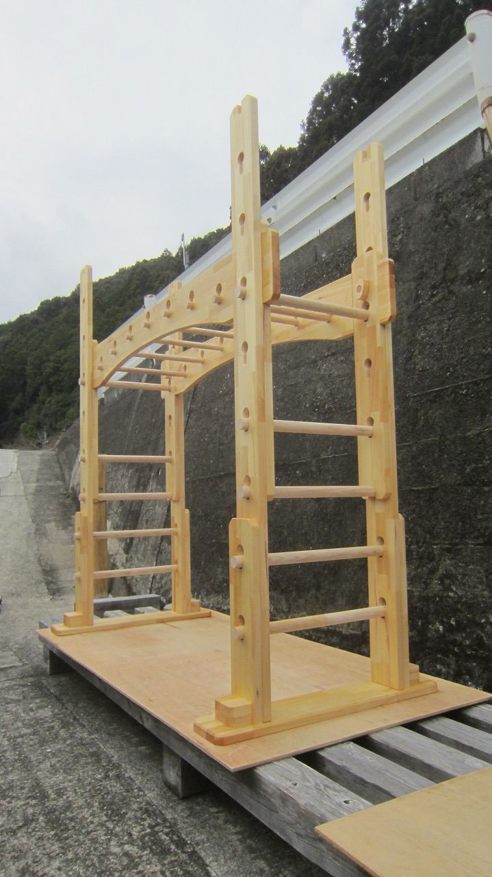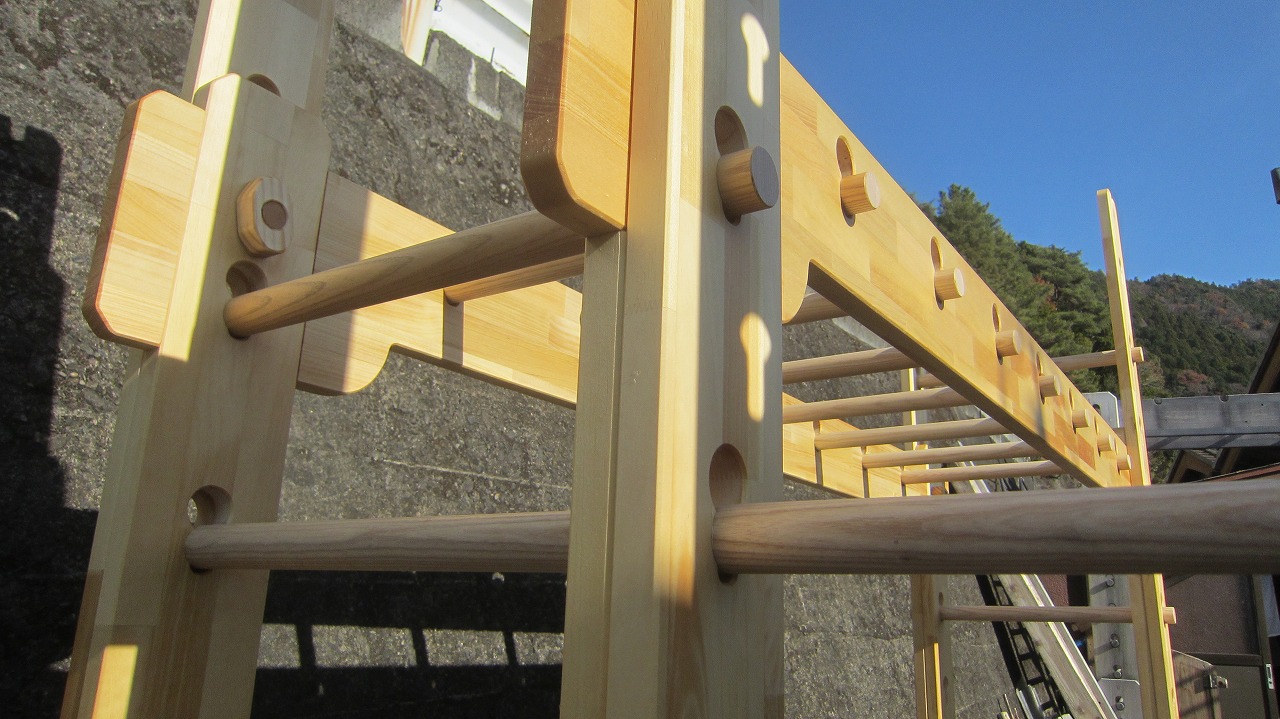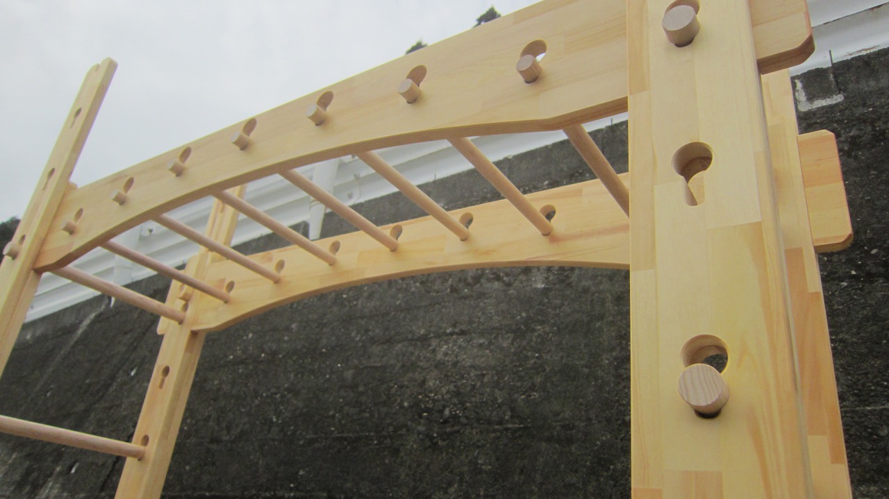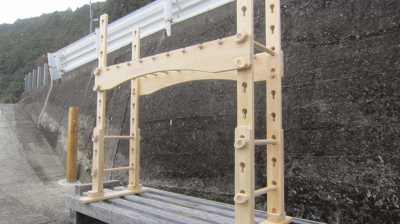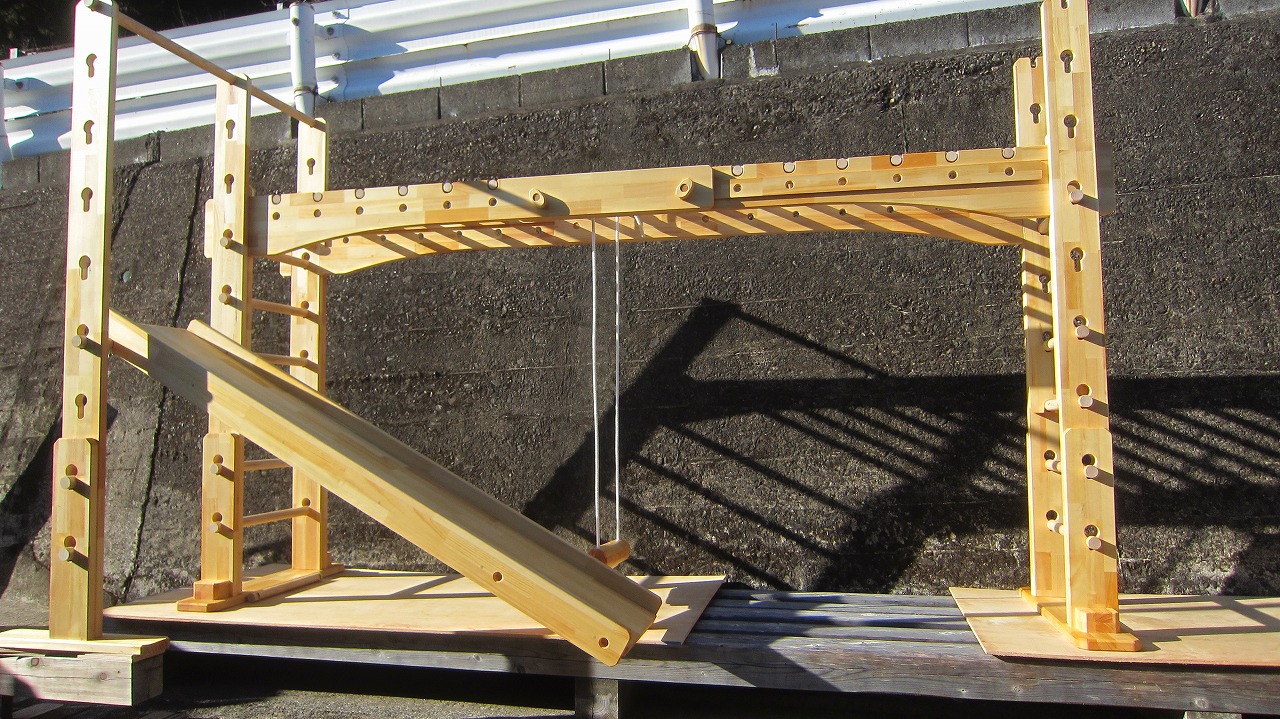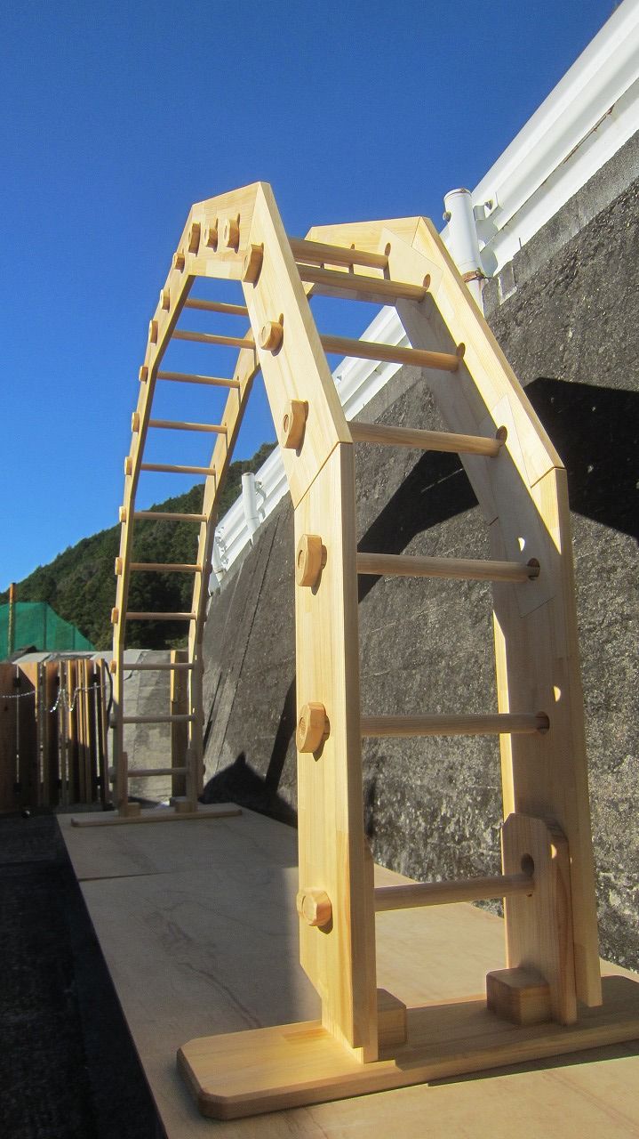 (組み立て案内)①土台用丸棒を使い、土台に柱を立てる。②任意の高さに柱用丸棒を取り付け、梁を組み込む。③木製ナットを締め付け、にぎり棒を取り付けて完成。※柱の丸棒穴に付いたへこみ跡を再利用すると組みやすいです。