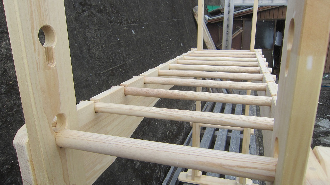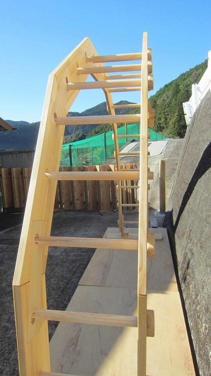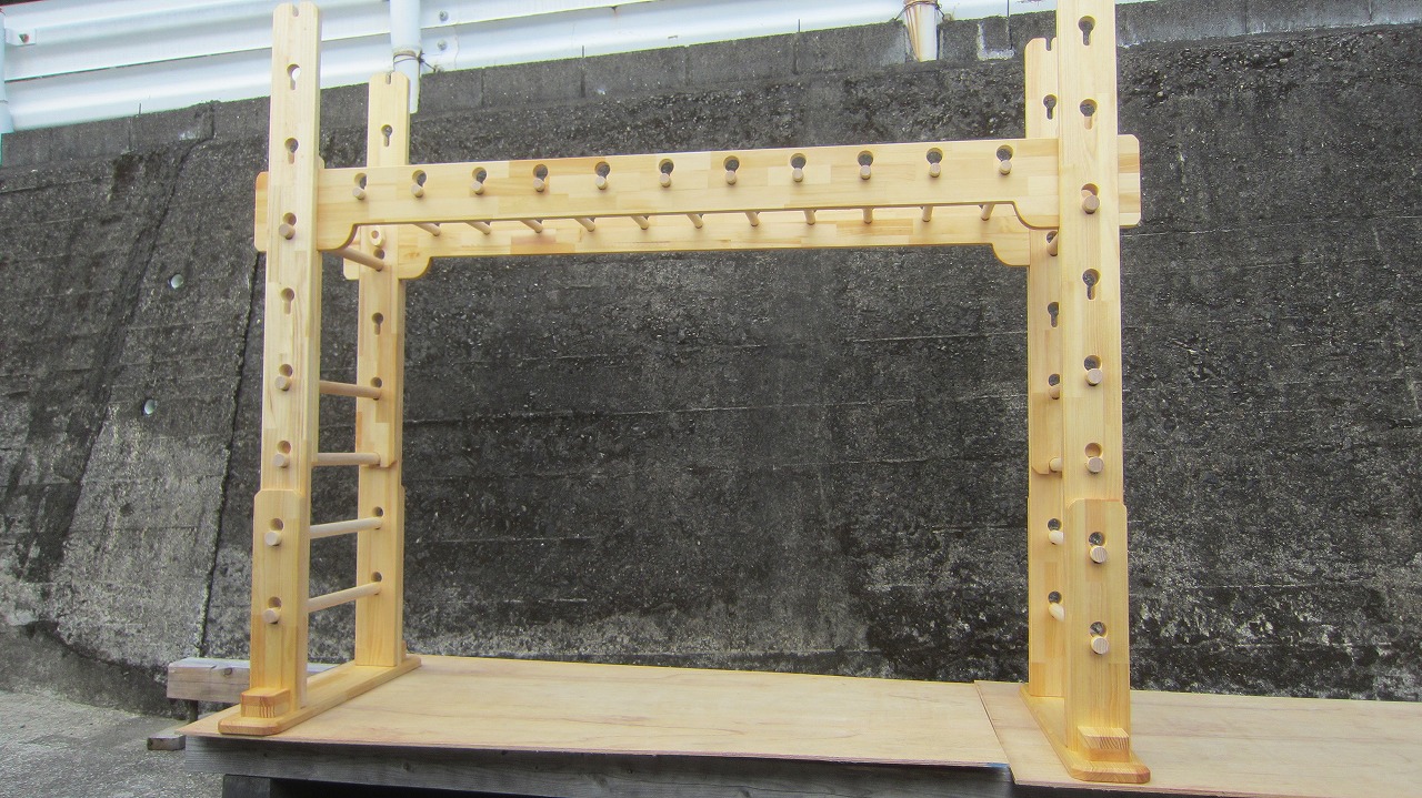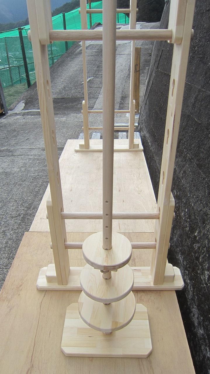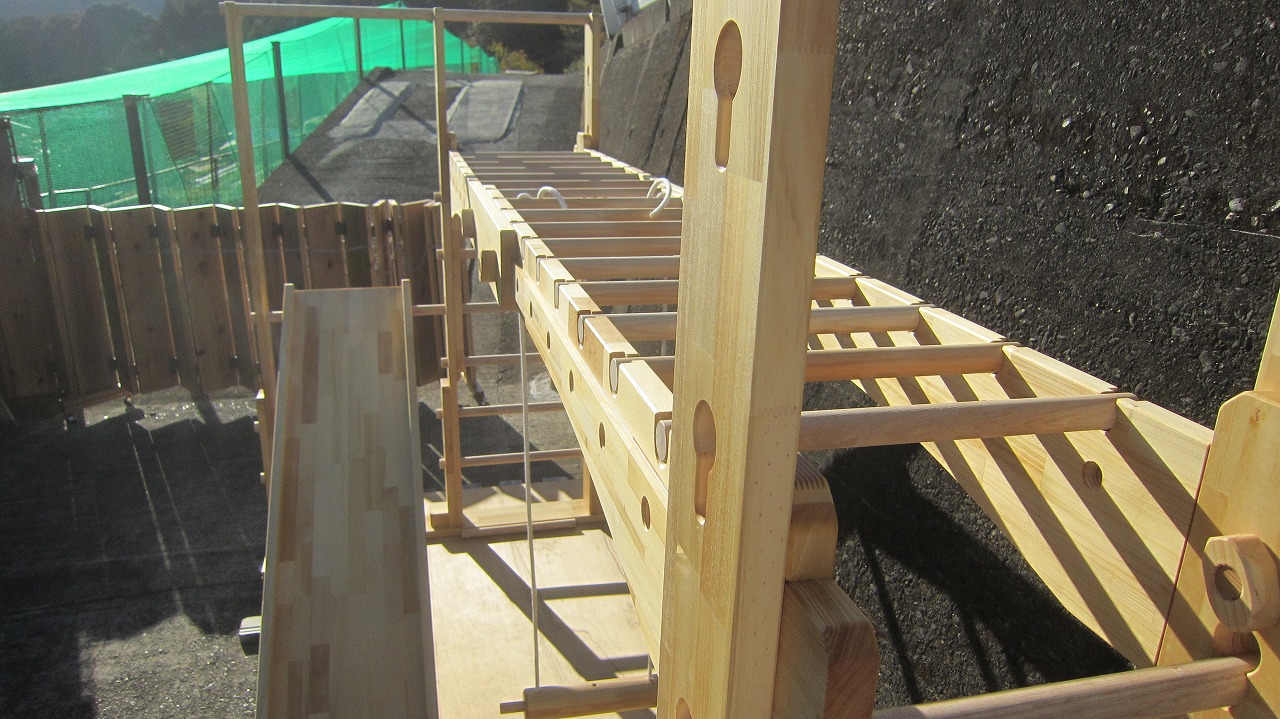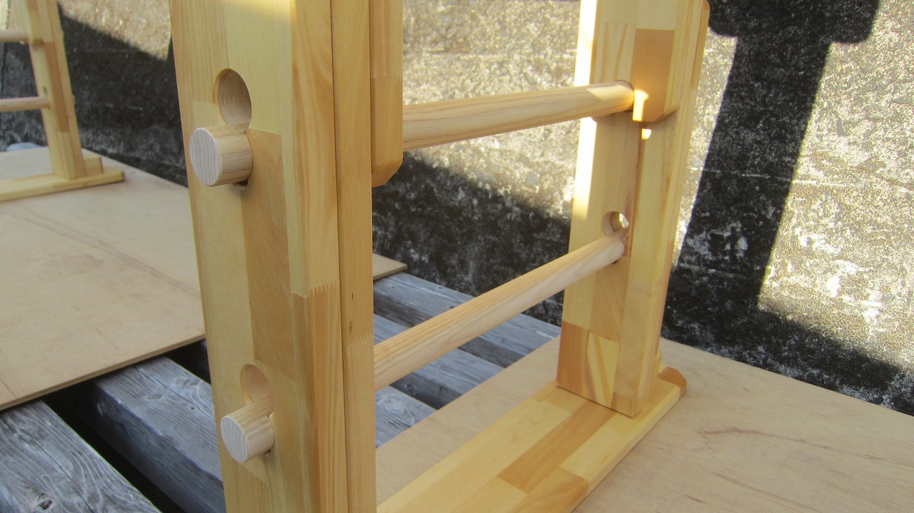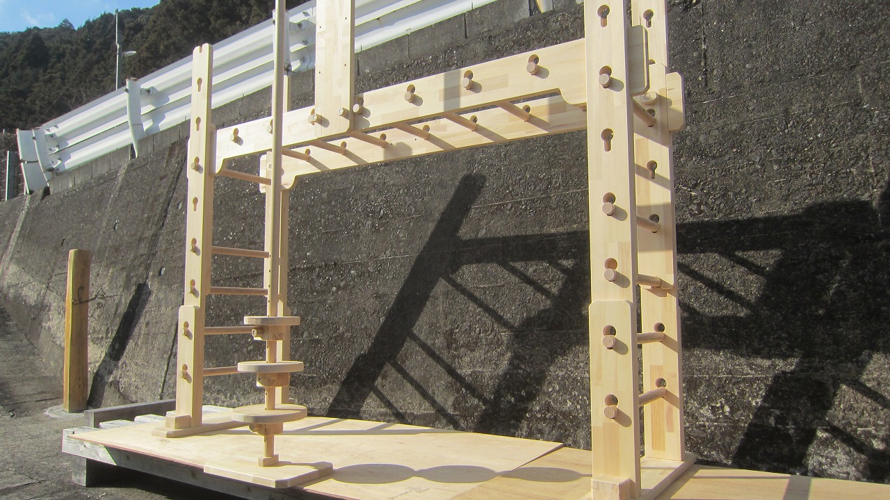 (組み立て案内)①土台用丸棒を使い、土台に柱を立てる。②任意の高さに柱用丸棒を取り付け、梁を組み込む。③木製ナットを締め付け、にぎり棒を取り付けて完成。※柱の丸棒穴に付いたへこみ跡を再利用すると組みやすいです。