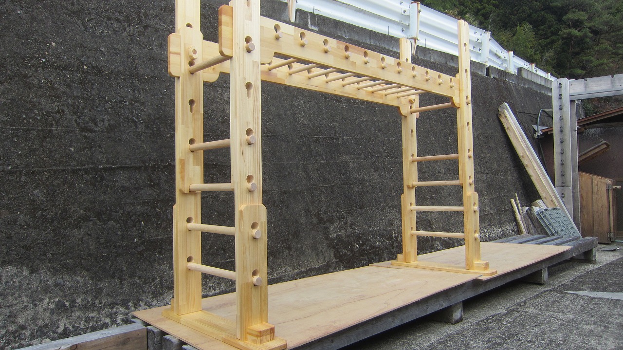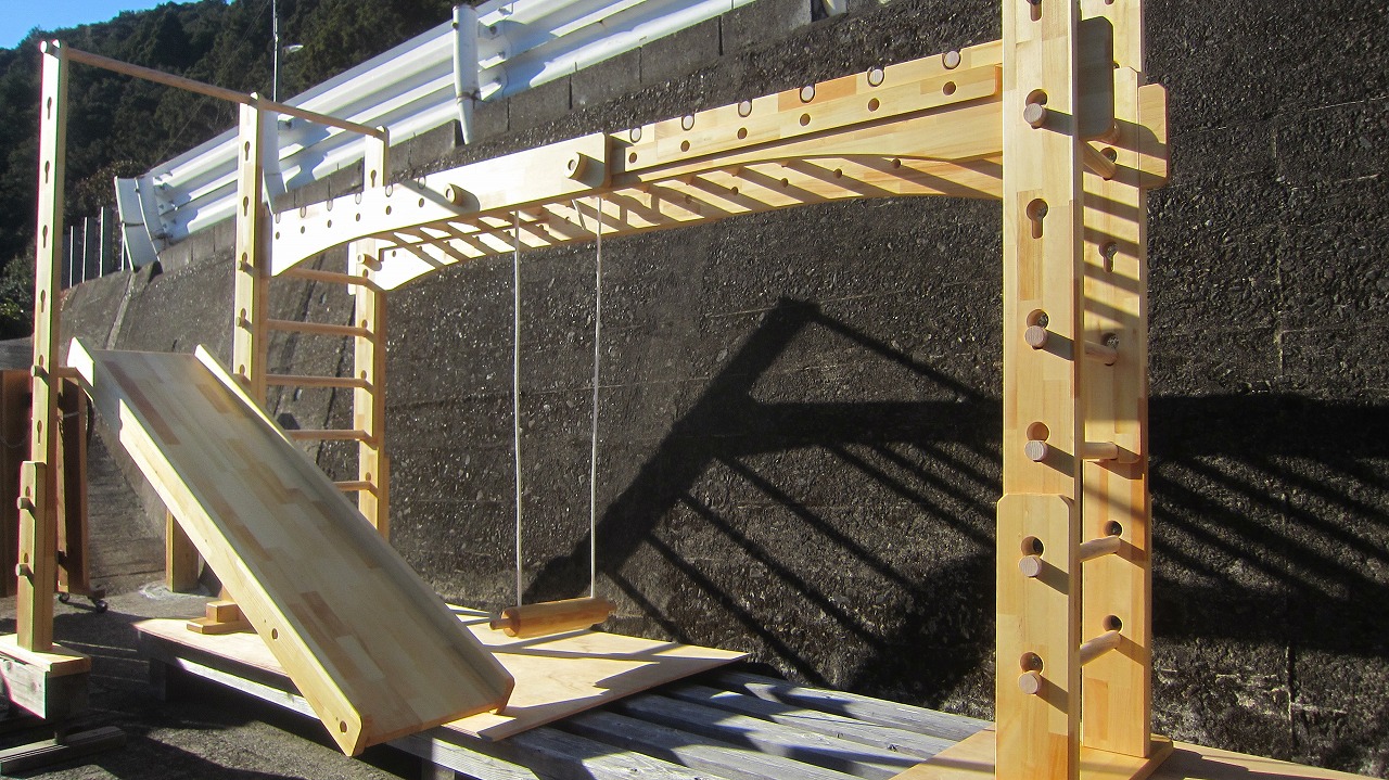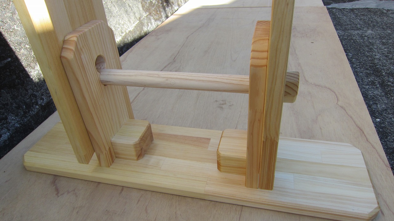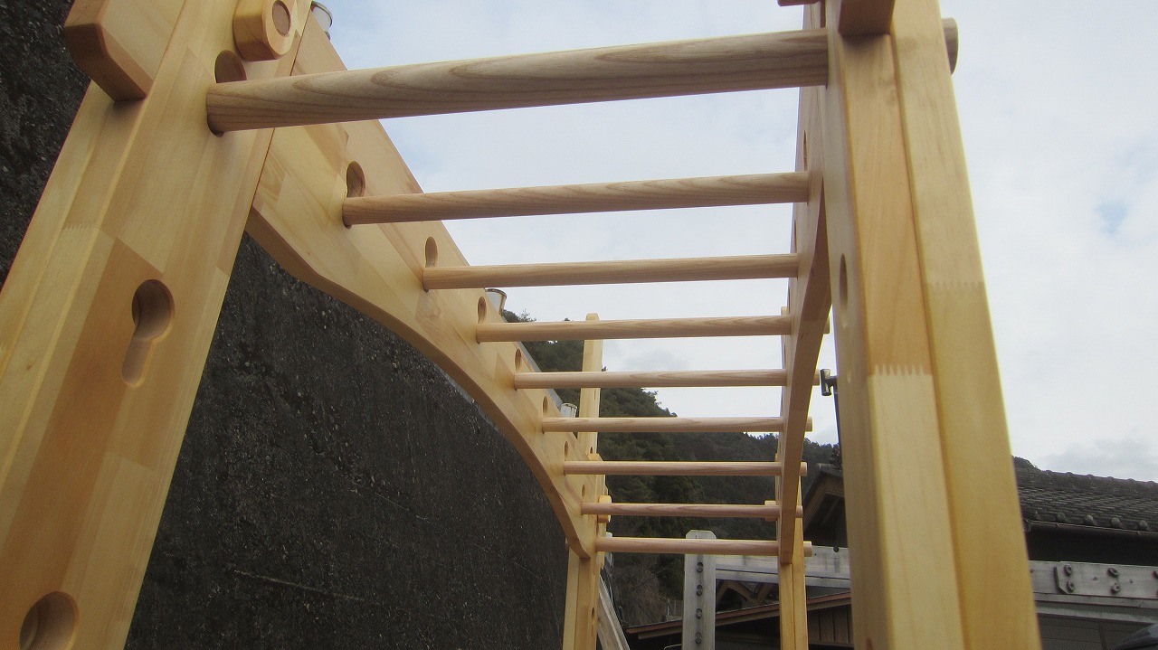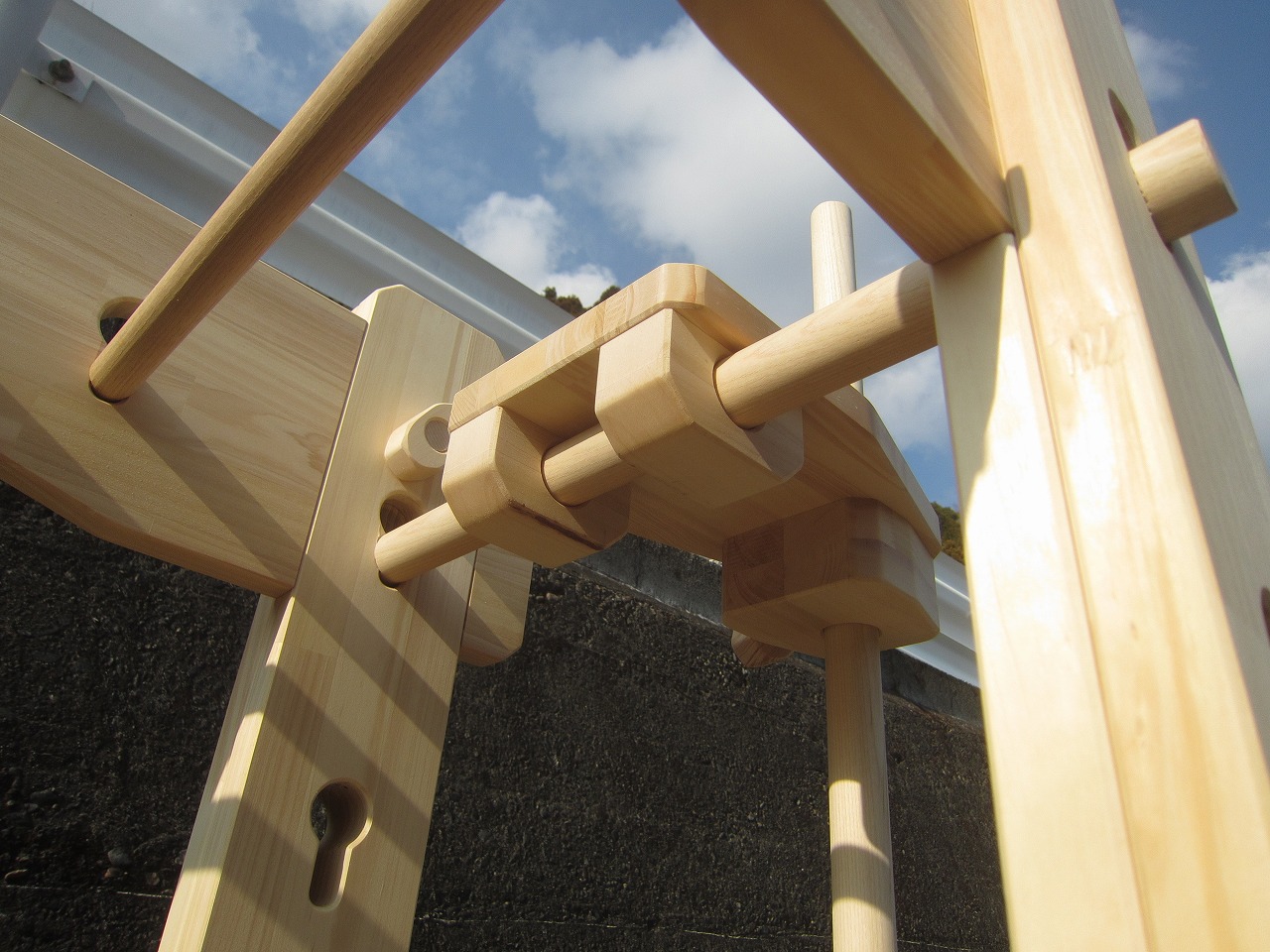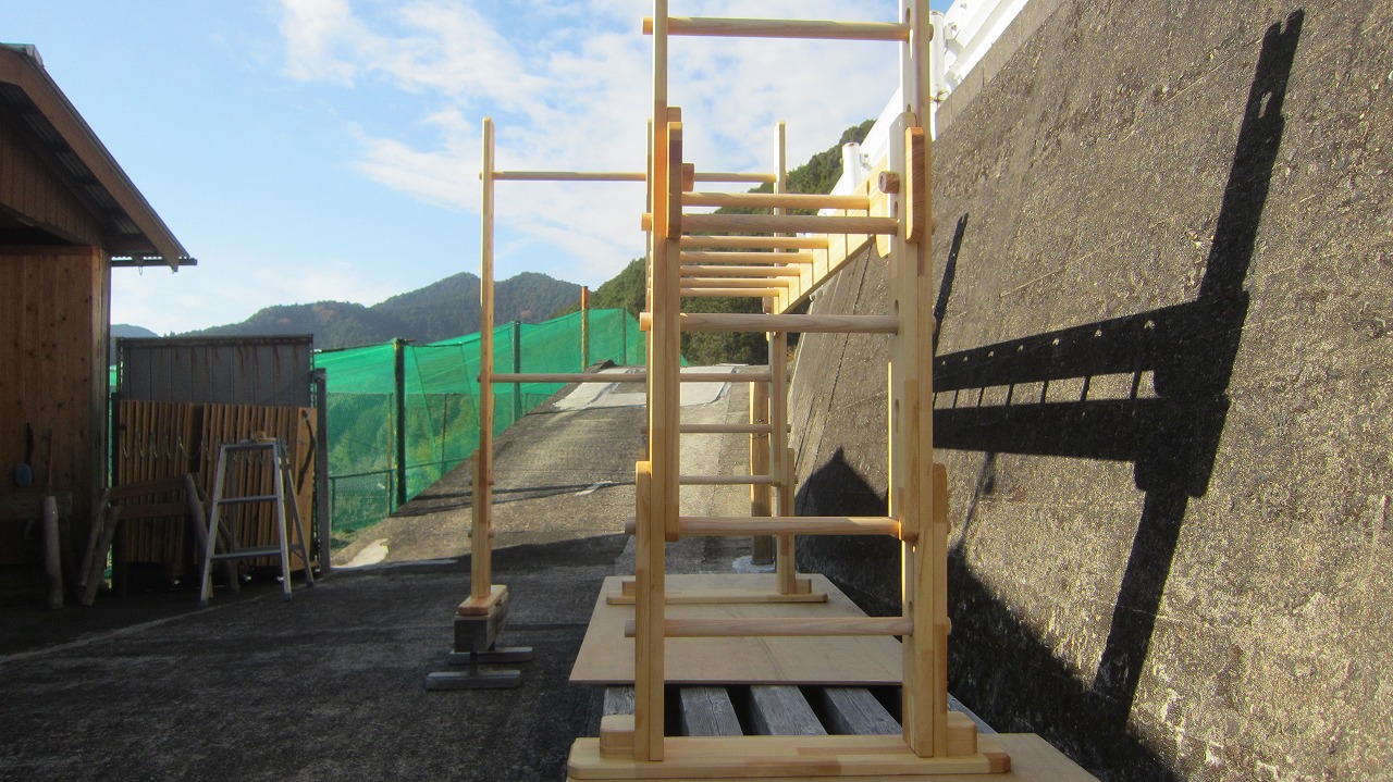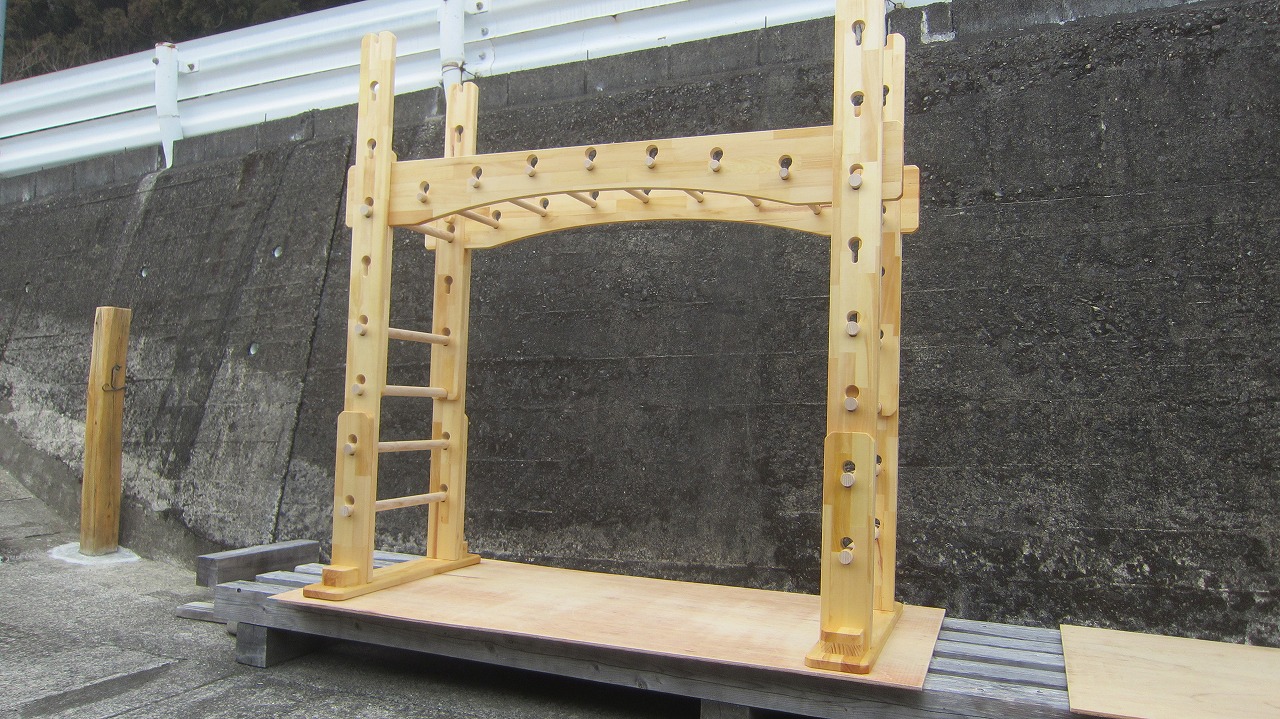 (組み立て案内)①土台用丸棒を使い、土台に柱を立てる。②任意の高さに柱用丸棒を取り付け、梁を組み込む。③木製ナットを締め付け、にぎり棒を取り付けて完成。※柱の丸棒穴に付いたへこみ跡を再利用すると組みやすいです。