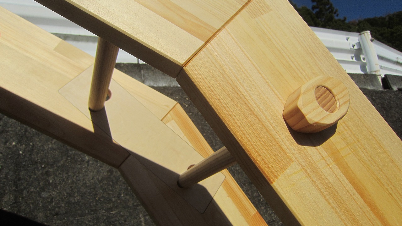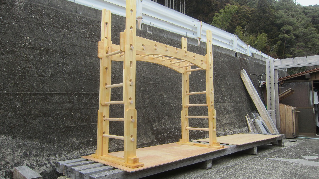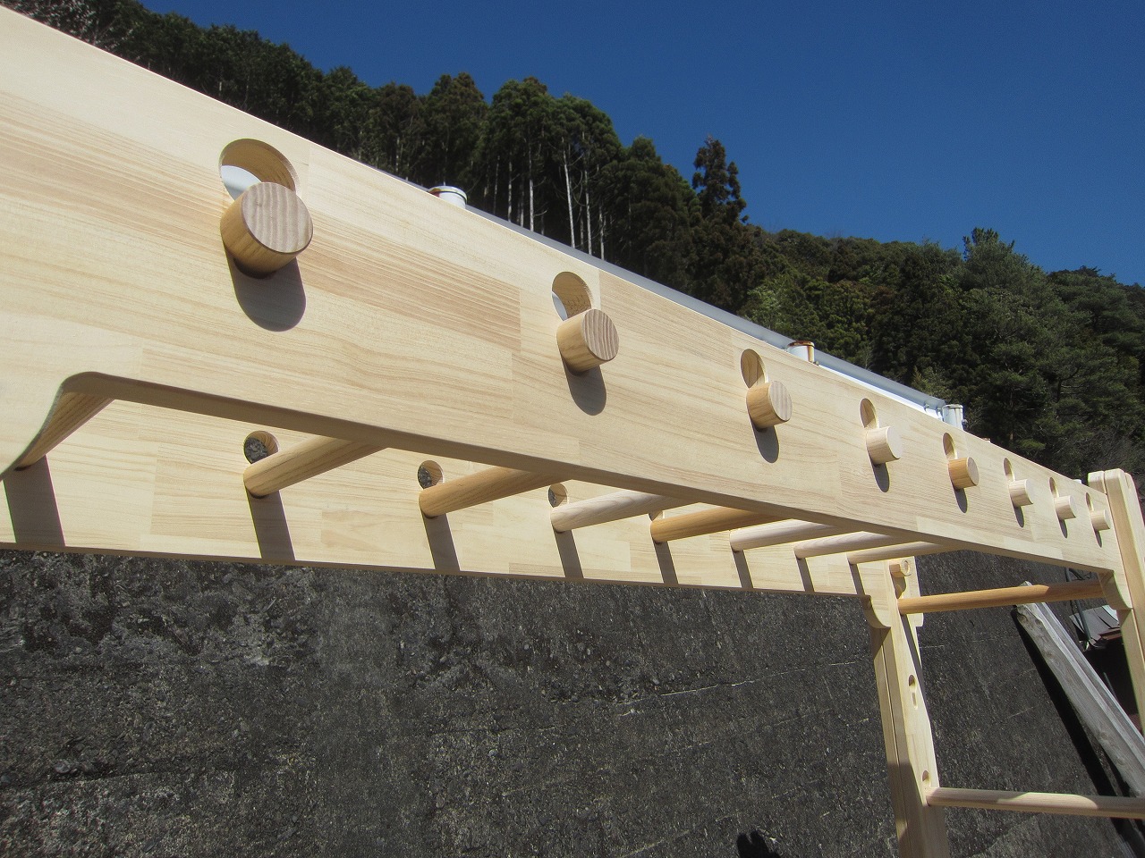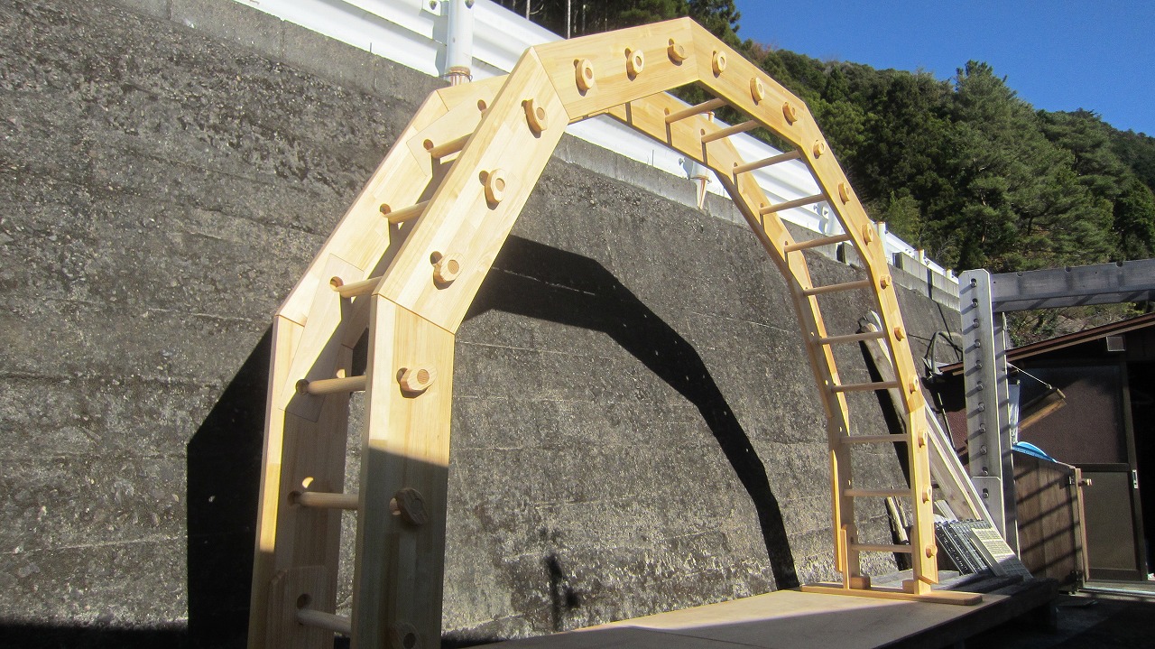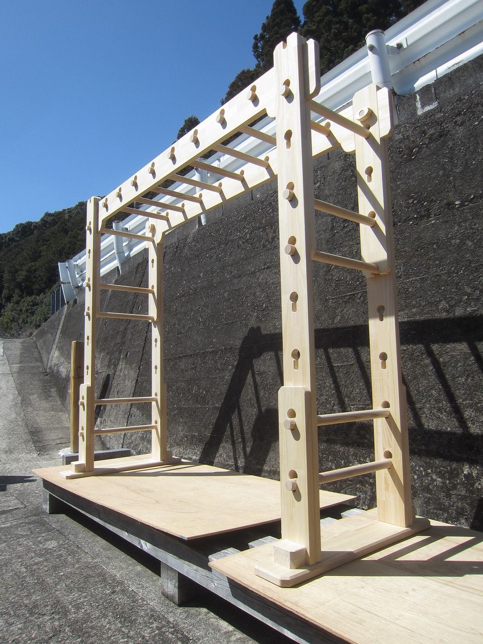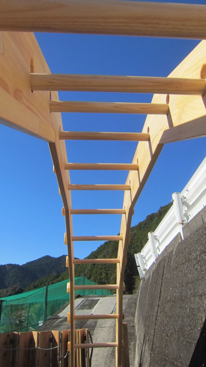 (組み立て案内)①土台用丸棒を使い、土台に柱を立てる。②任意の高さに柱用丸棒を取り付け、梁を組み込む。③木製ナットを締め付け、にぎり棒を取り付けて完成。※柱の丸棒穴に付いたへこみ跡を再利用すると組みやすいです。