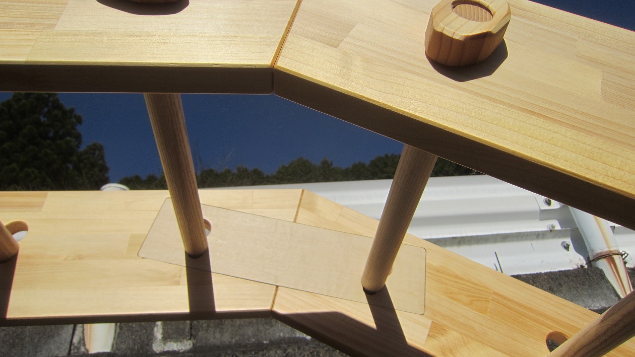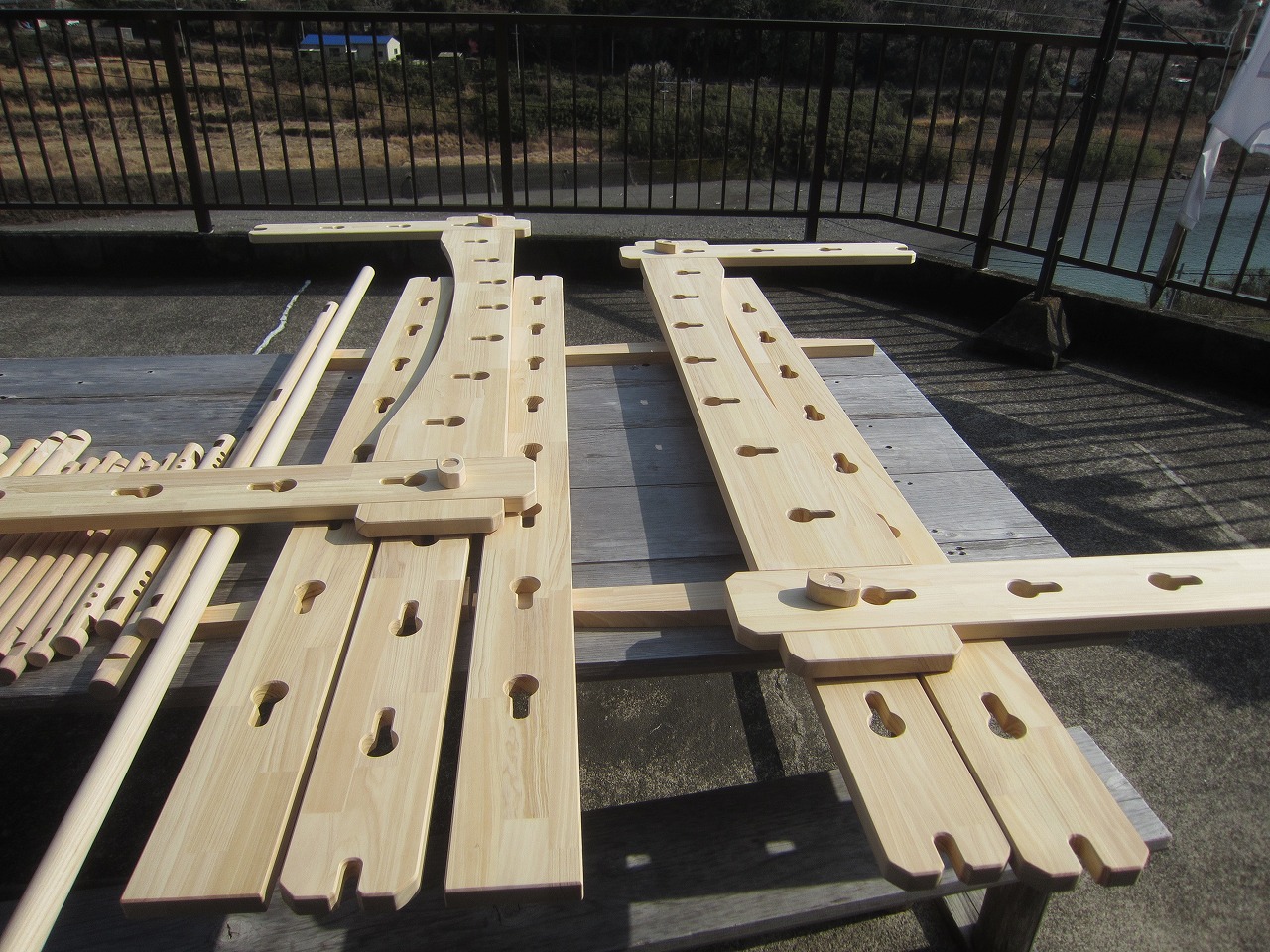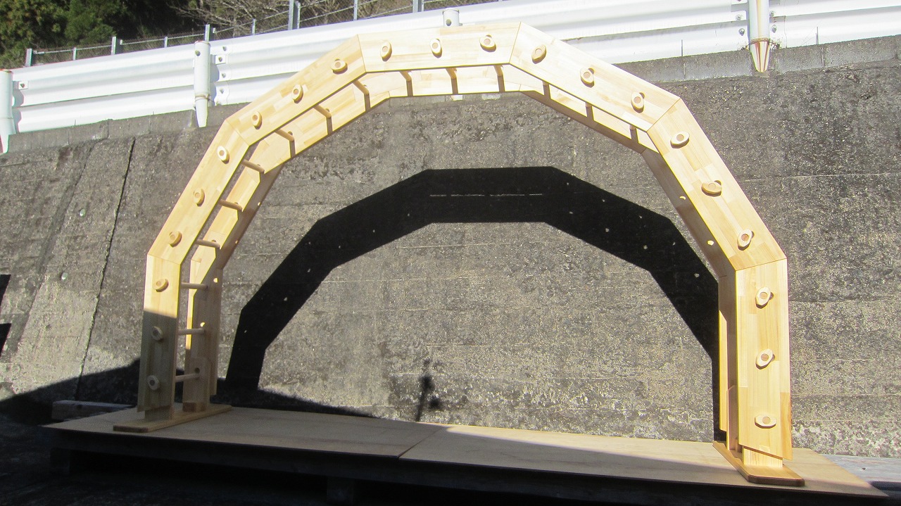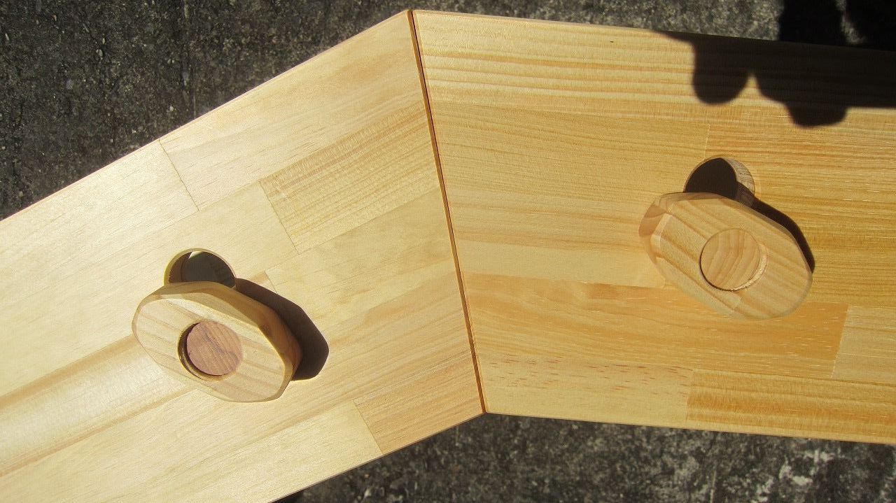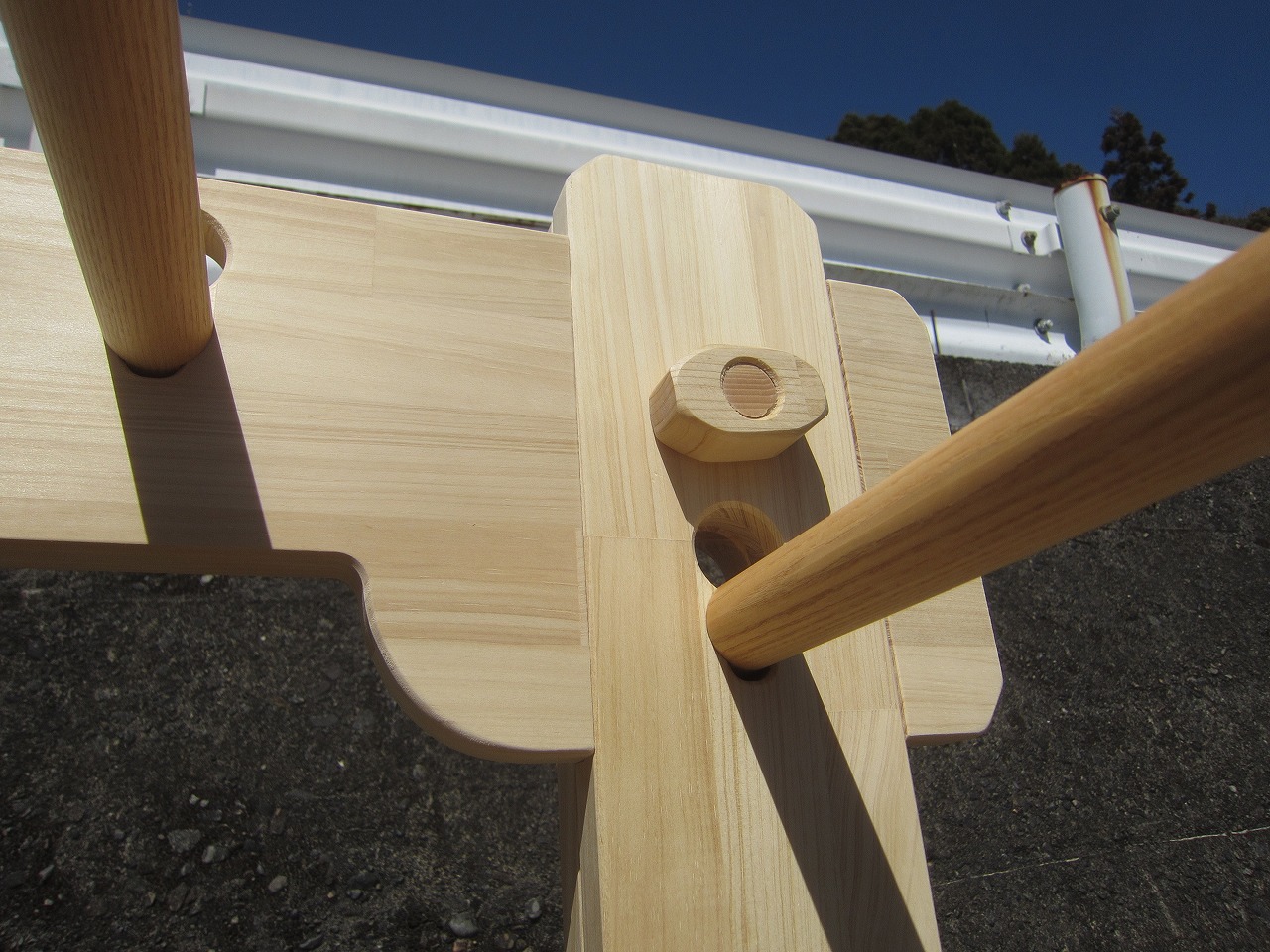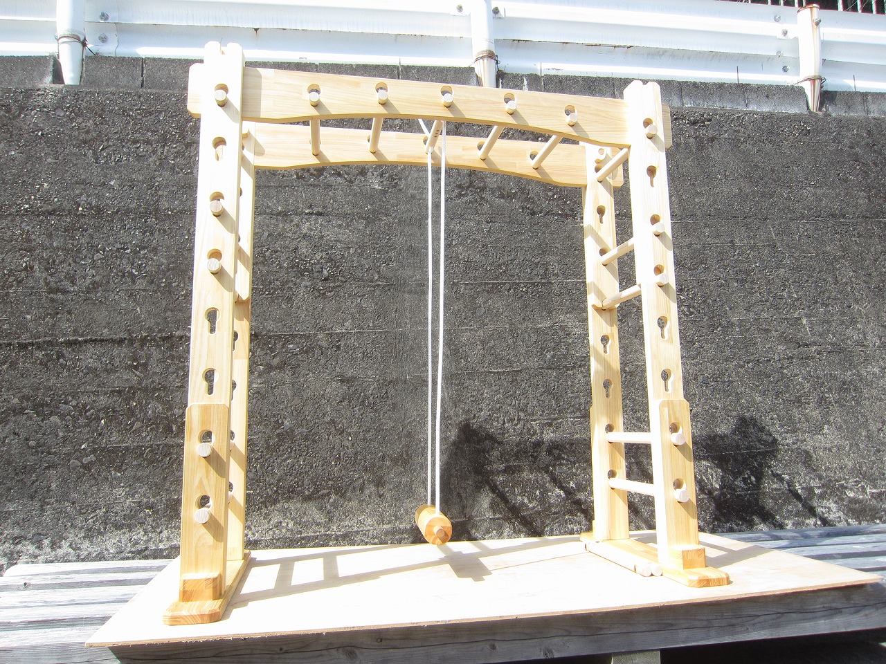 (組み立て案内)①土台用丸棒を使い、土台に柱を立てる。②任意の高さに柱用丸棒を取り付け、梁を組み込む。③木製ナットを締め付け、にぎり棒を取り付けて完成。※柱の丸棒穴に付いたへこみ跡を再利用すると組みやすいです。