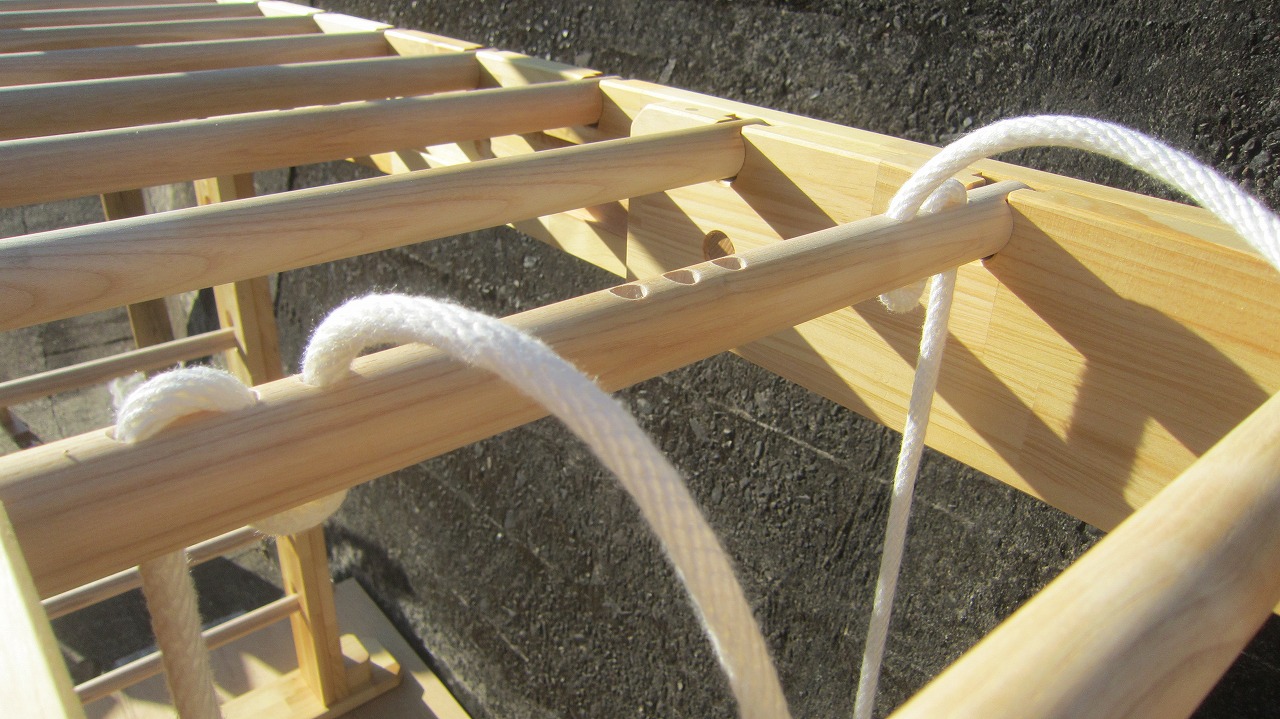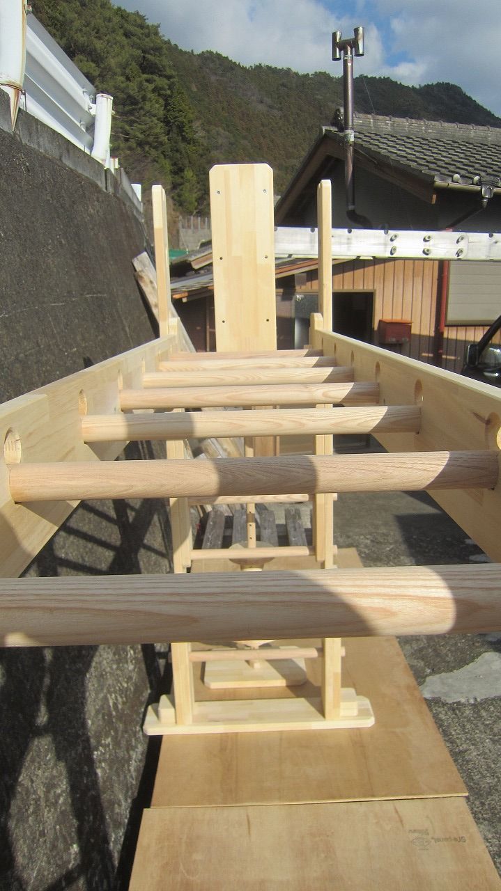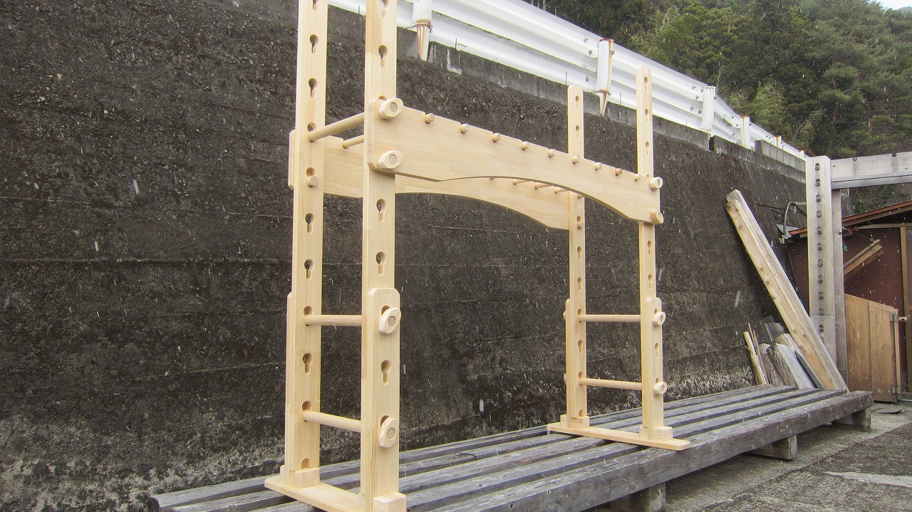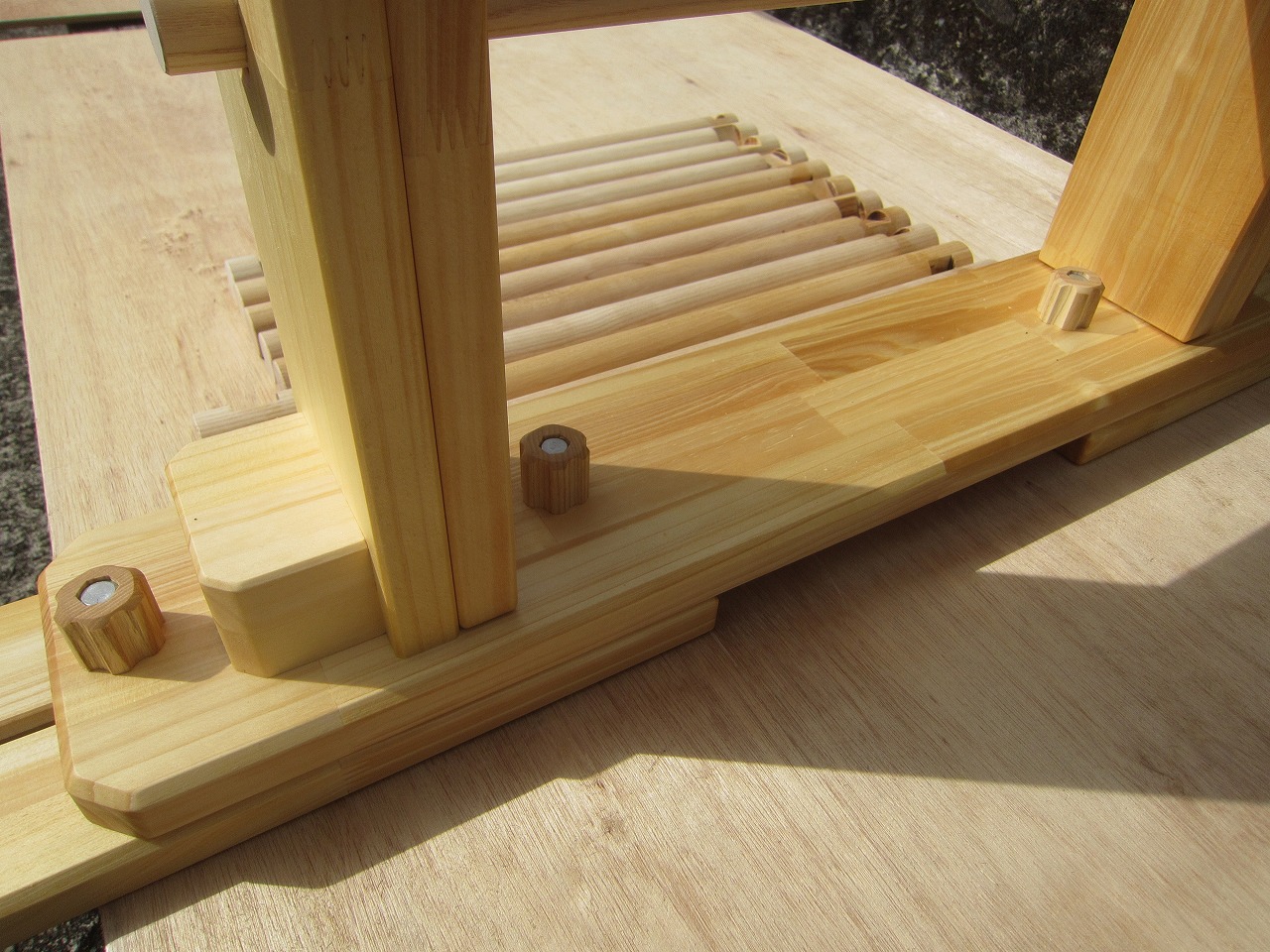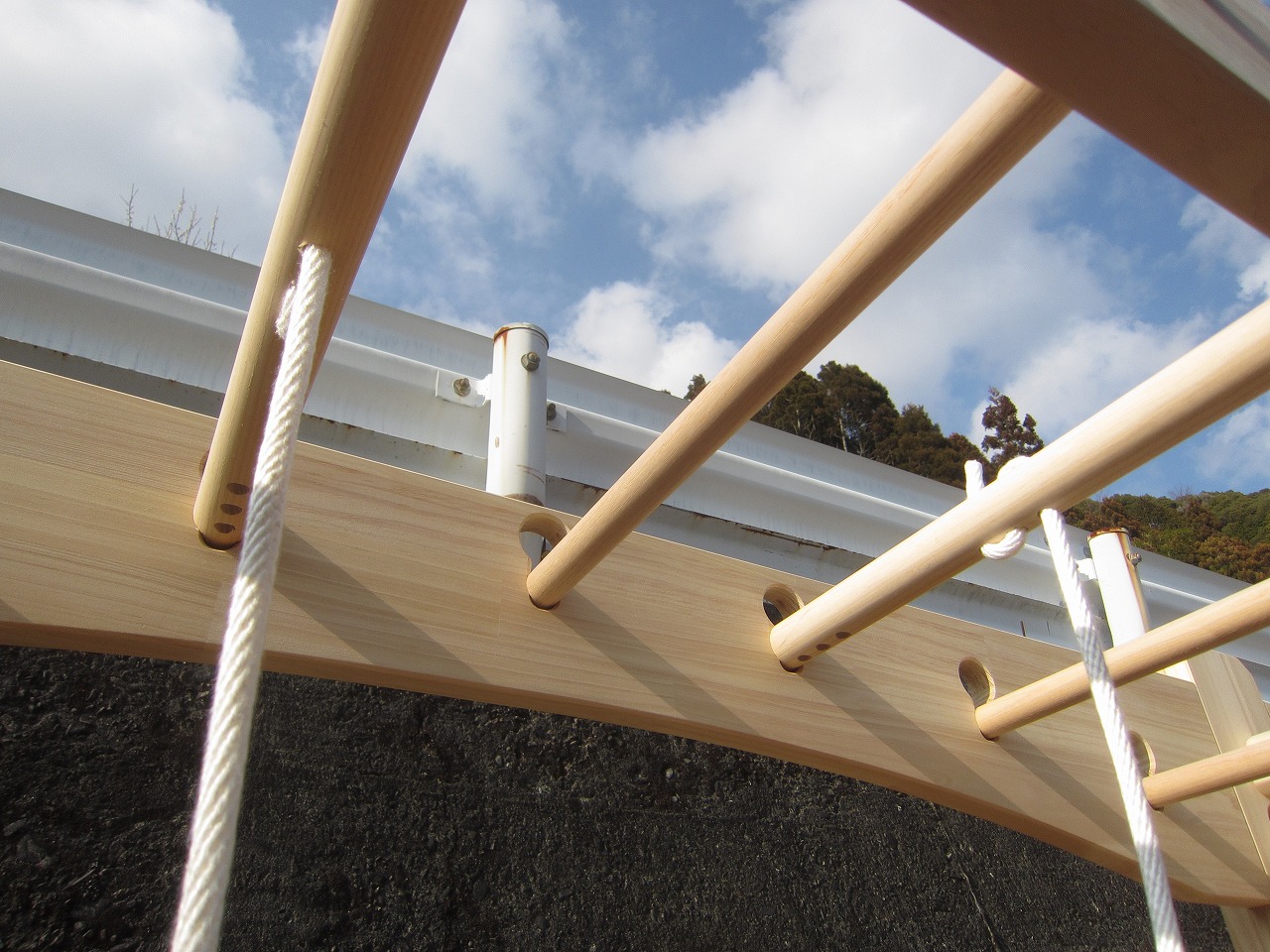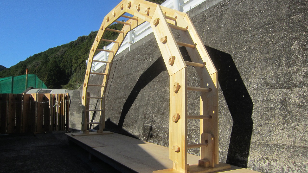 (組み立て案内)①土台用丸棒を使い、土台に柱を立てる。②任意の高さに柱用丸棒を取り付け、梁を組み込む。③木製ナットを締め付け、にぎり棒を取り付けて完成。※柱の丸棒穴に付いたへこみ跡を再利用すると組みやすいです。
