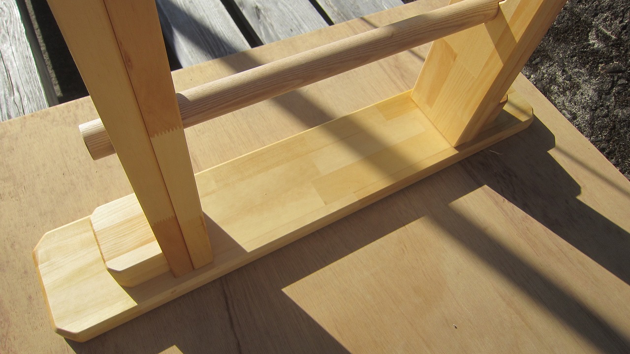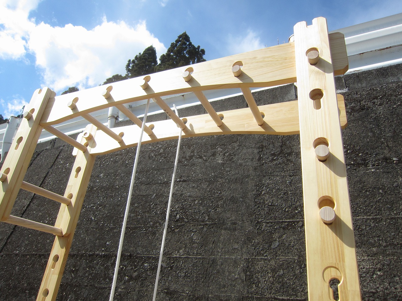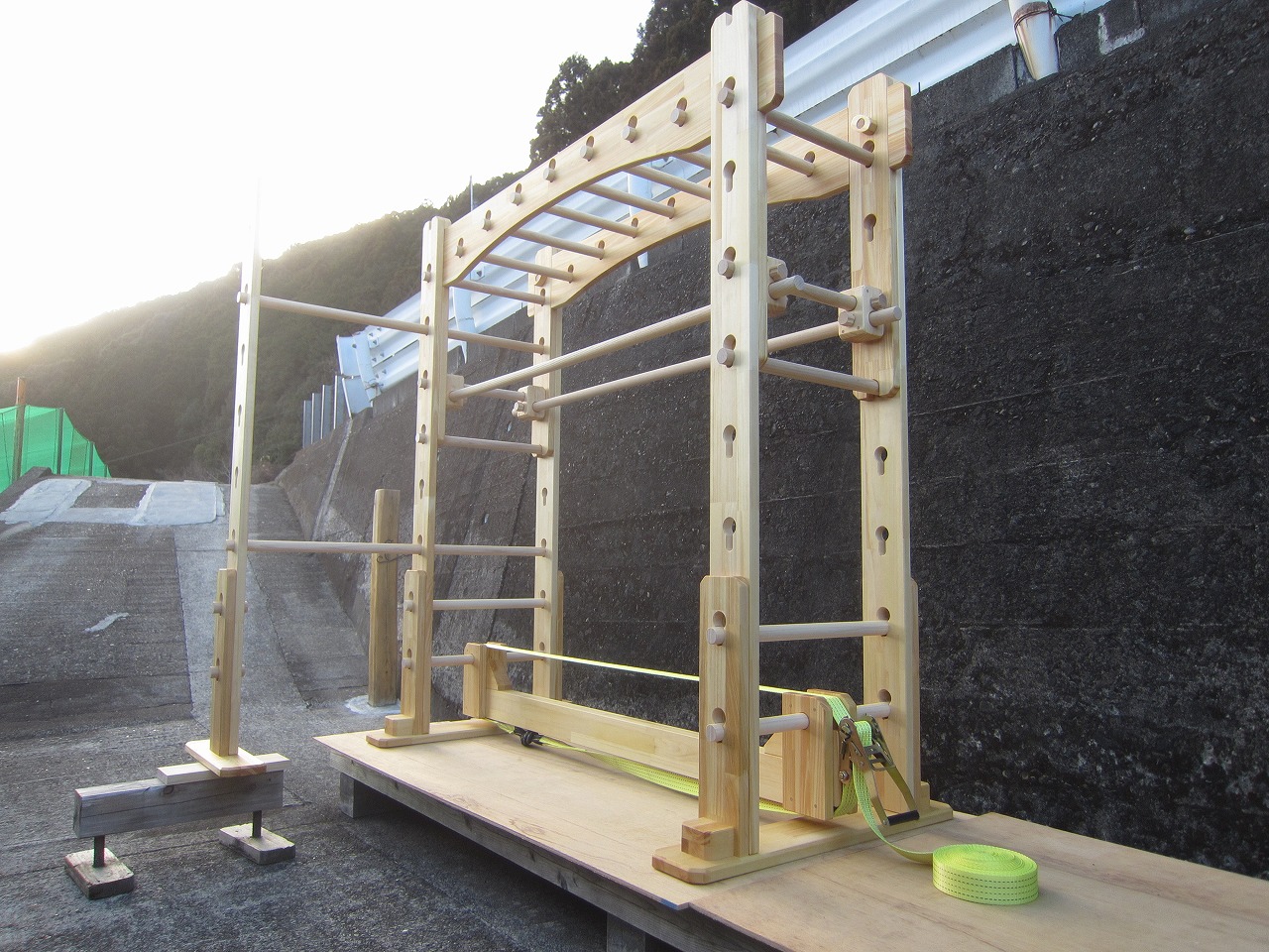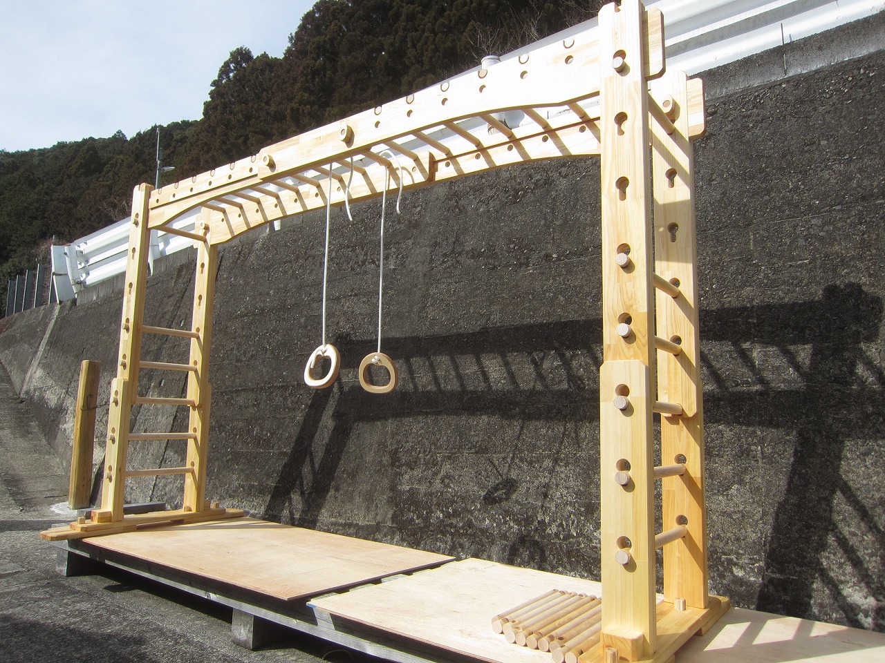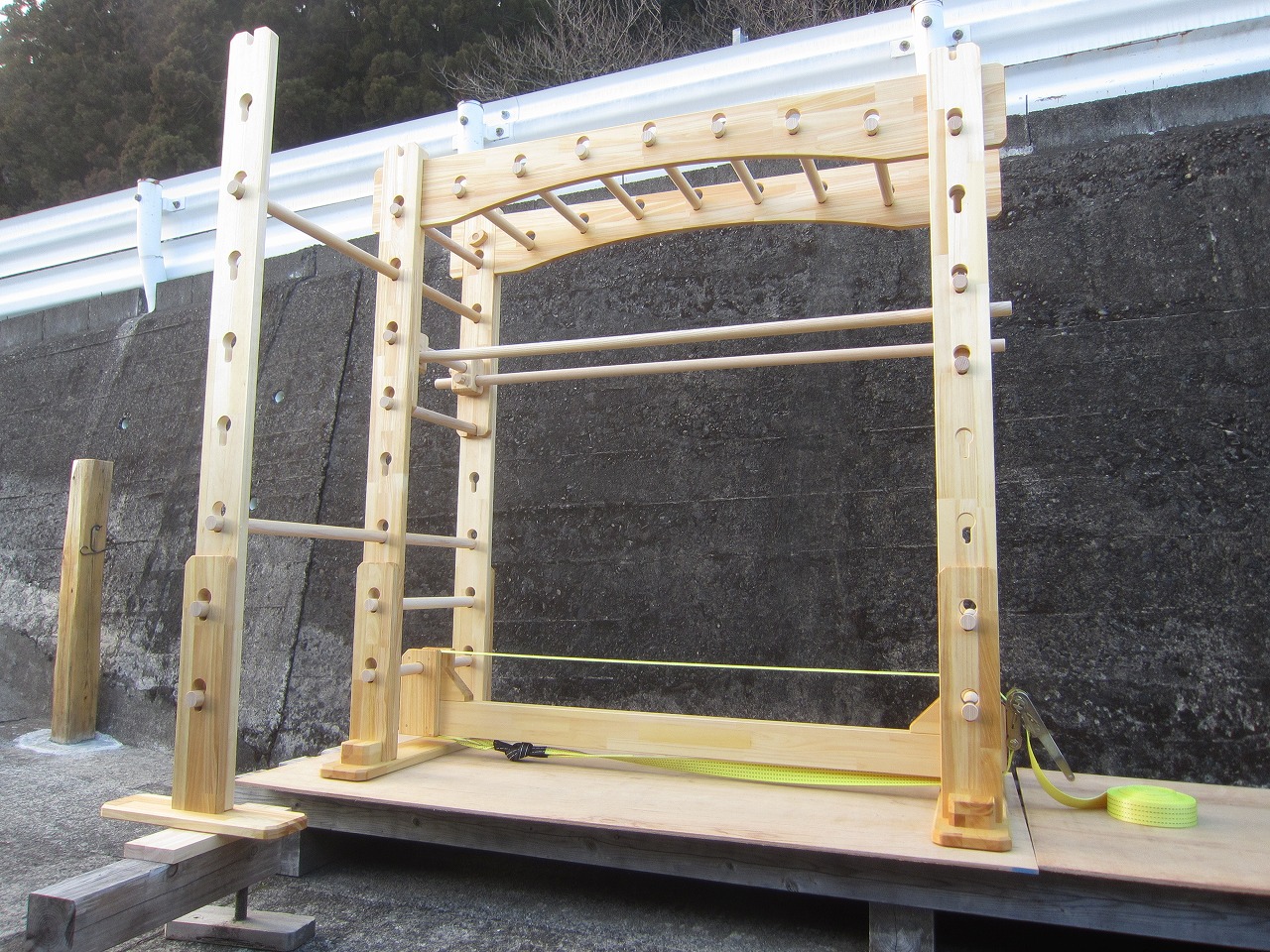 (組み立て案内)①土台用丸棒を使い、土台に柱を立てる。②任意の高さに柱用丸棒を取り付け、梁を組み込む。③木製ナットを締め付け、にぎり棒を取り付けて完成。※柱の丸棒穴に付いたへこみ跡を再利用すると組みやすいです。