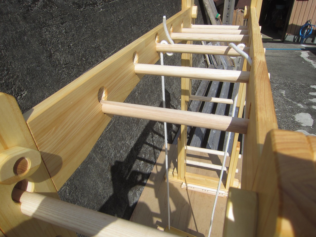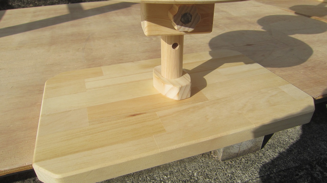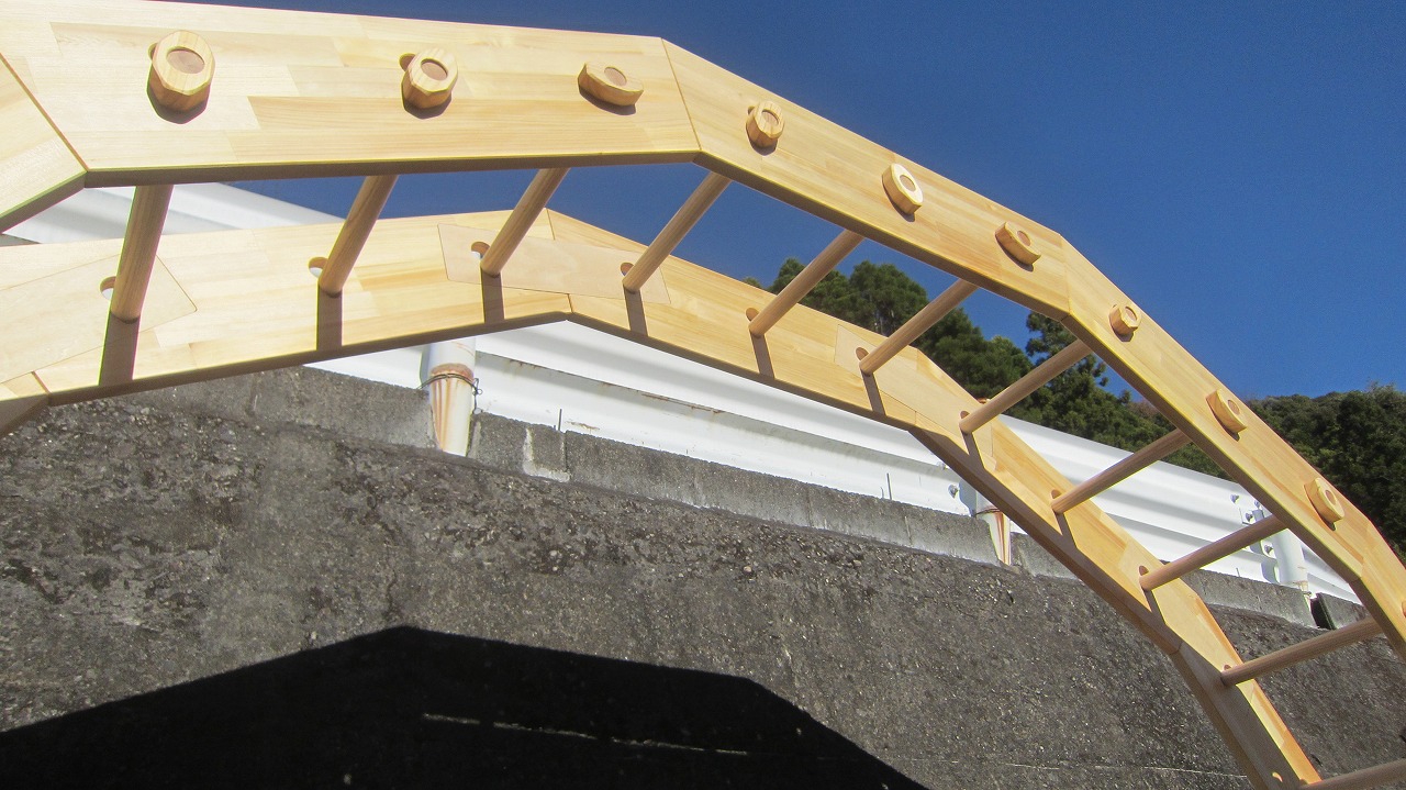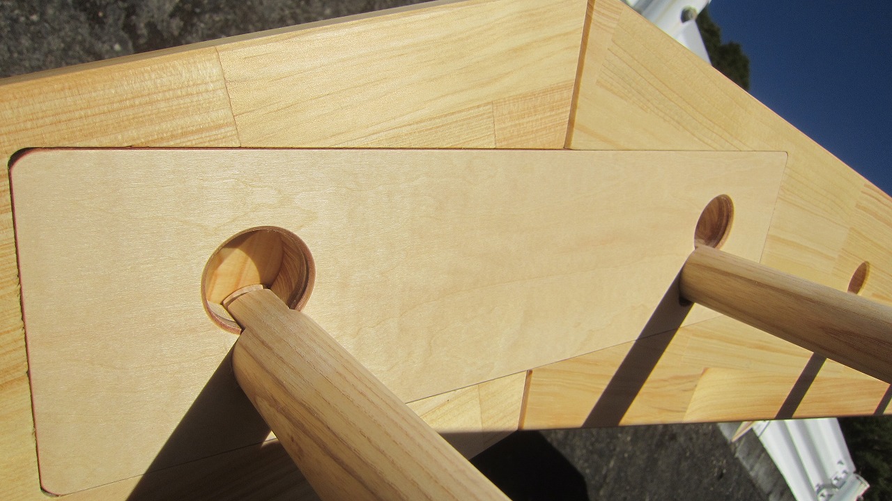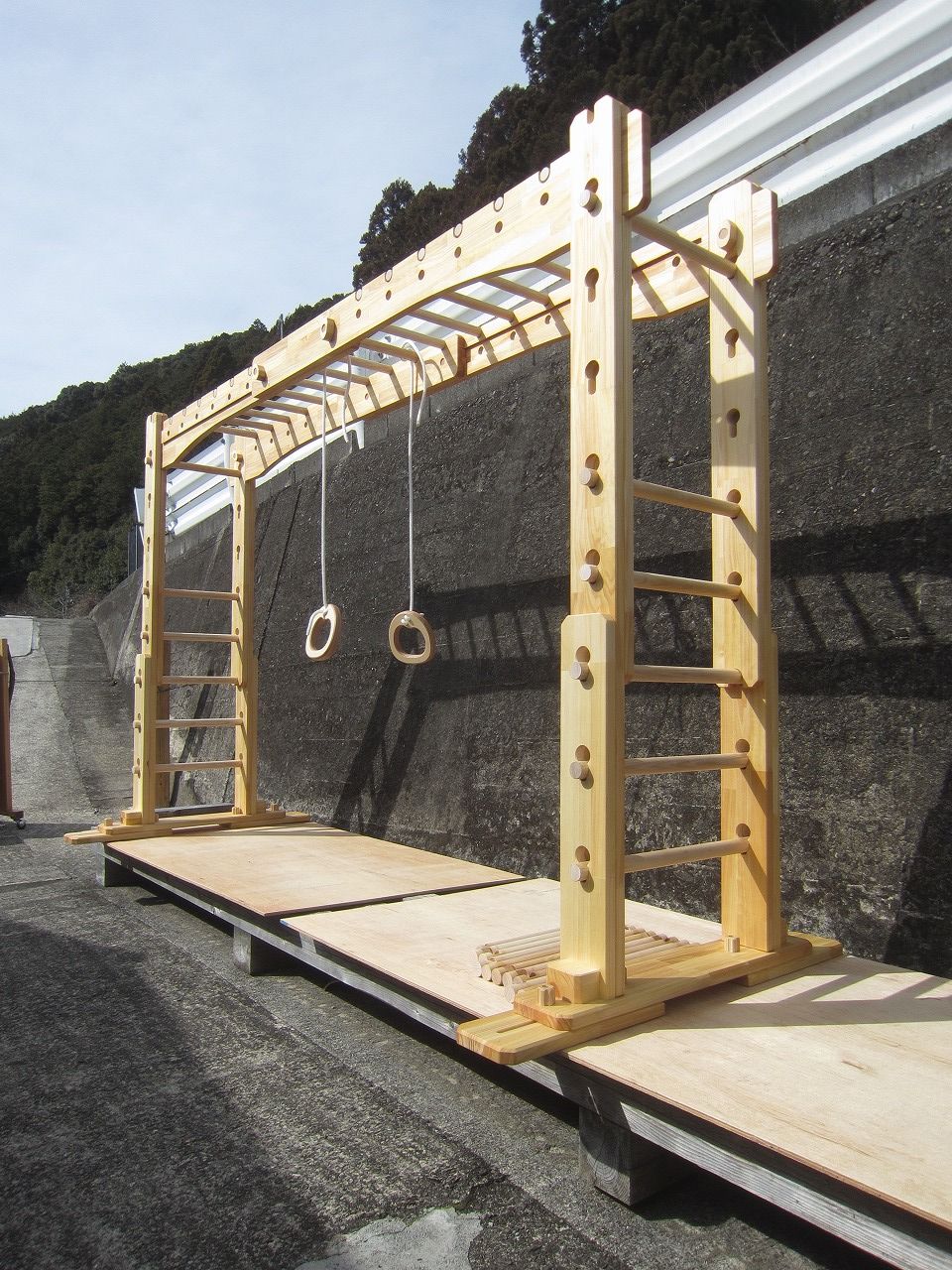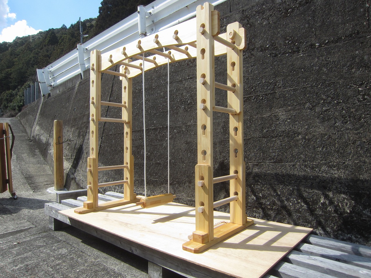 (組み立て案内)①土台用丸棒を使い、土台に柱を立てる。②任意の高さに柱用丸棒を取り付け、梁を組み込む。③木製ナットを締め付け、にぎり棒を取り付けて完成。※柱の丸棒穴に付いたへこみ跡を再利用すると組みやすいです。