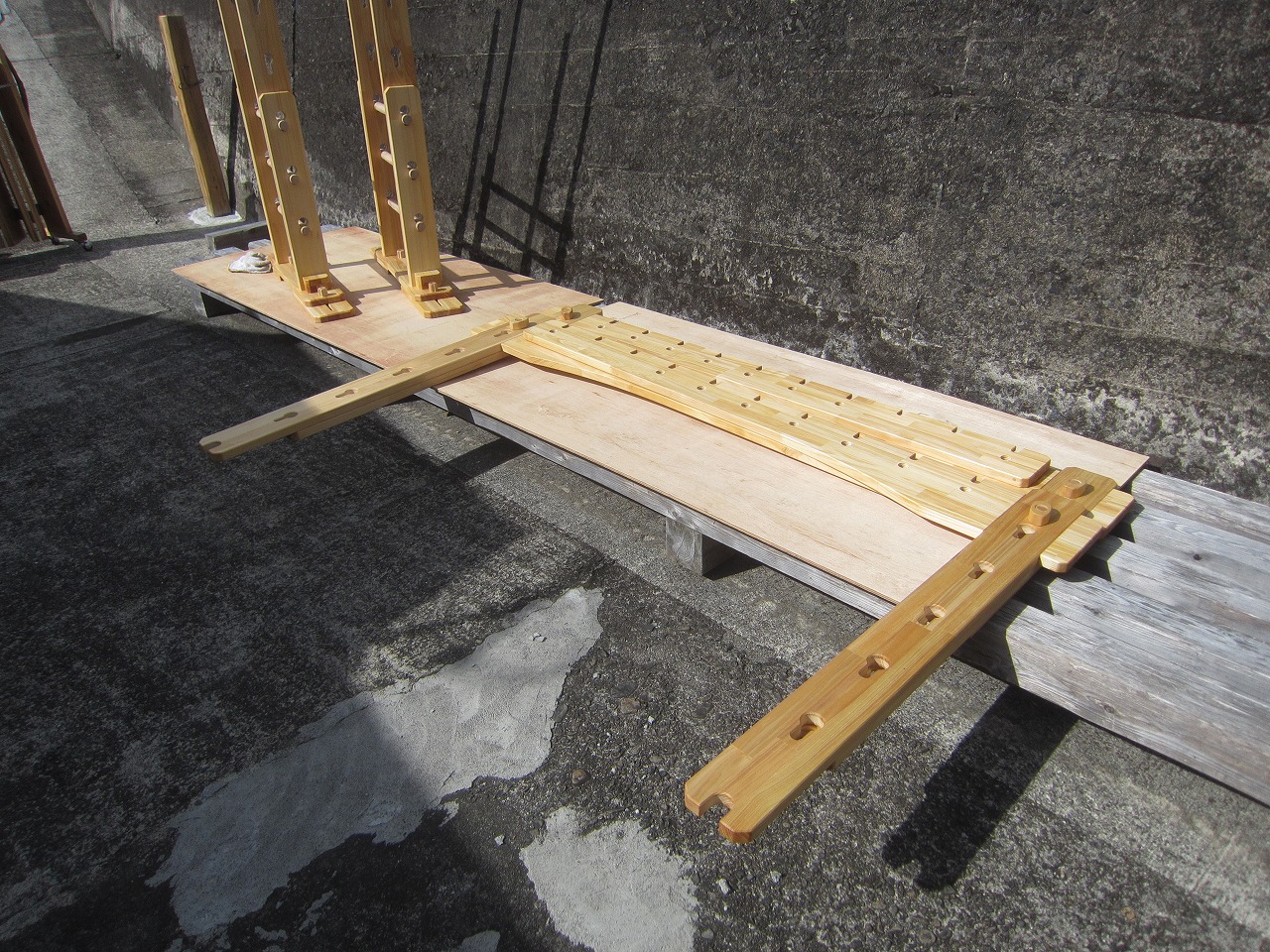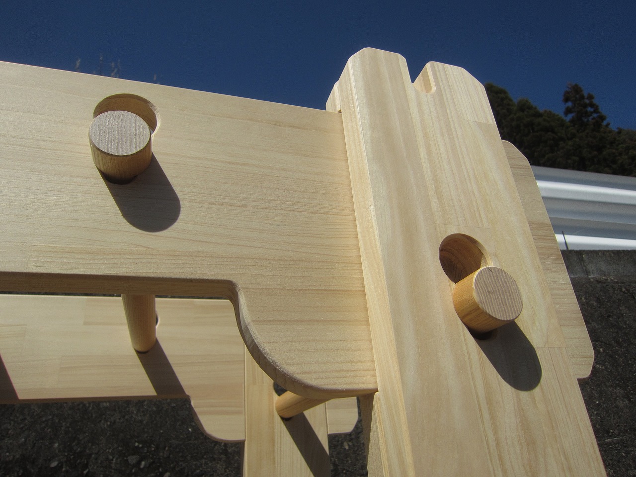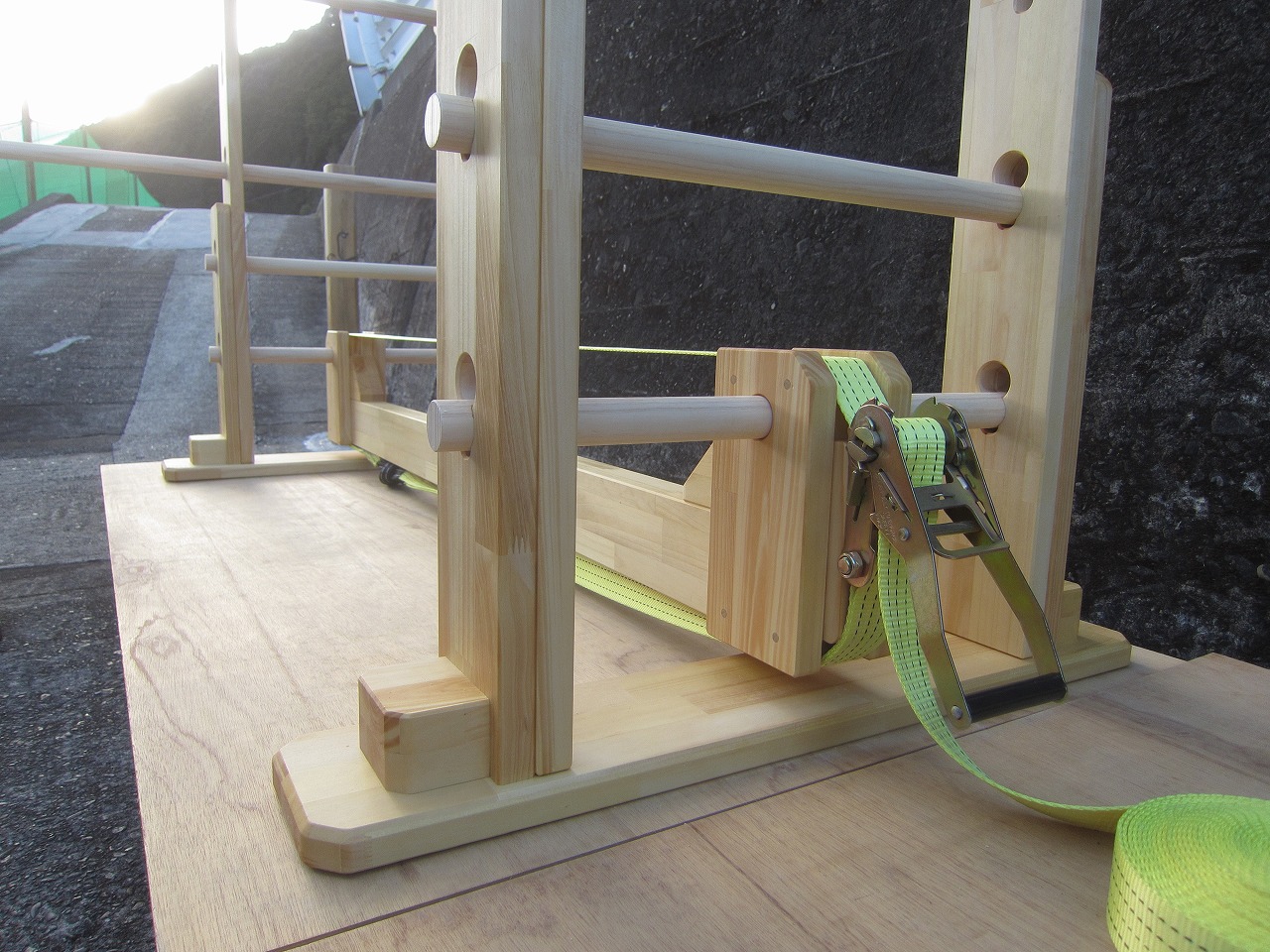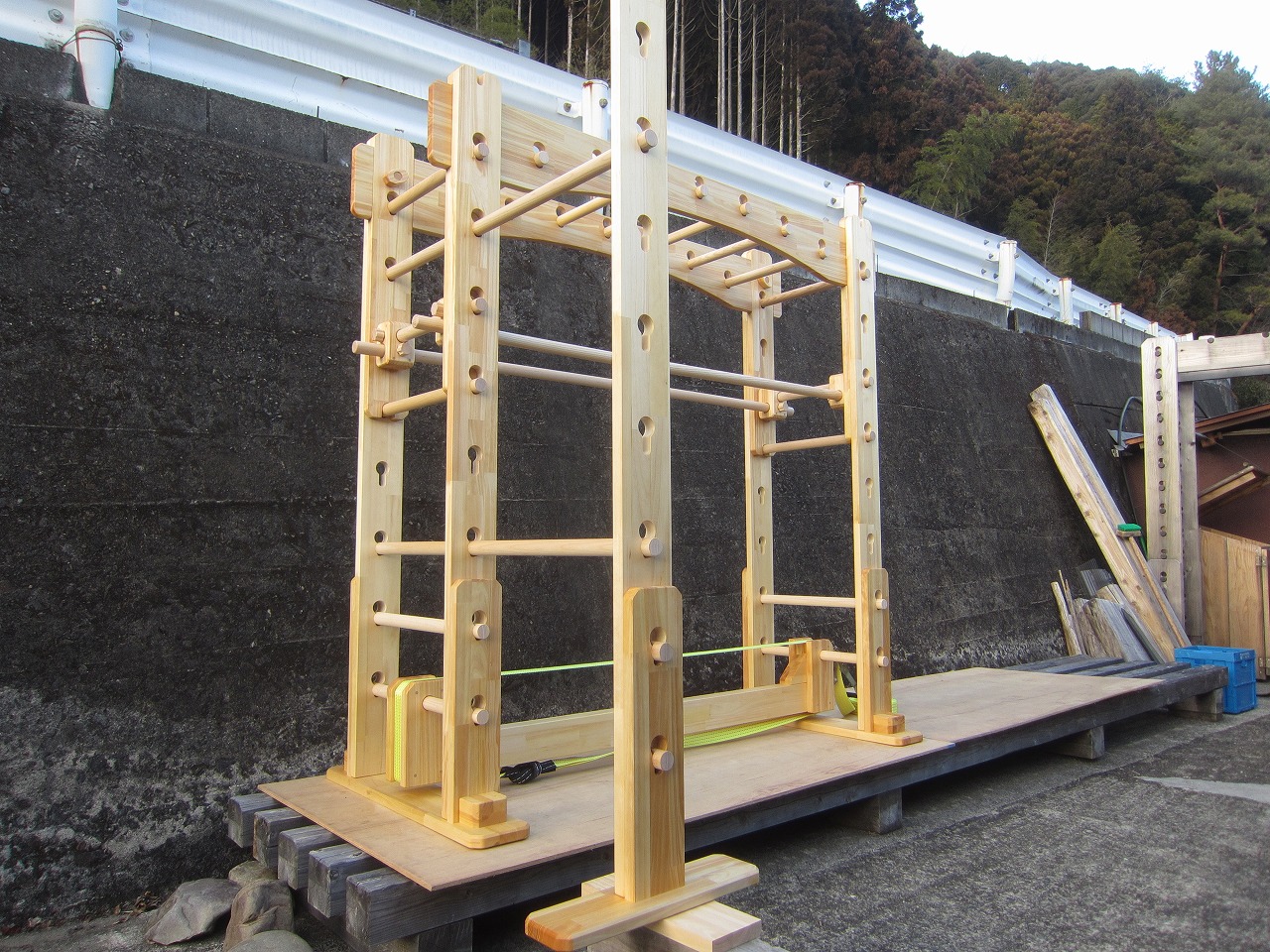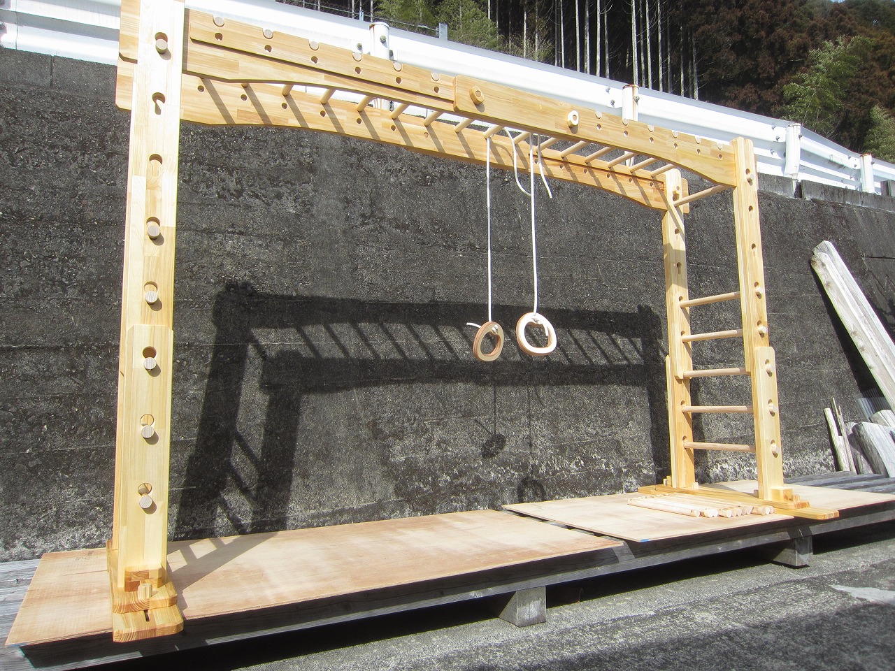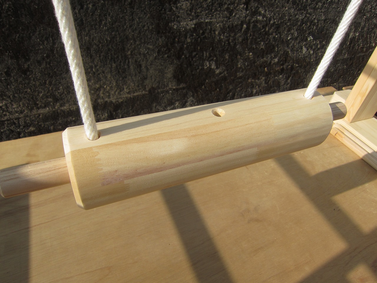 (組み立て案内)①土台用丸棒を使い、土台に柱を立てる。②任意の高さに柱用丸棒を取り付け、梁を組み込む。③木製ナットを締め付け、にぎり棒を取り付けて完成。※柱の丸棒穴に付いたへこみ跡を再利用すると組みやすいです。