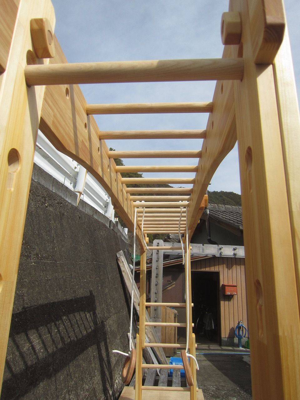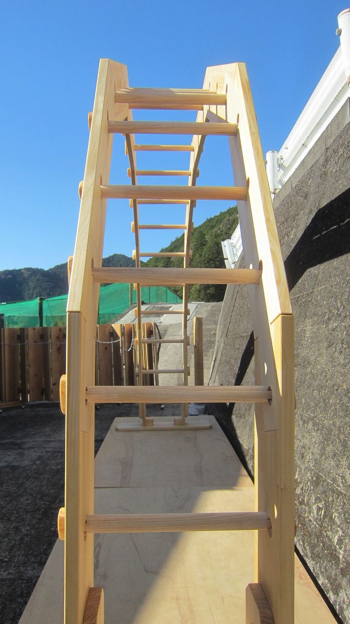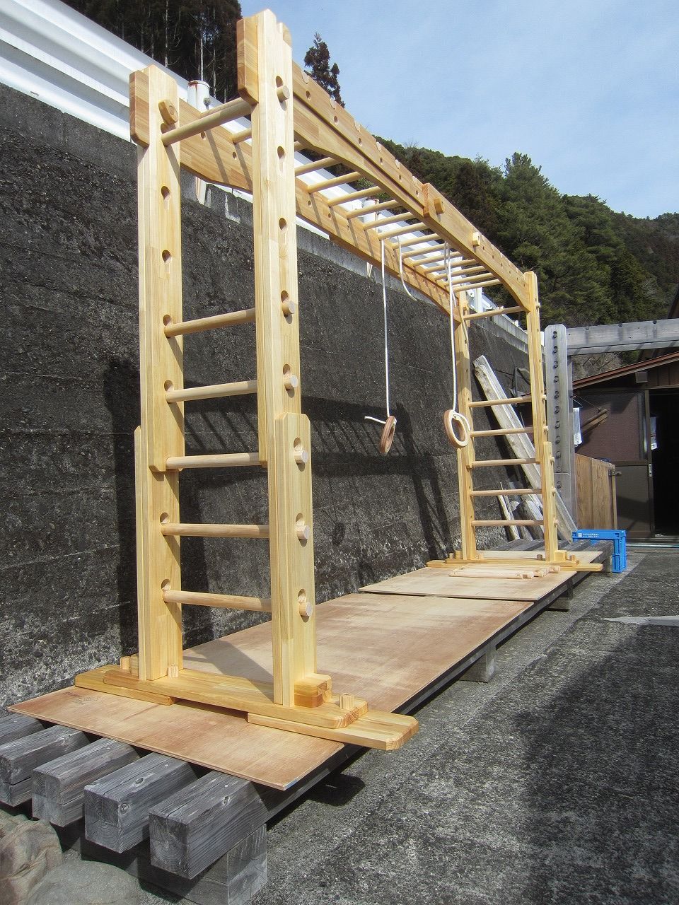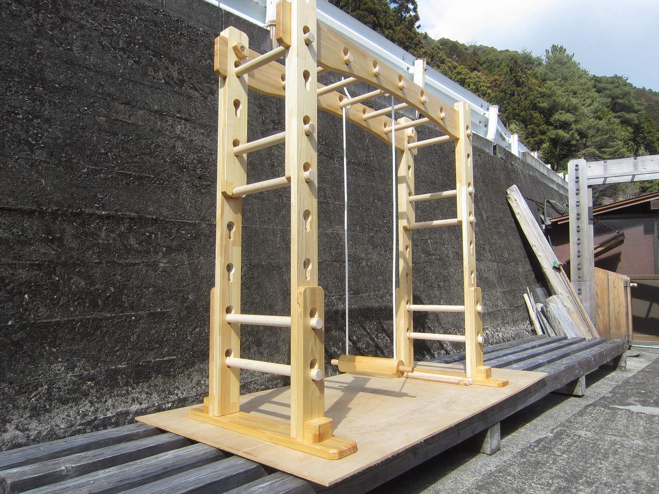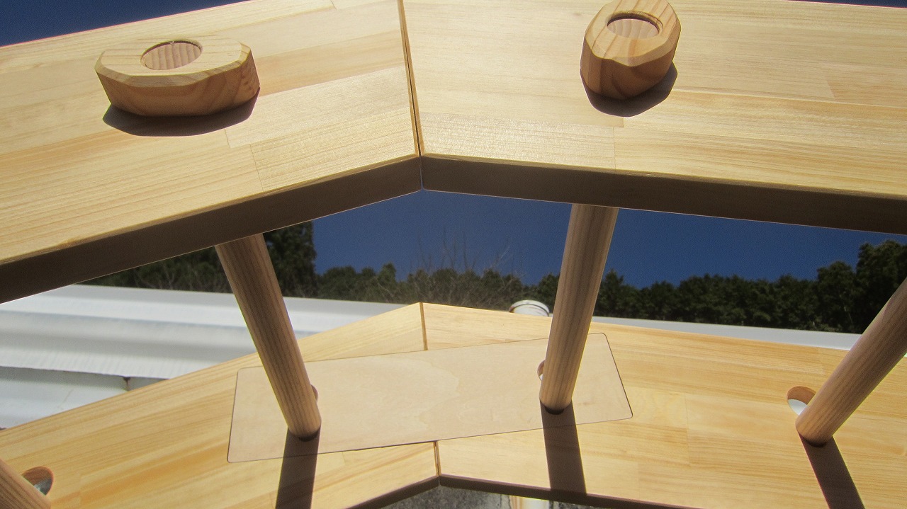 (組み立て案内)①土台用丸棒を使い、土台に柱を立てる。②任意の高さに柱用丸棒を取り付け、梁を組み込む。③木製ナットを締め付け、にぎり棒を取り付けて完成。※柱の丸棒穴に付いたへこみ跡を再利用すると組みやすいです。