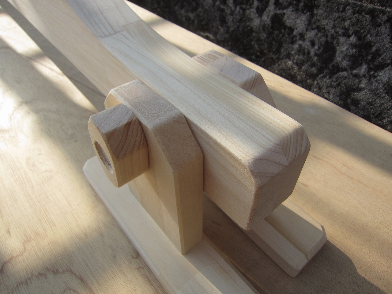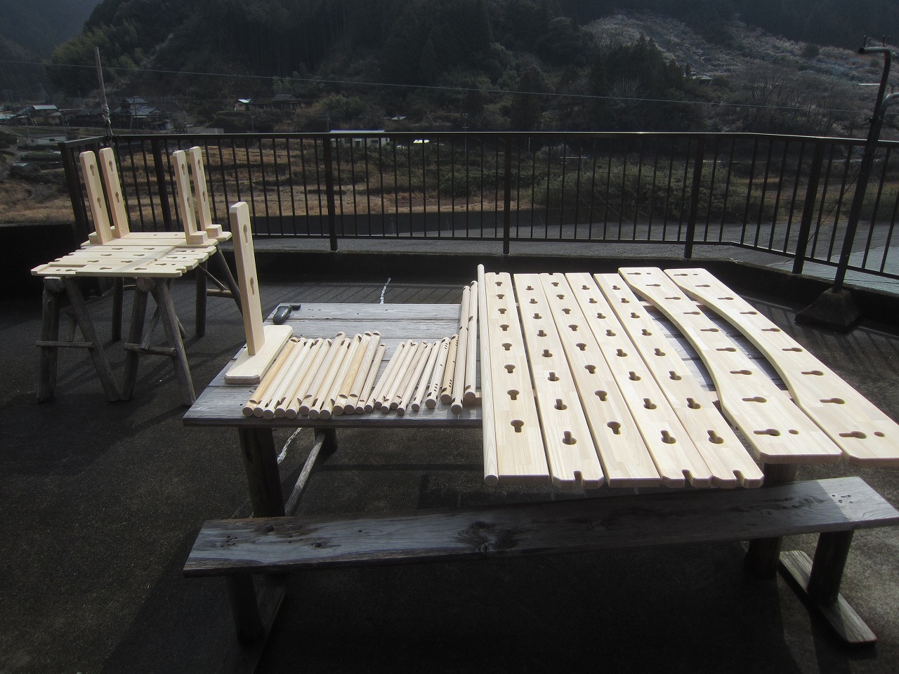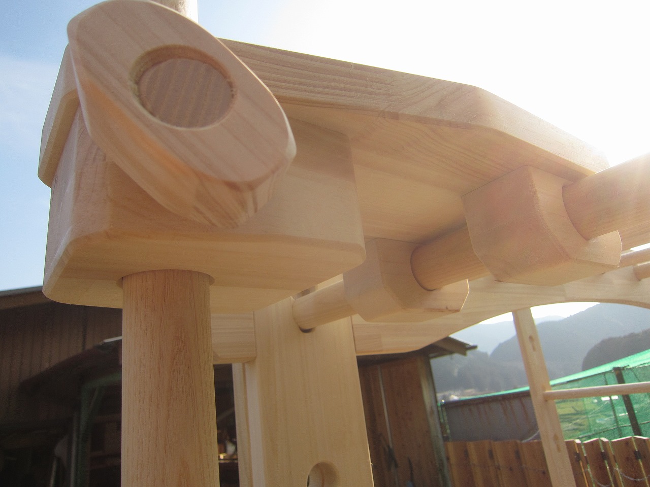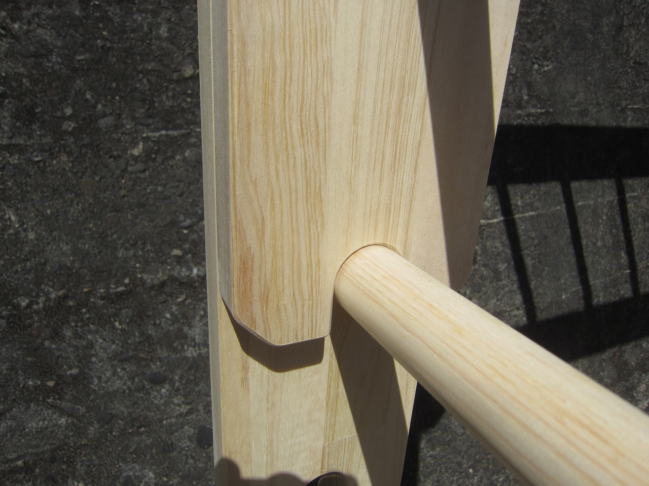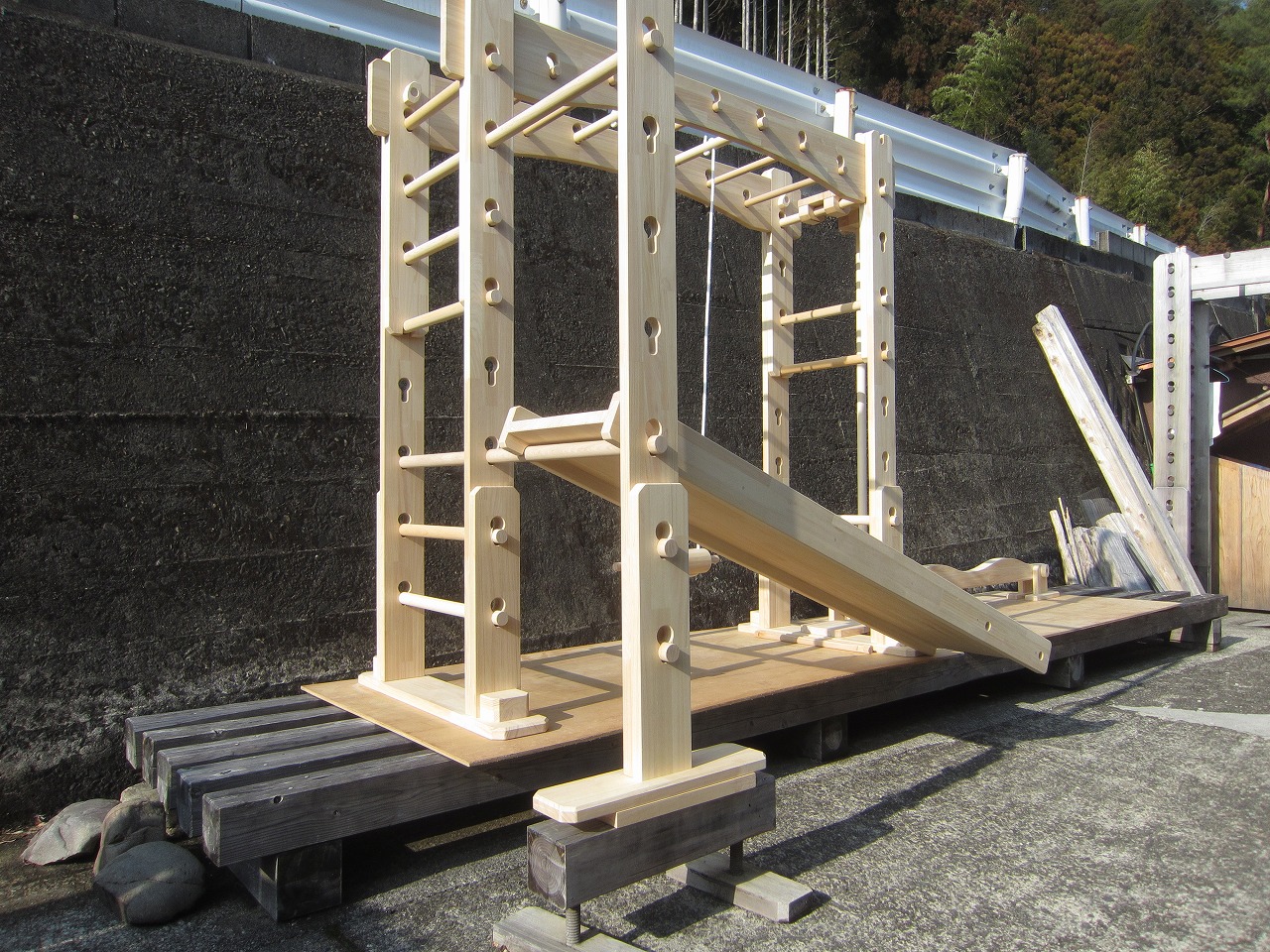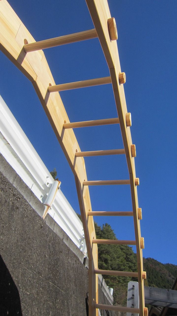 (組み立て案内)①土台用丸棒を使い、土台に柱を立てる。②任意の高さに柱用丸棒を取り付け、梁を組み込む。③木製ナットを締め付け、にぎり棒を取り付けて完成。※柱の丸棒穴に付いたへこみ跡を再利用すると組みやすいです。