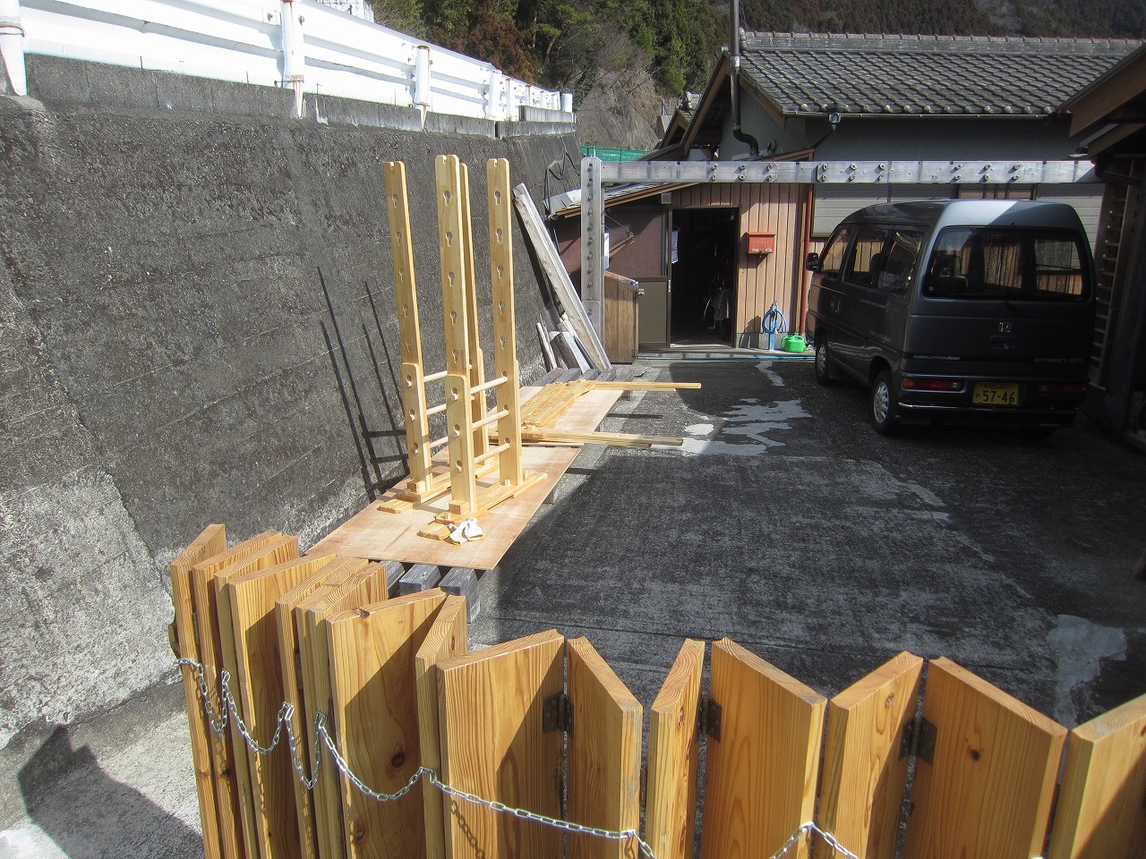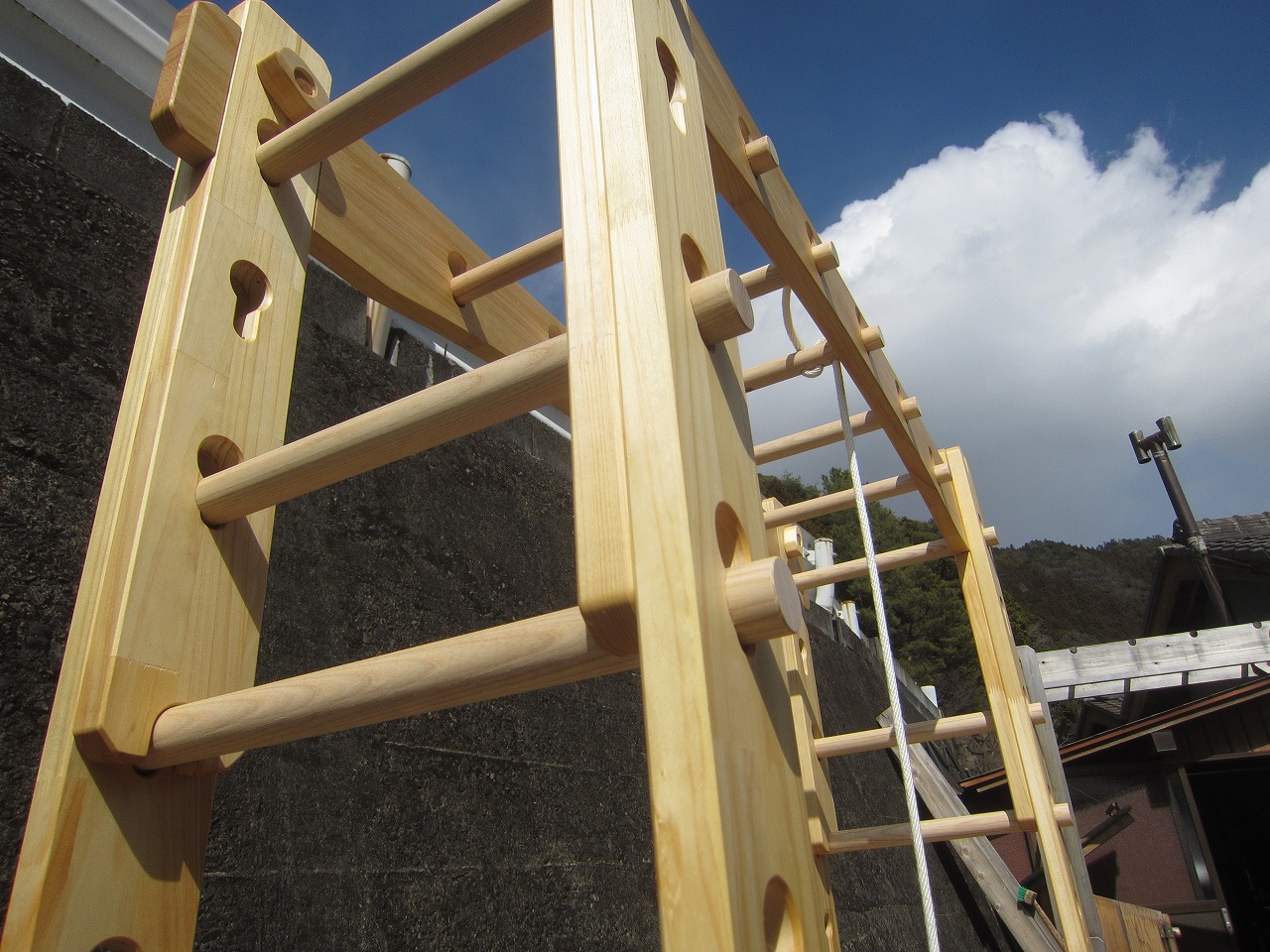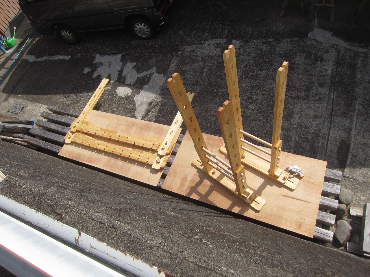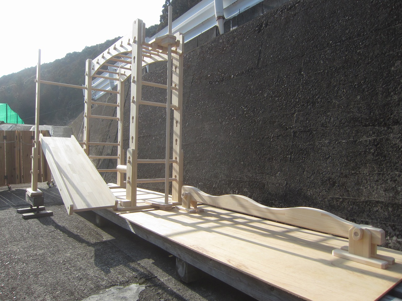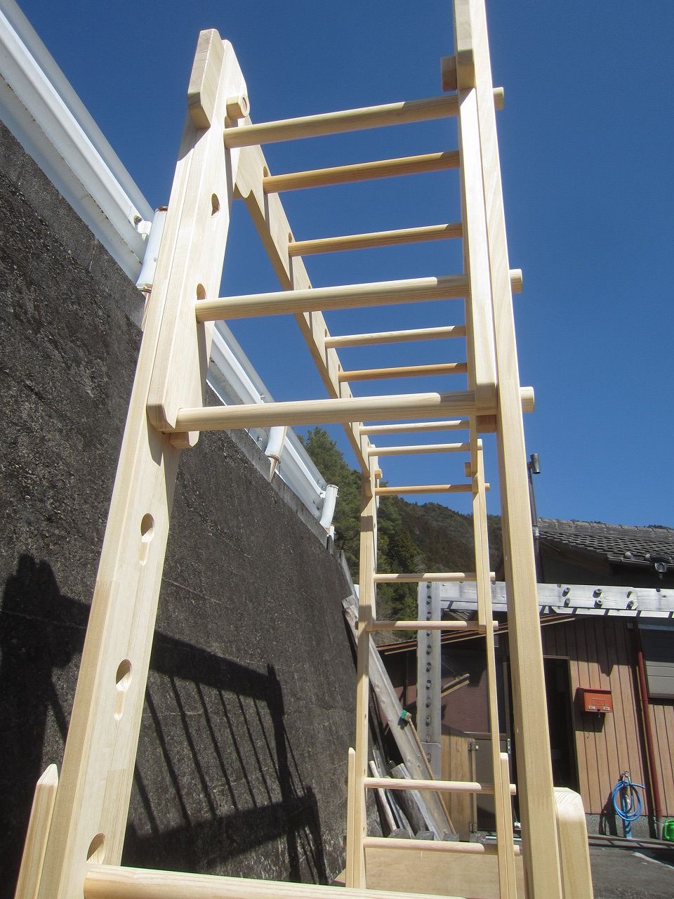 (組み立て案内)①土台用丸棒を使い、土台に柱を立てる。②任意の高さに柱用丸棒を取り付け、梁を組み込む。③木製ナットを締め付け、にぎり棒を取り付けて完成。※柱の丸棒穴に付いたへこみ跡を再利用すると組みやすいです。