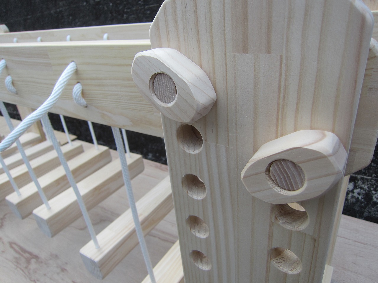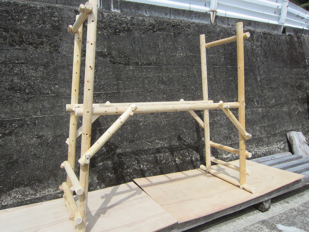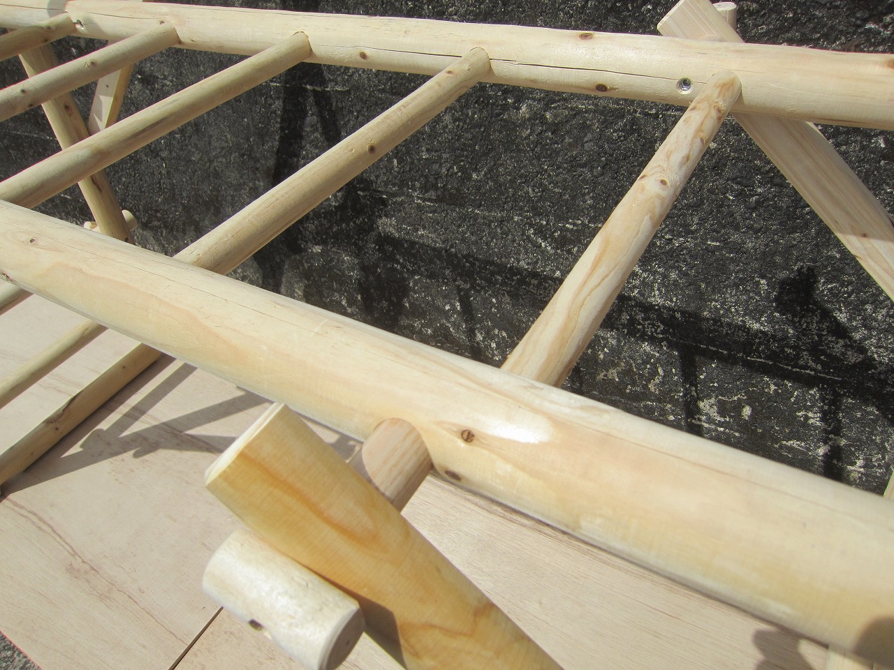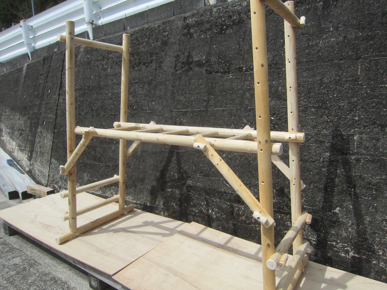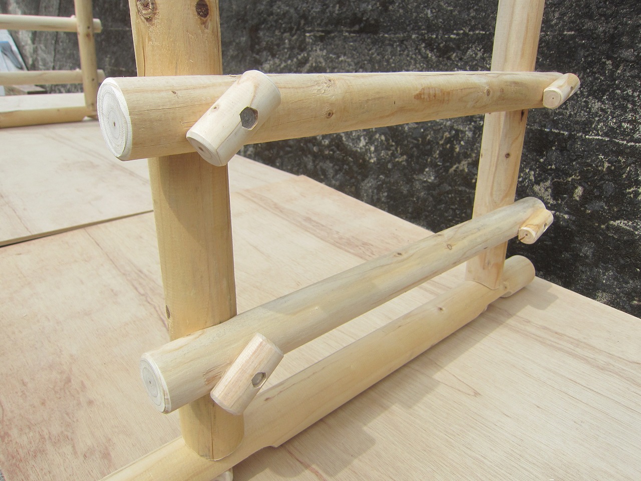 (1)梁に小柱を取り付け、木製ボルト(小)で固定し、2台の梁ユニットを組みます。