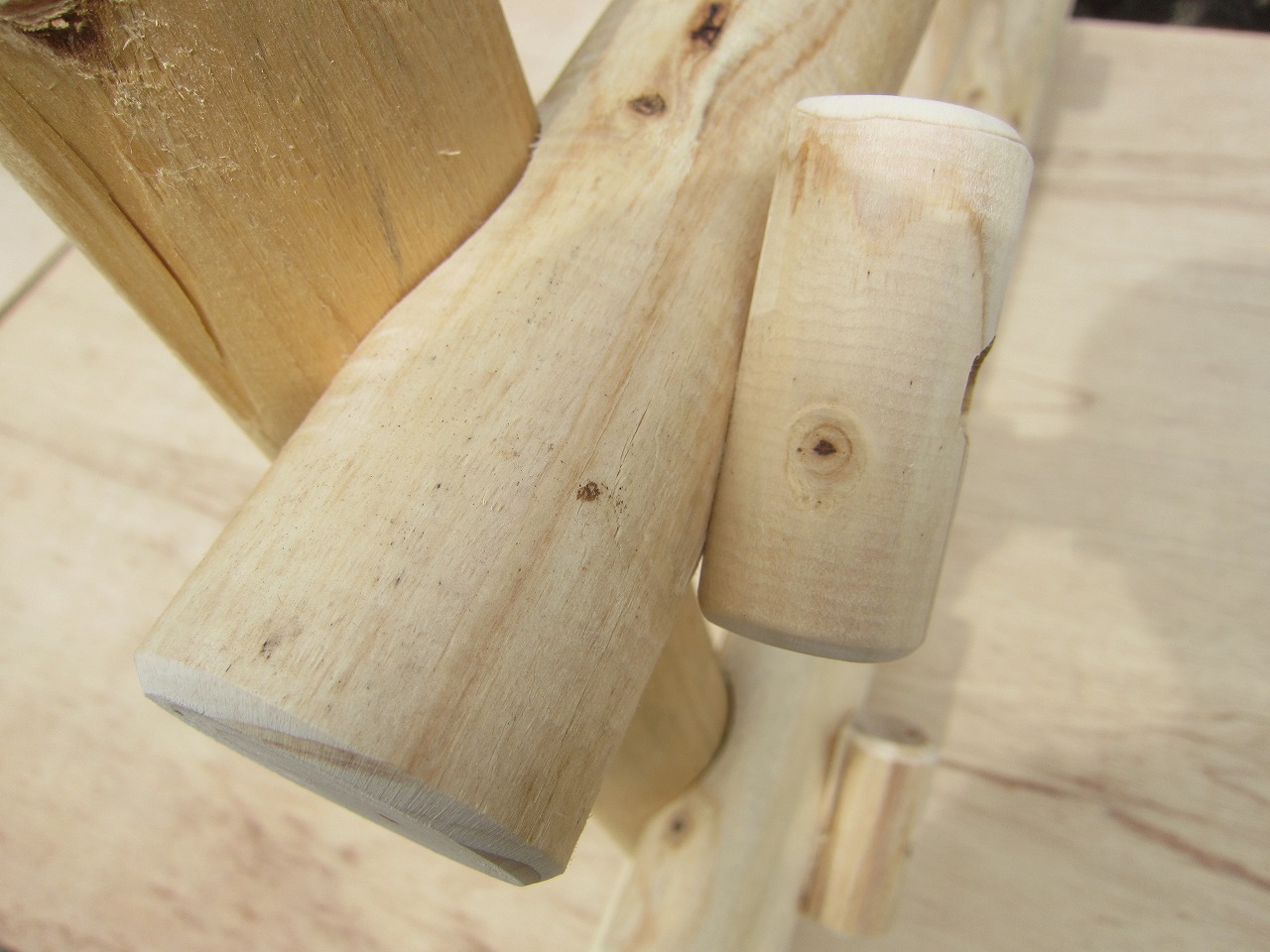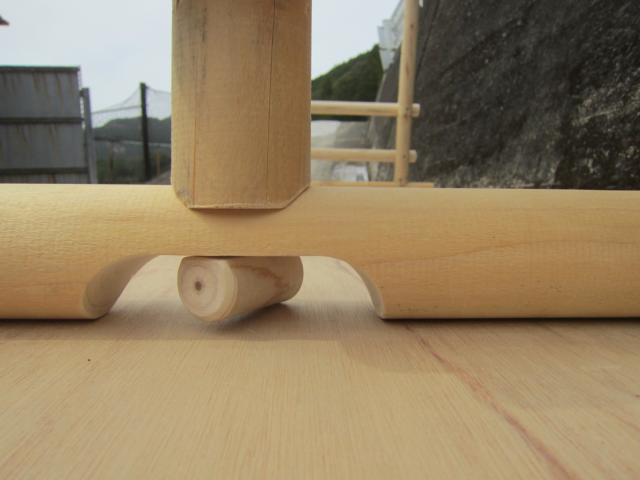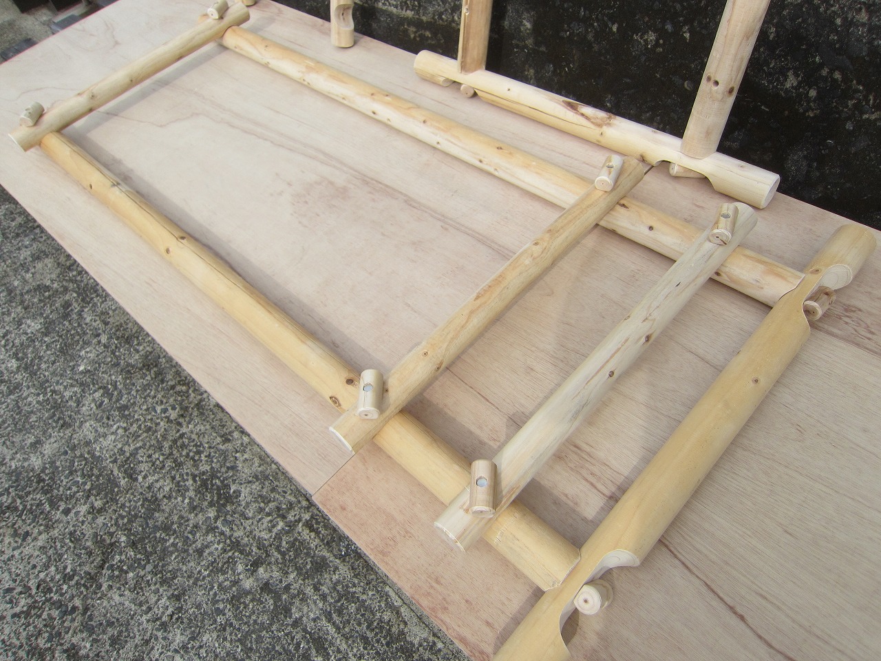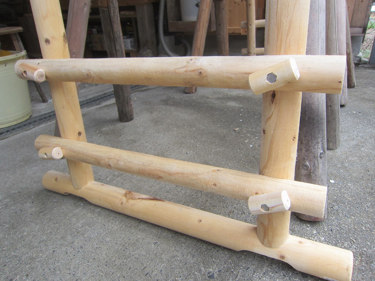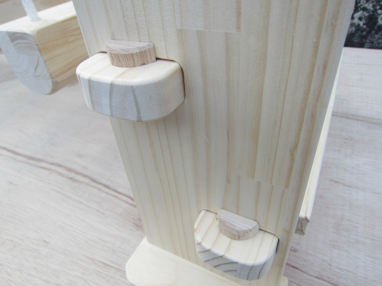 (1)梁に小柱を取り付け、木製ボルト(小)で固定し、2台の梁ユニットを組みます。