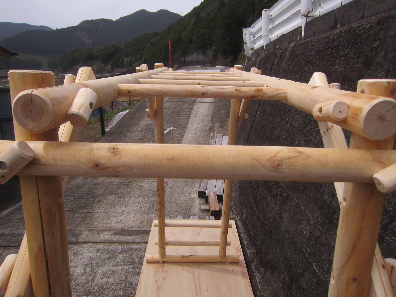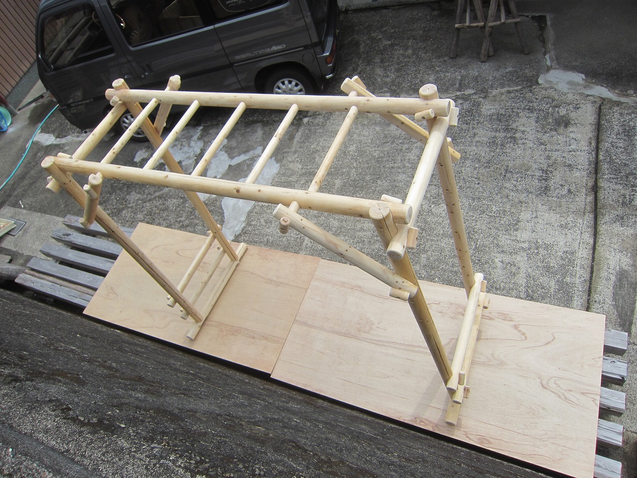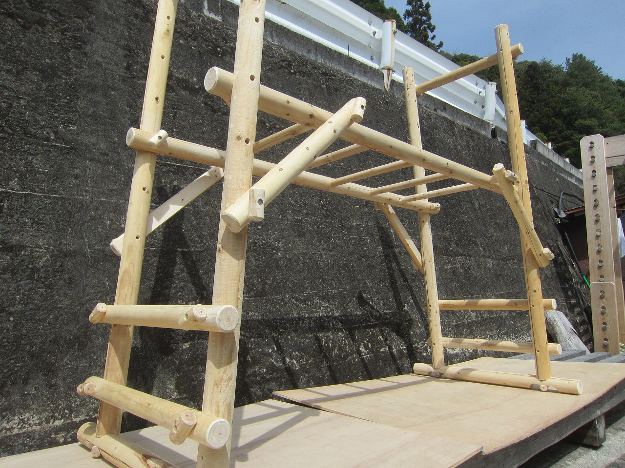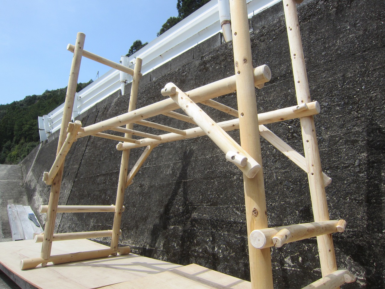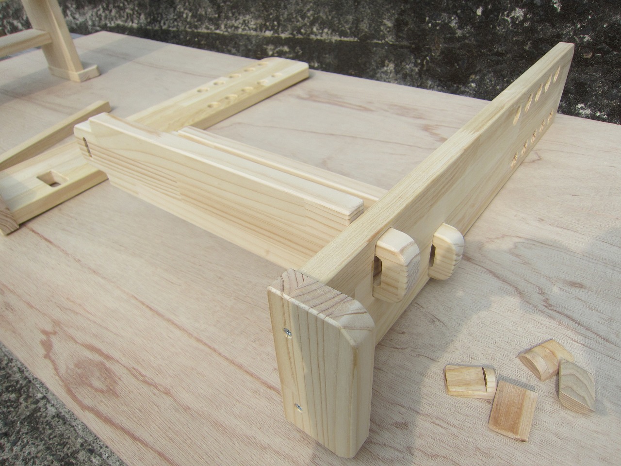 (1)梁に小柱を取り付け、木製ボルト(小)で固定し、2台の梁ユニットを組みます。