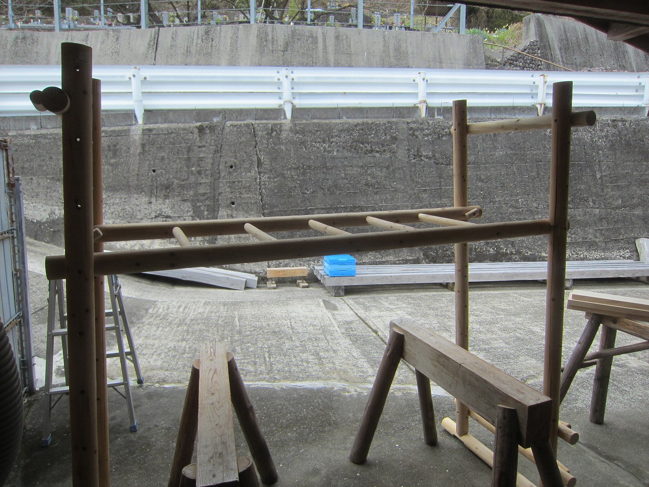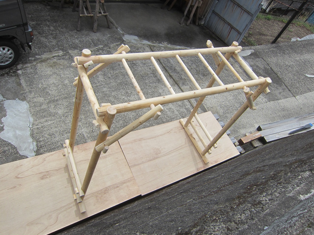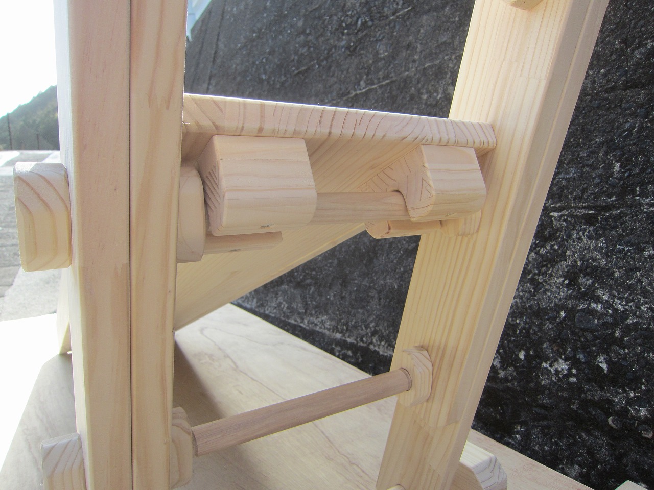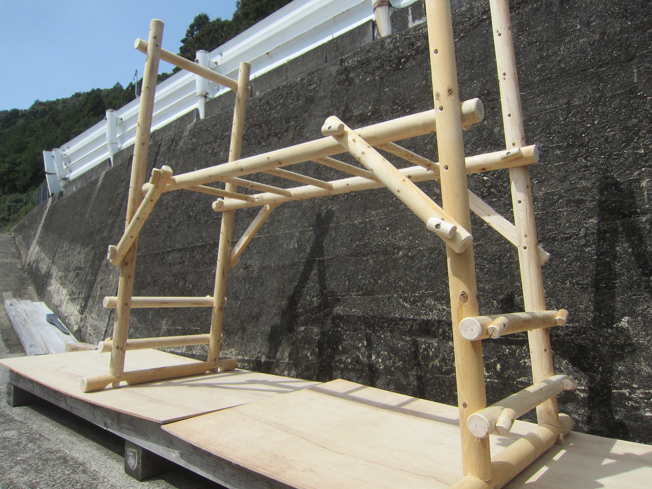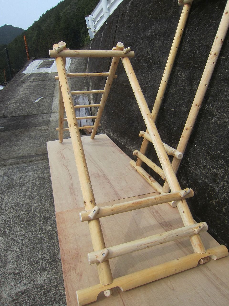 (1)梁に小柱を取り付け、木製ボルト(小)で固定し、2台の梁ユニットを組みます。