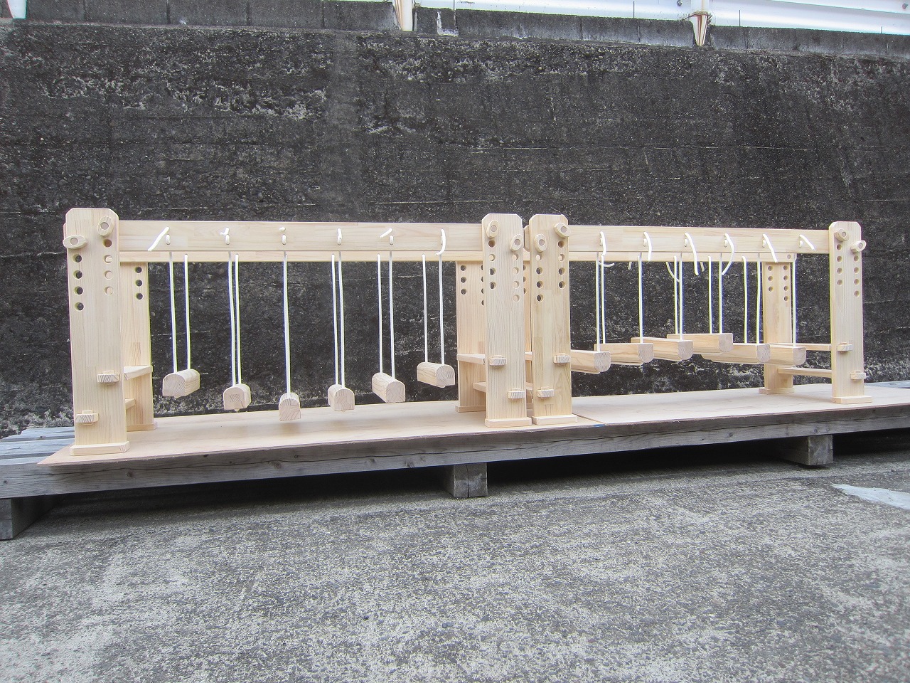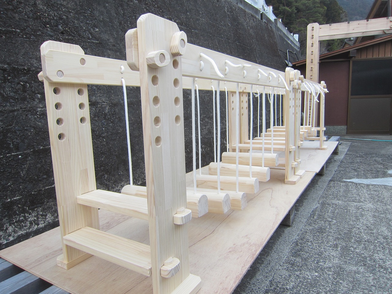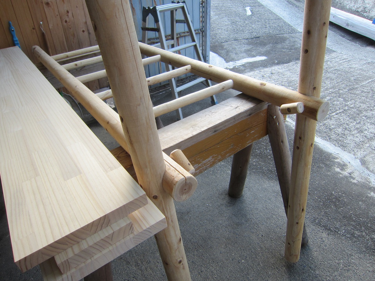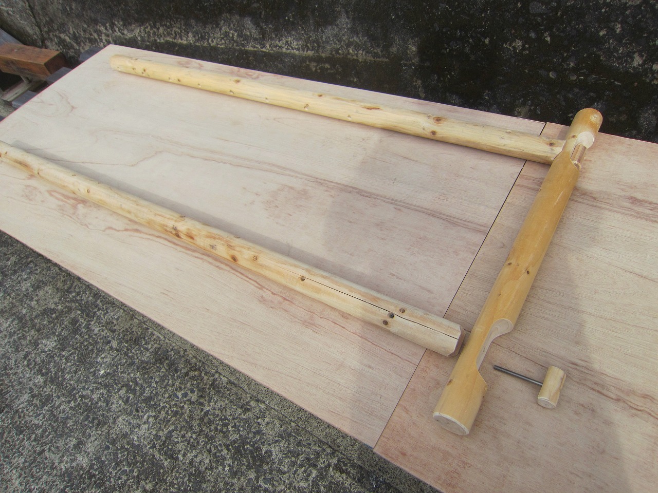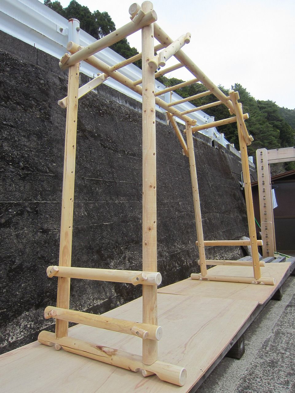 (1)梁に小柱を取り付け、木製ボルト(小)で固定し、2台の梁ユニットを組みます。