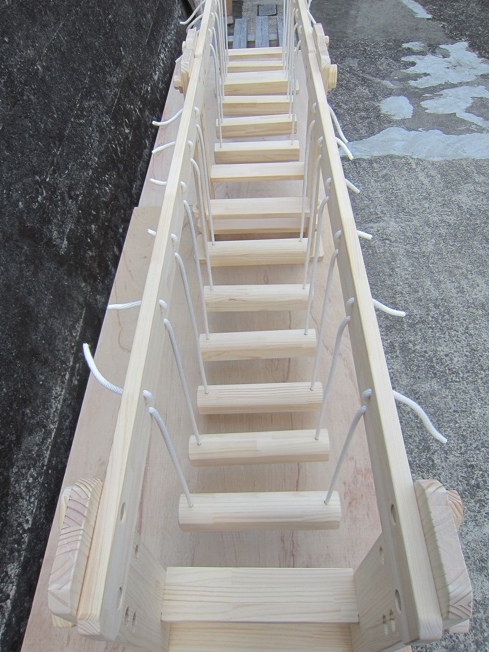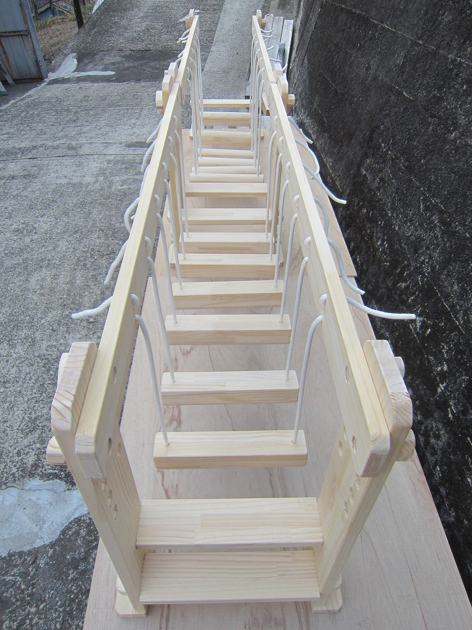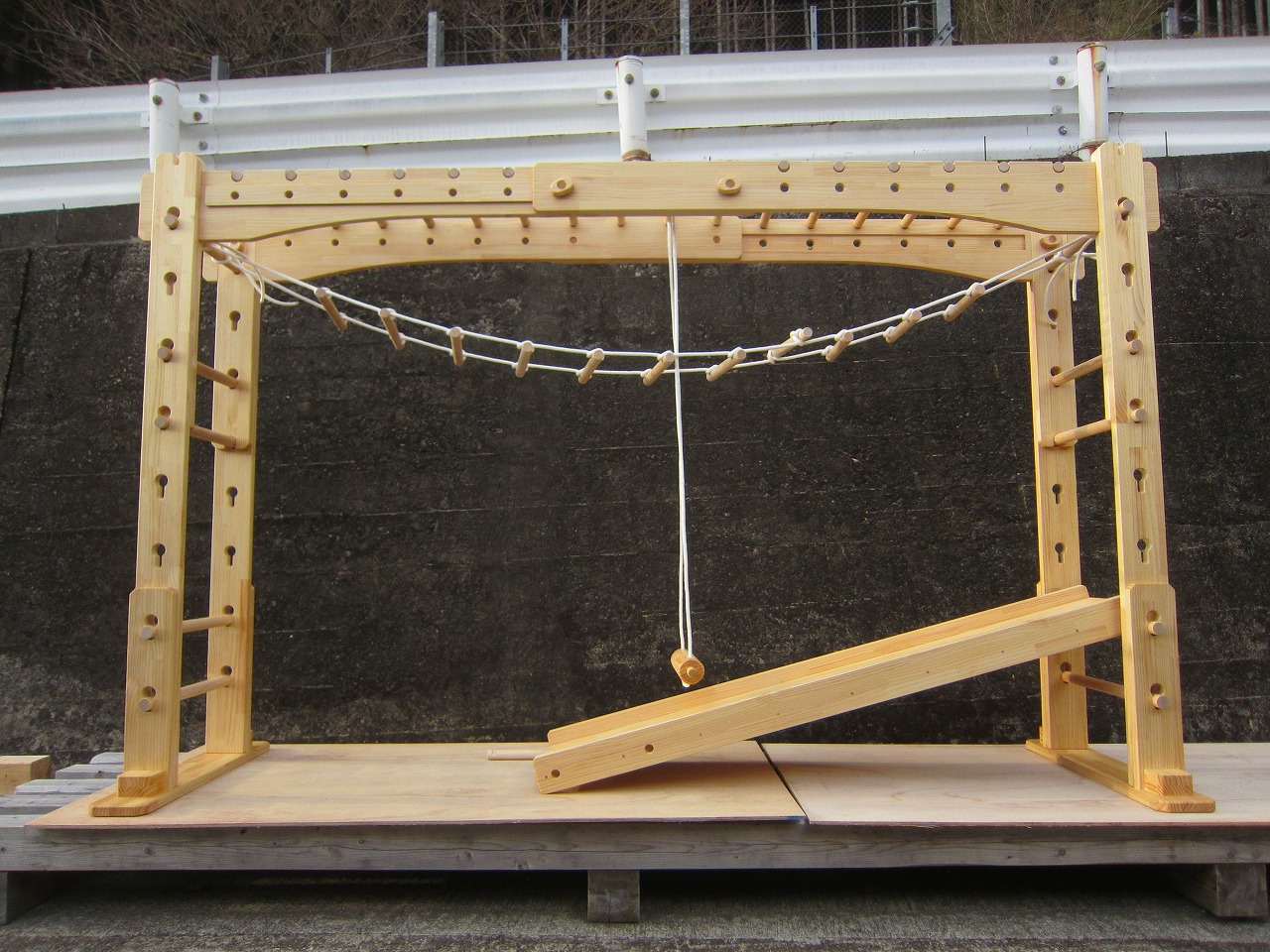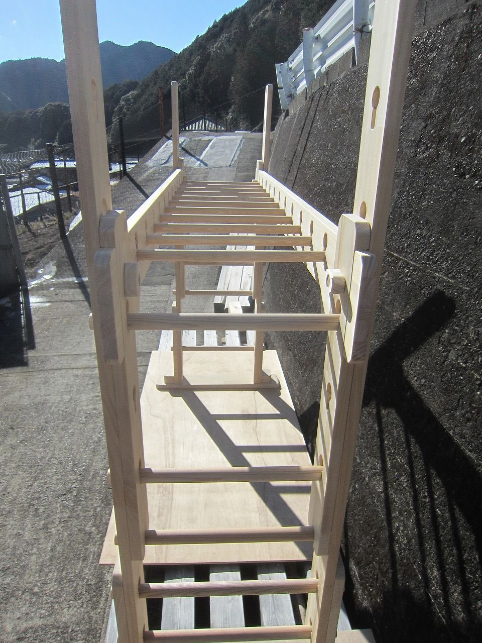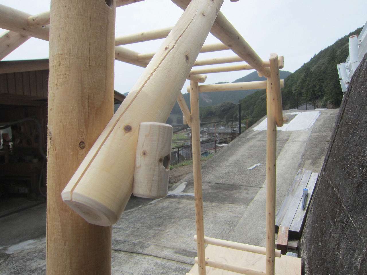 (1)梁に小柱を取り付け、木製ボルト(小)で固定し、2台の梁ユニットを組みます。