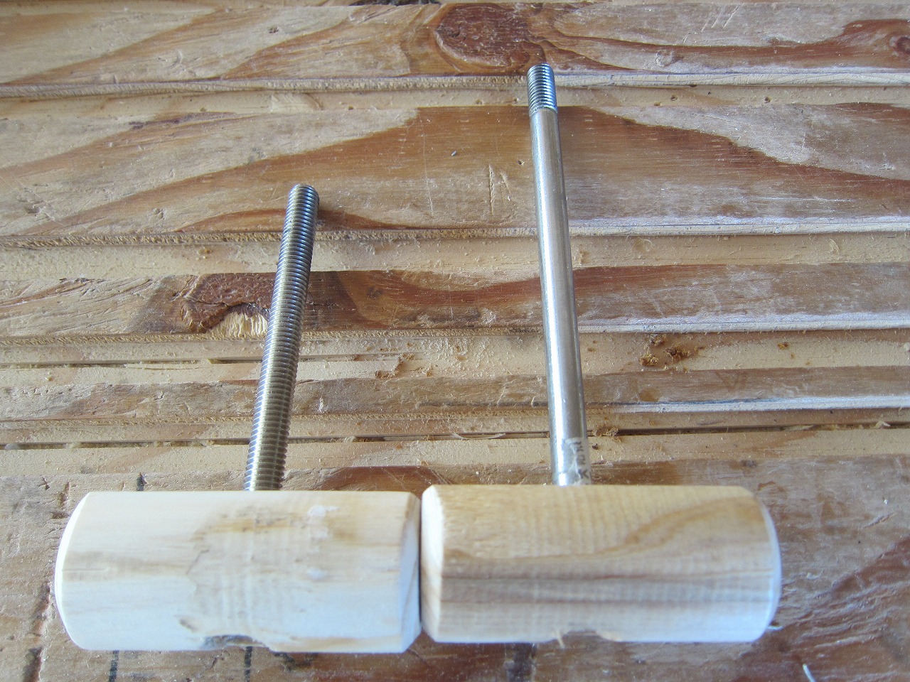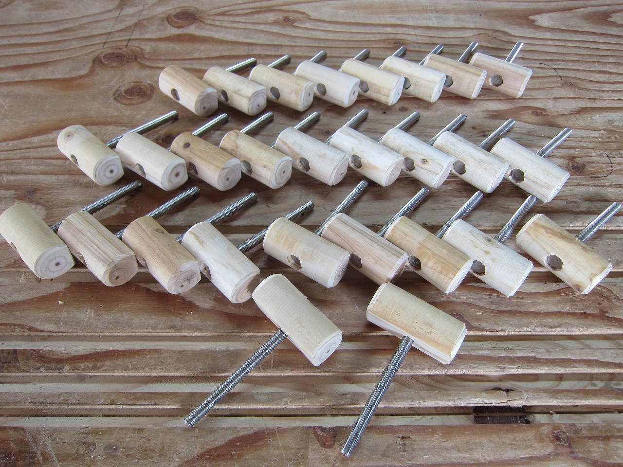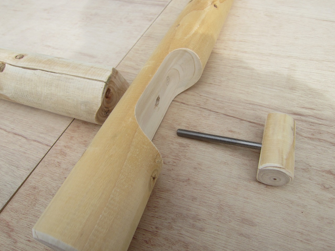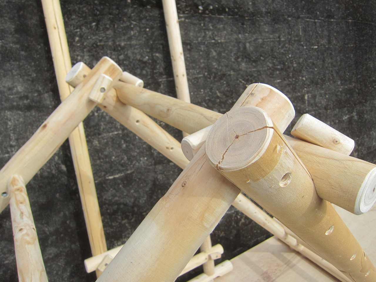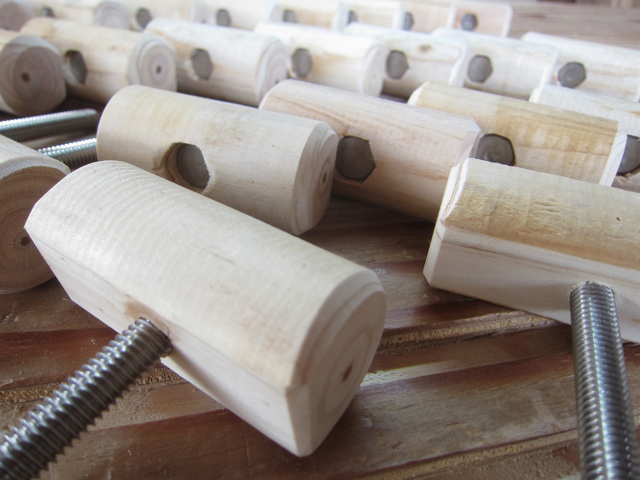 (4)梁ユニットを任意の長さに設定し、木製ボルト(大)を互いの梁の先端のねじ穴にしっかりと締め付け、梁ユニット同士を固定します。