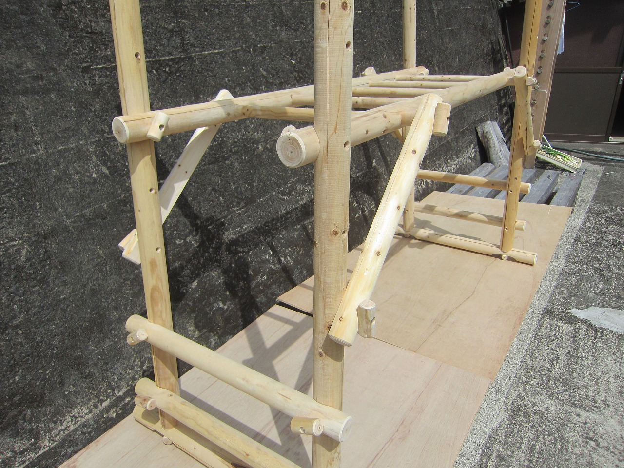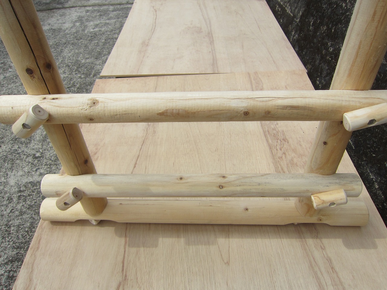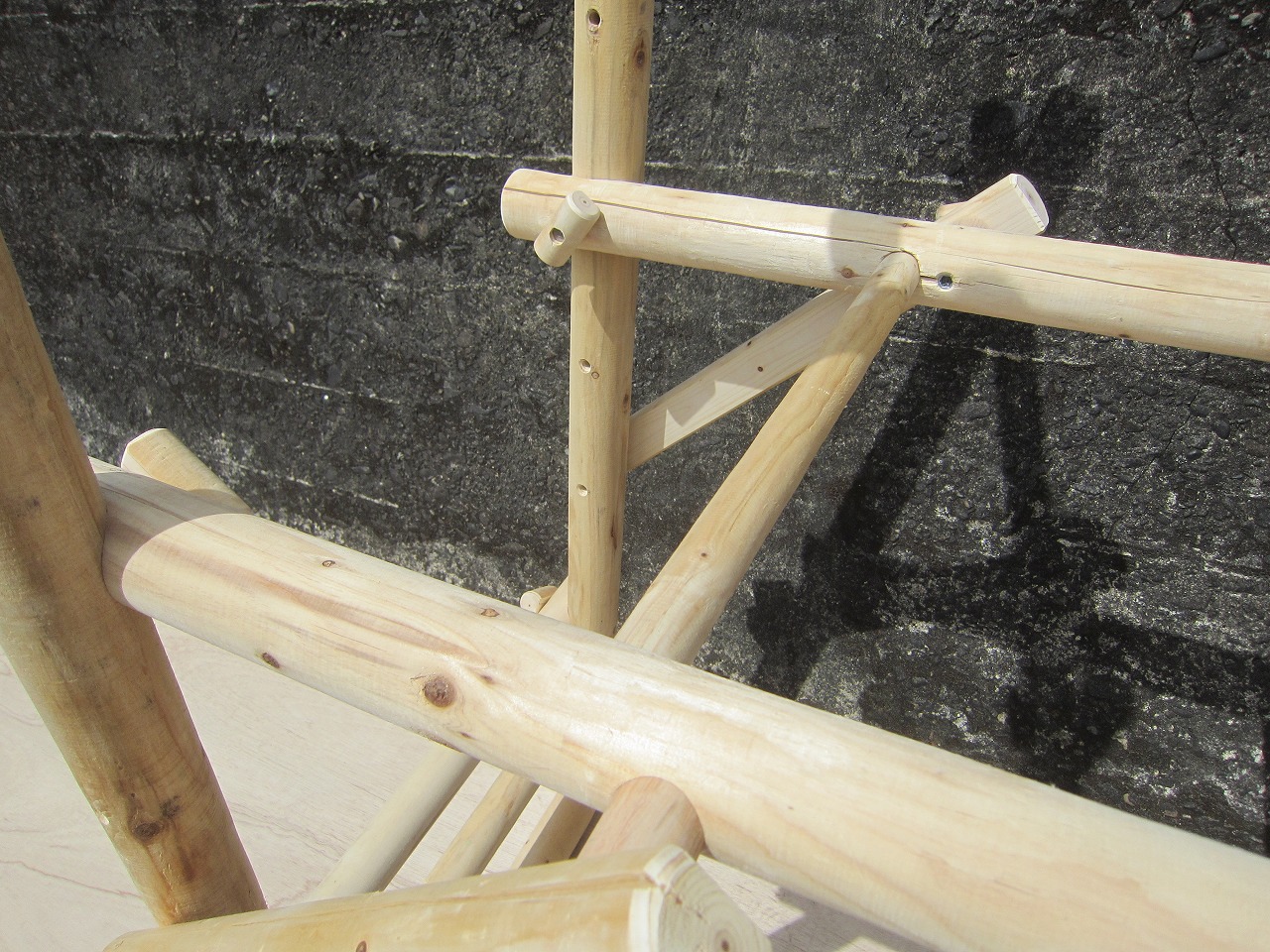 (3)柱ユニットの任意の位置に柱用丸棒を取り付け、その上に(1)で出来た梁ユニットを乗せ、梁~小柱用丸棒で固定します。