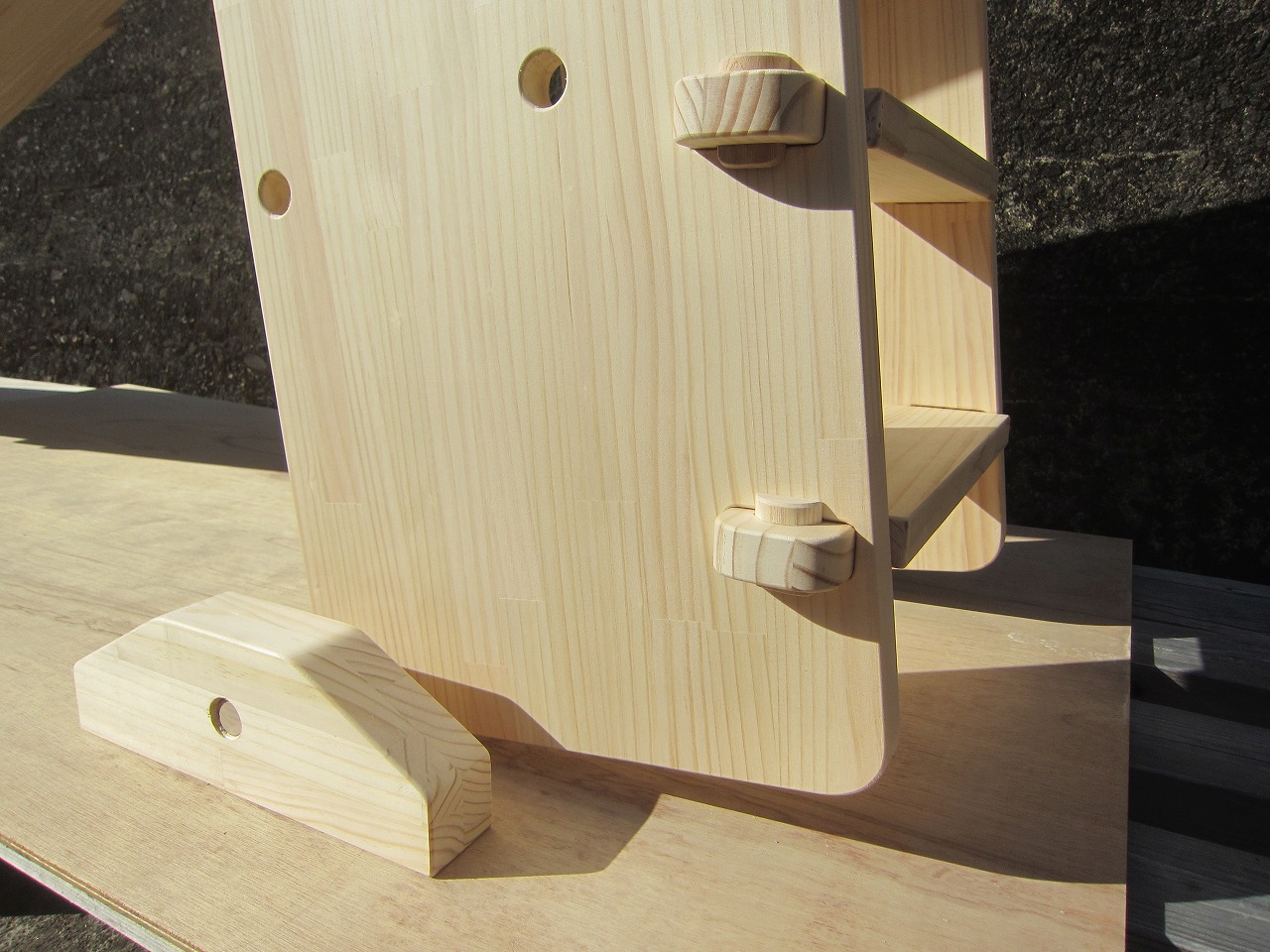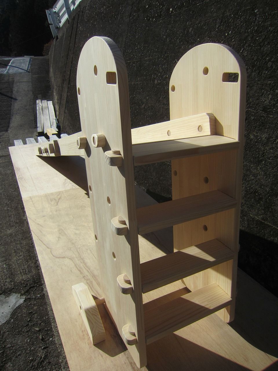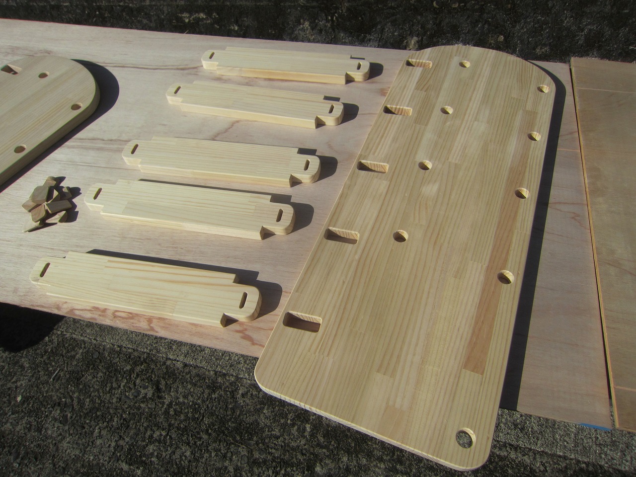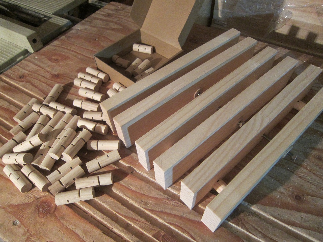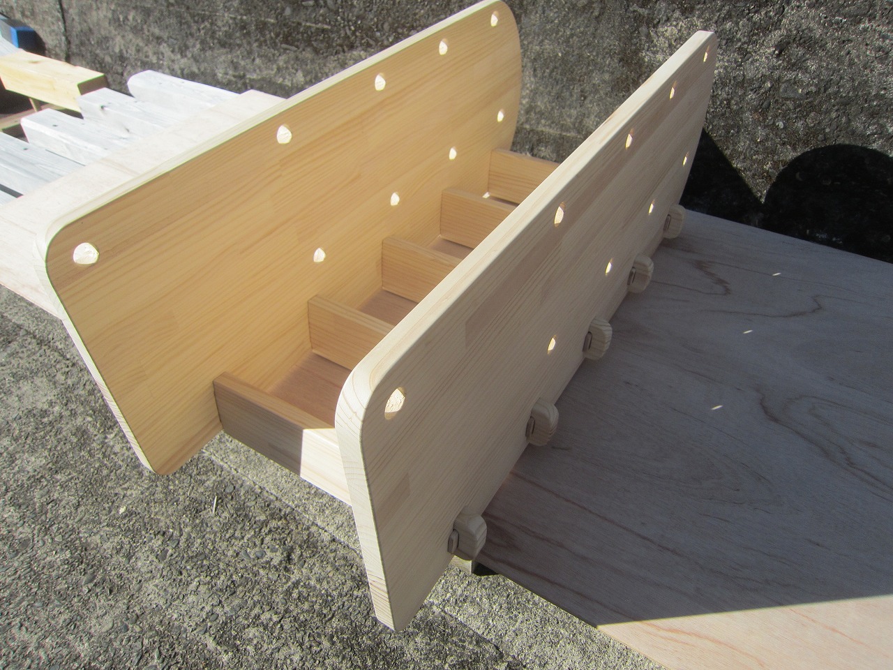 ①まずは、コミ栓を使って側板に踏み板を取り付け、ベースを組み上げます。